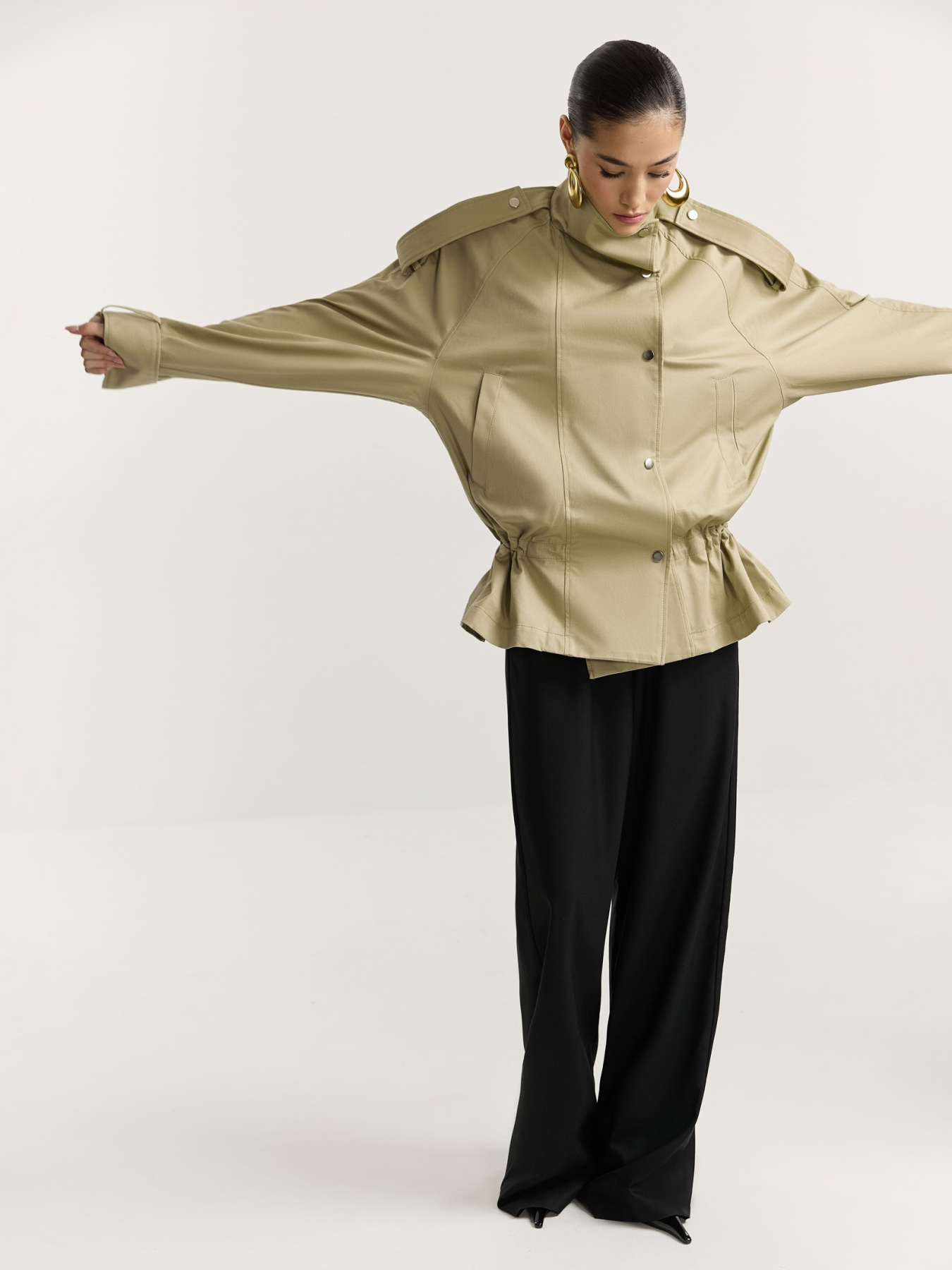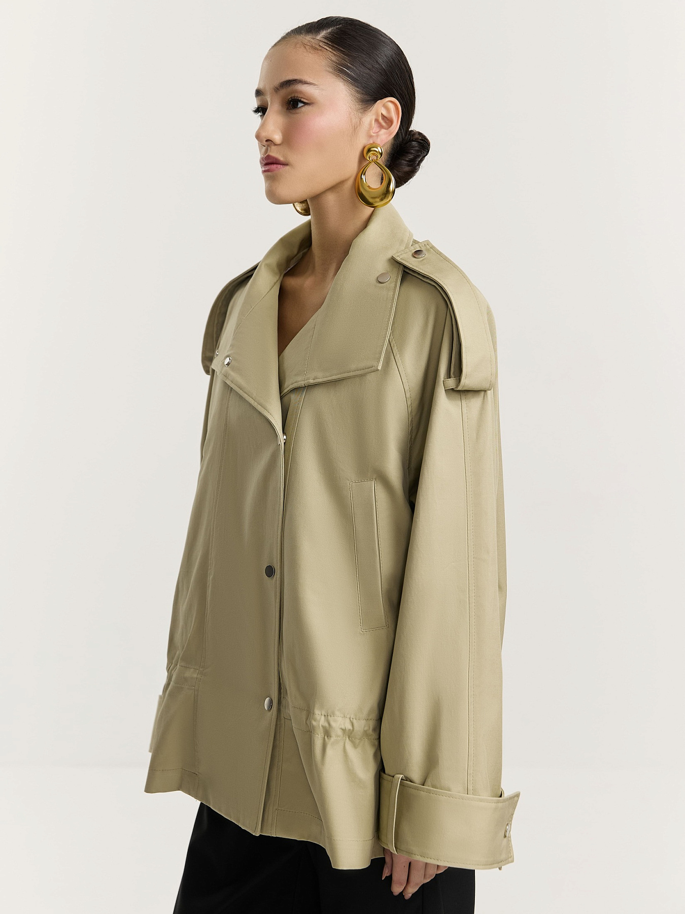 Свободный крой с рукавом реглан, глубокой проймой и широким рукавом создает выразительный оверсайз силуэт. Узкая двубортная застежка на металлические кнопки. На полочке вертикально расположены два карманы в листочку.