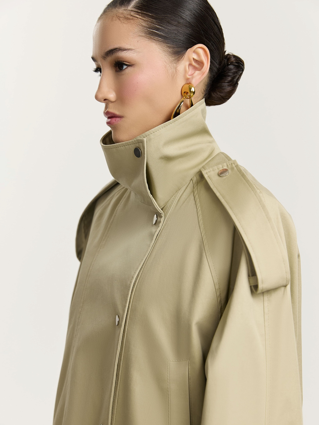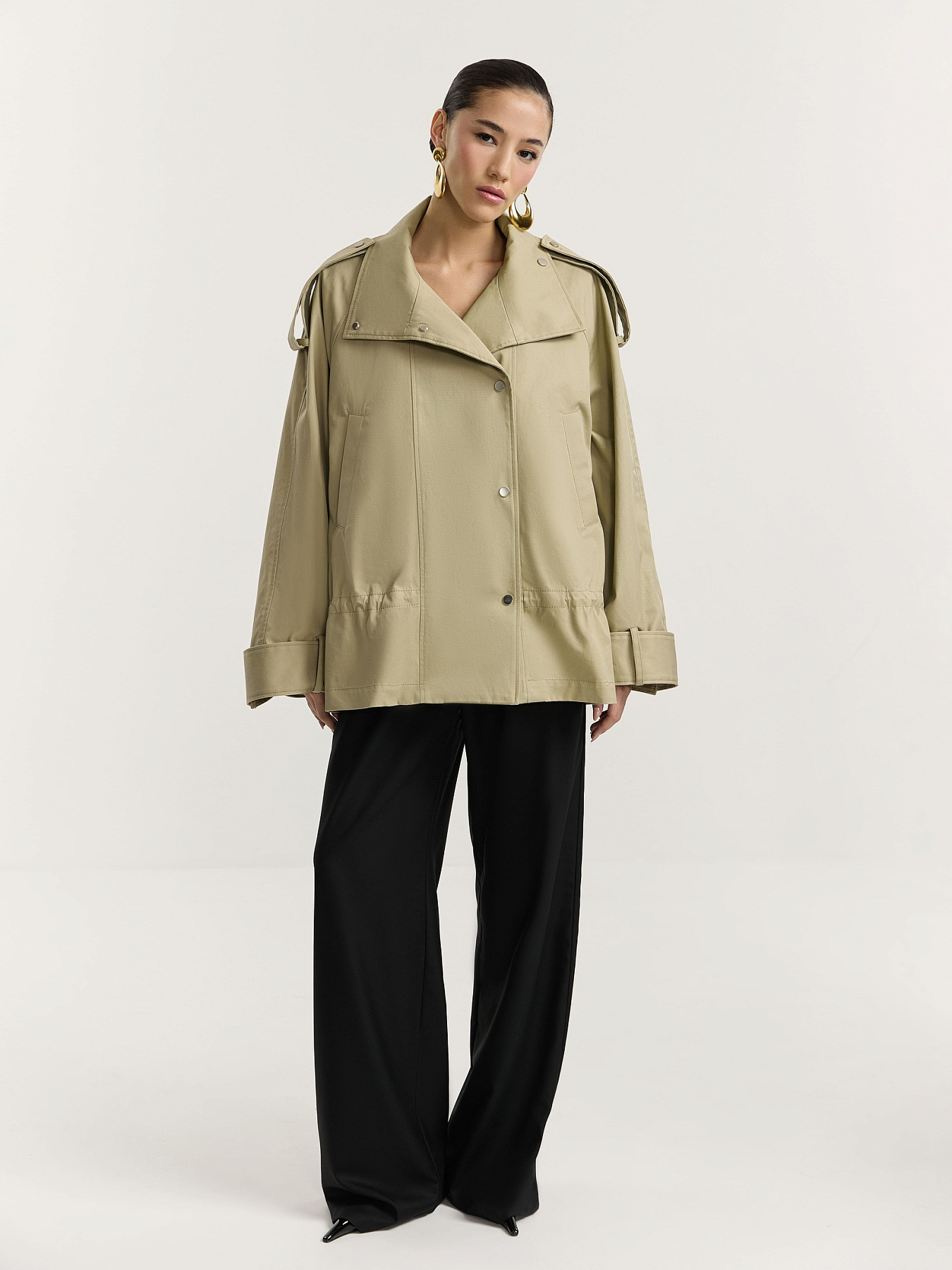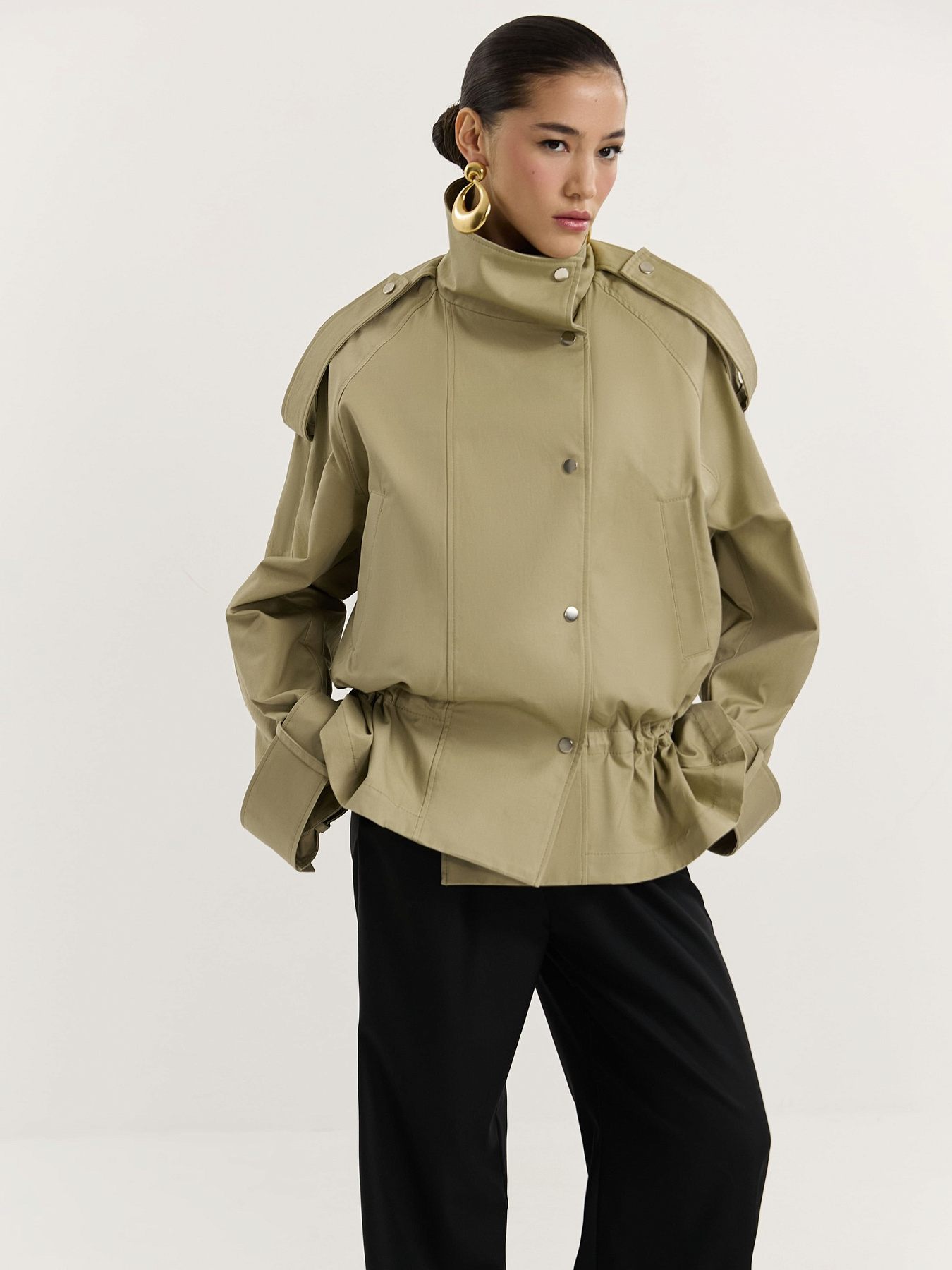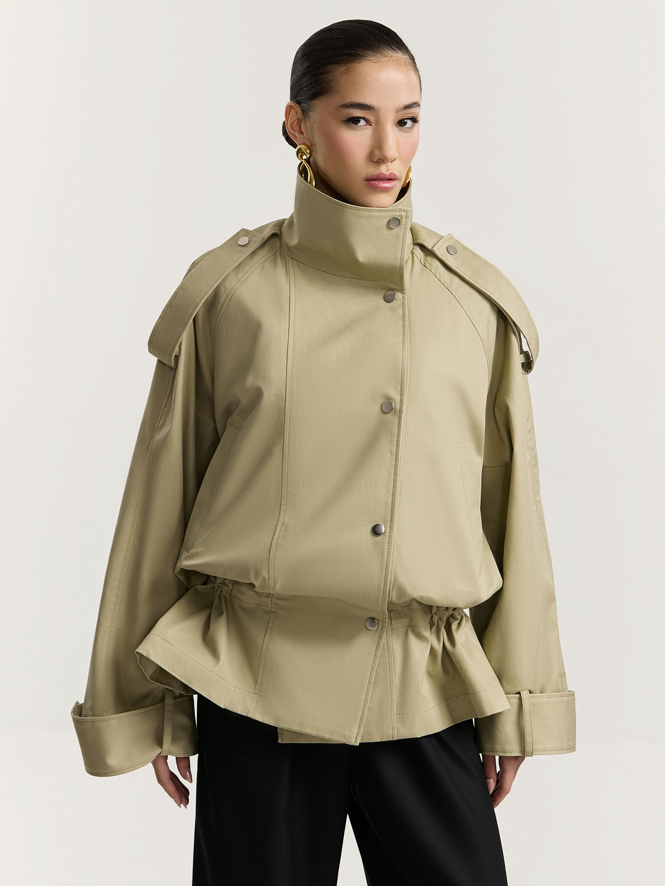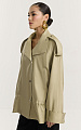 По рукавам, плечевым швам и стойке проходят широкие паты на металлических кнопках, добавляющие изделию графичности.