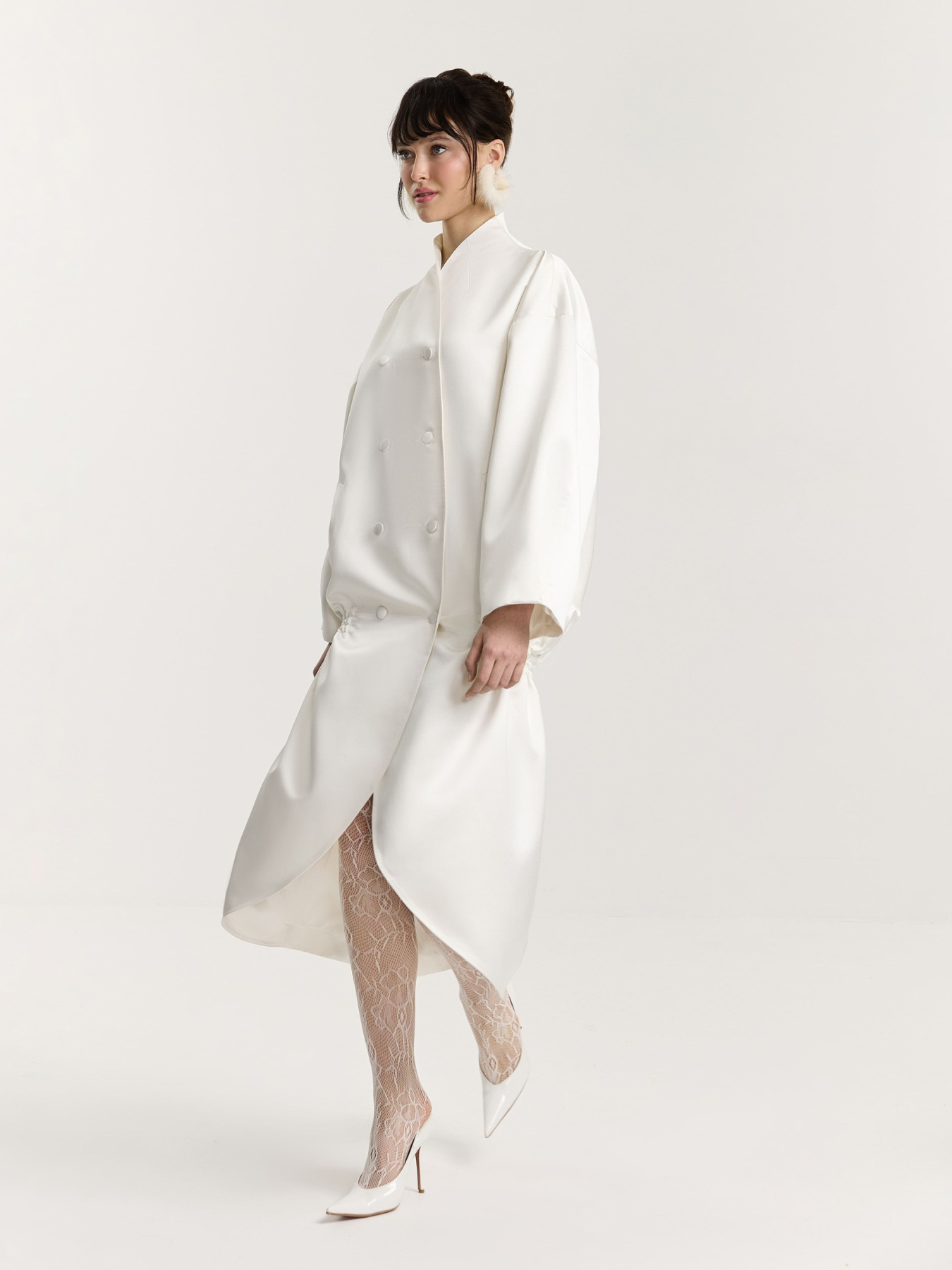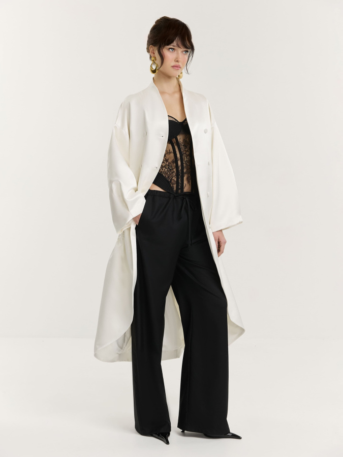 Плащ объемного силуэта из итальянского плотного атласа в молочном оттенке. О-образная форма выстроена так, чтобы ткань держала линию и при этом оставалась пластичной в движении.