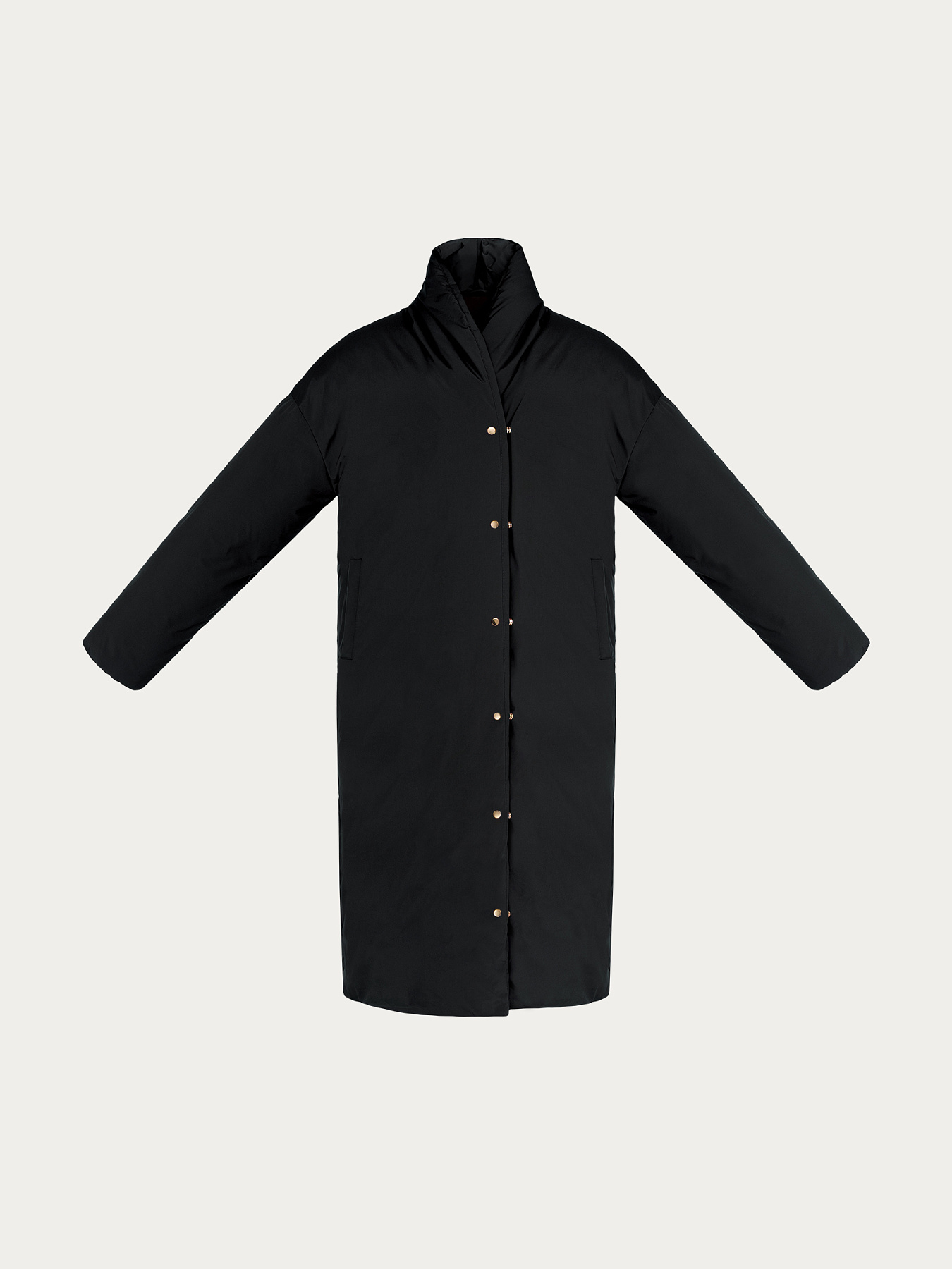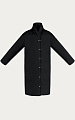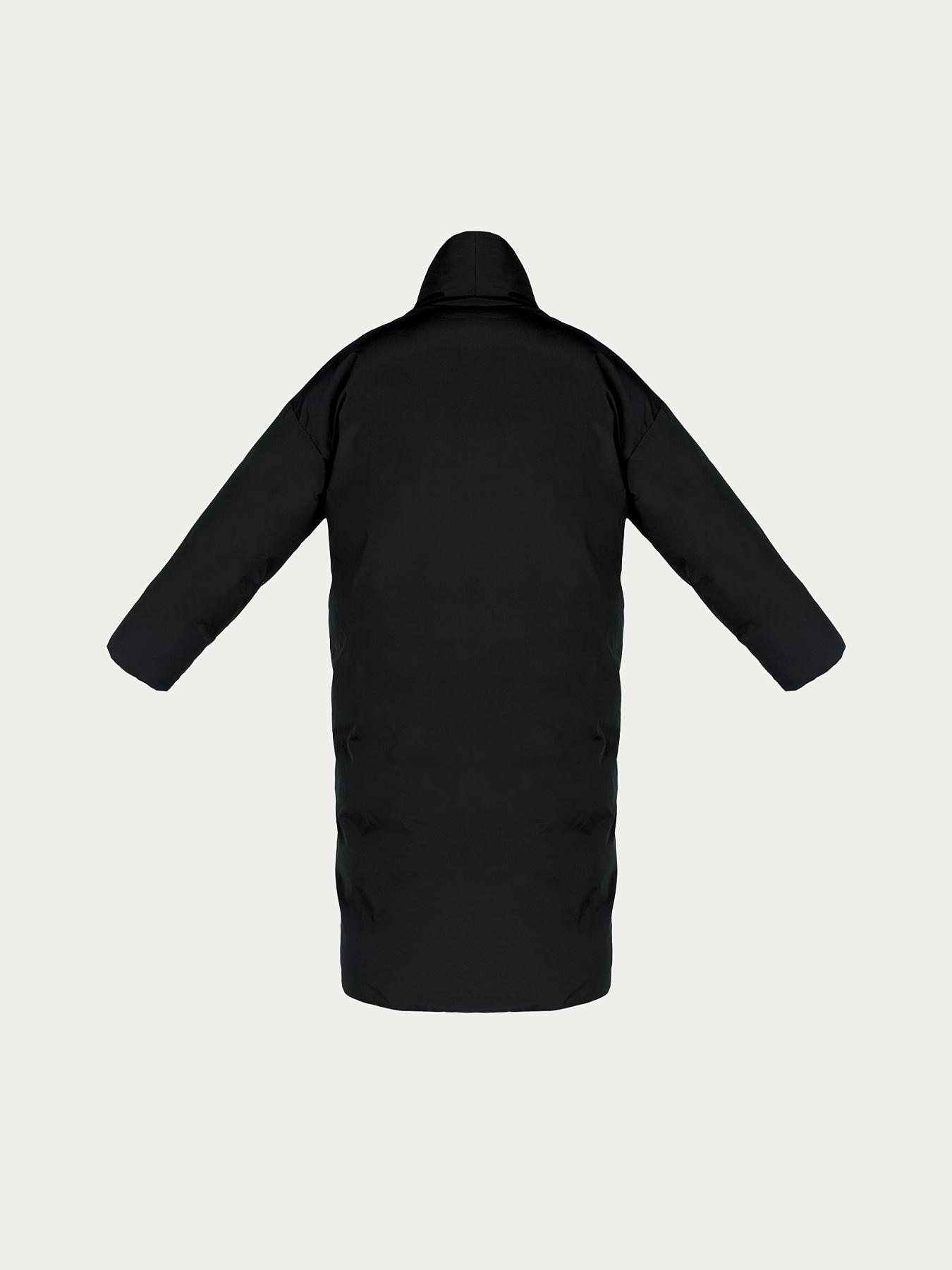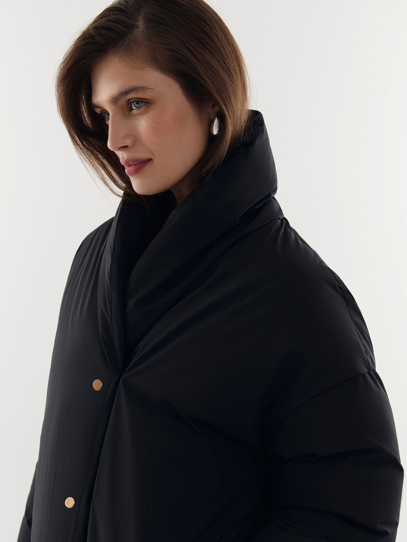 Комфортная посадка со спущенной линией плеча и мягкий шалевый воротник, переходящий в стойку, создают обволакивающий силуэт. Воротник фиксируется у горловины с помощью скрытой магнитной кнопки — дополнительная защита от ветра и холода.