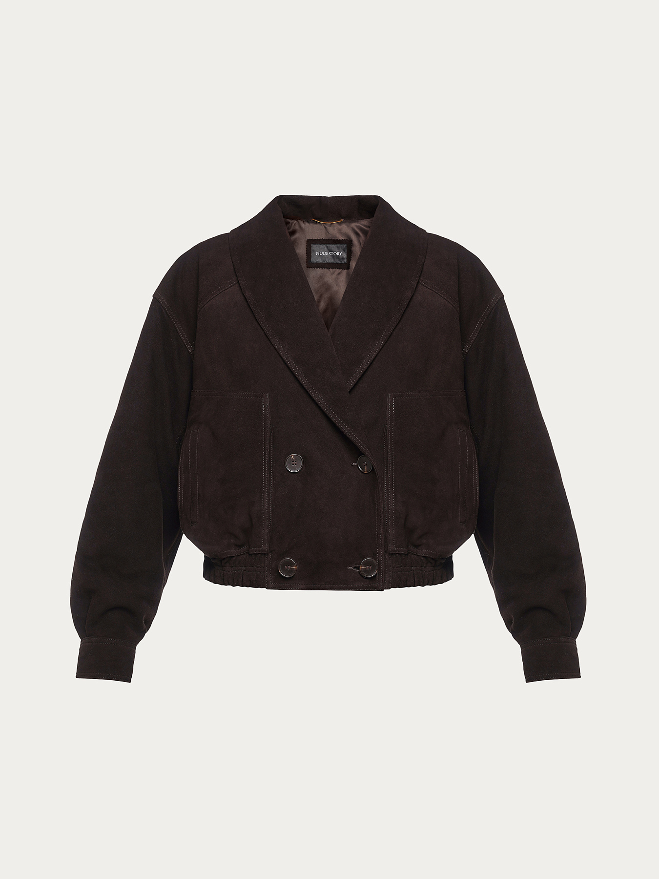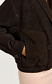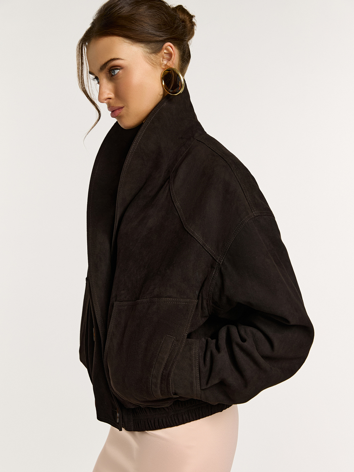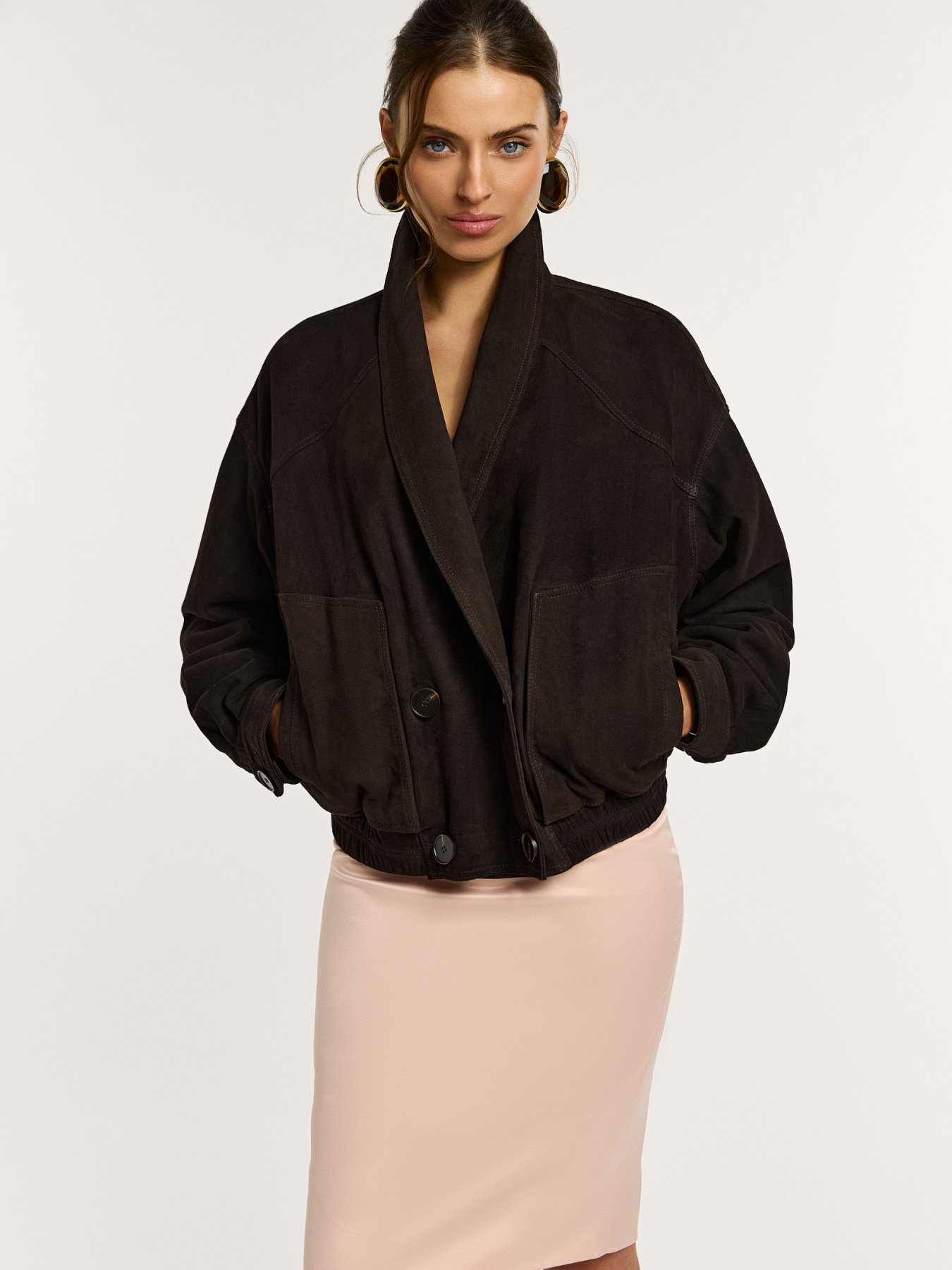 Утепленная куртка из натуральной овчинной замши в насыщенном коричневом оттенке. Шалевый воротник можно поднять и зафиксировать у горловины — внутри предусмотрена скрытая магнитная кнопка, которая защищает область шеи и груди в холодную погоду.