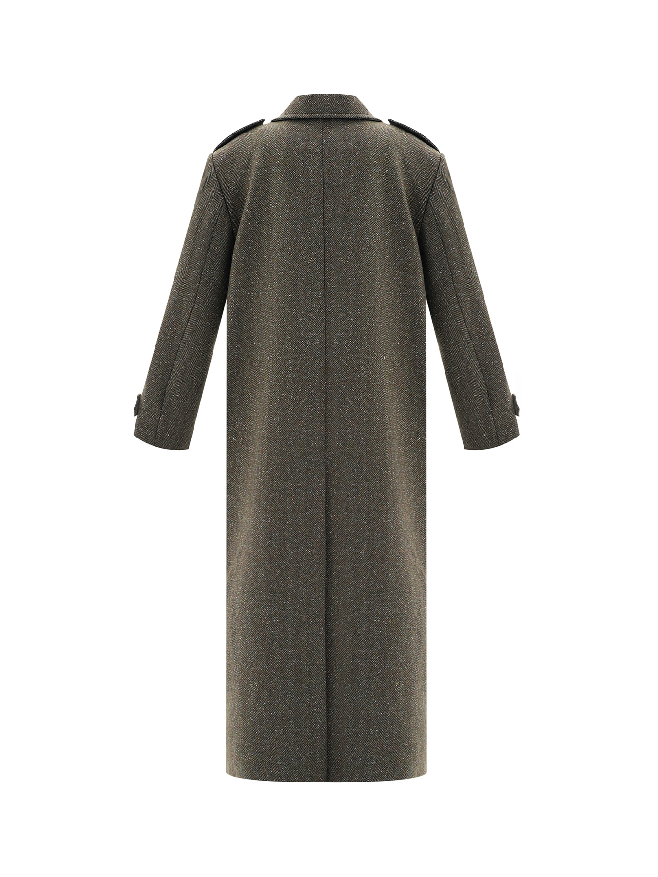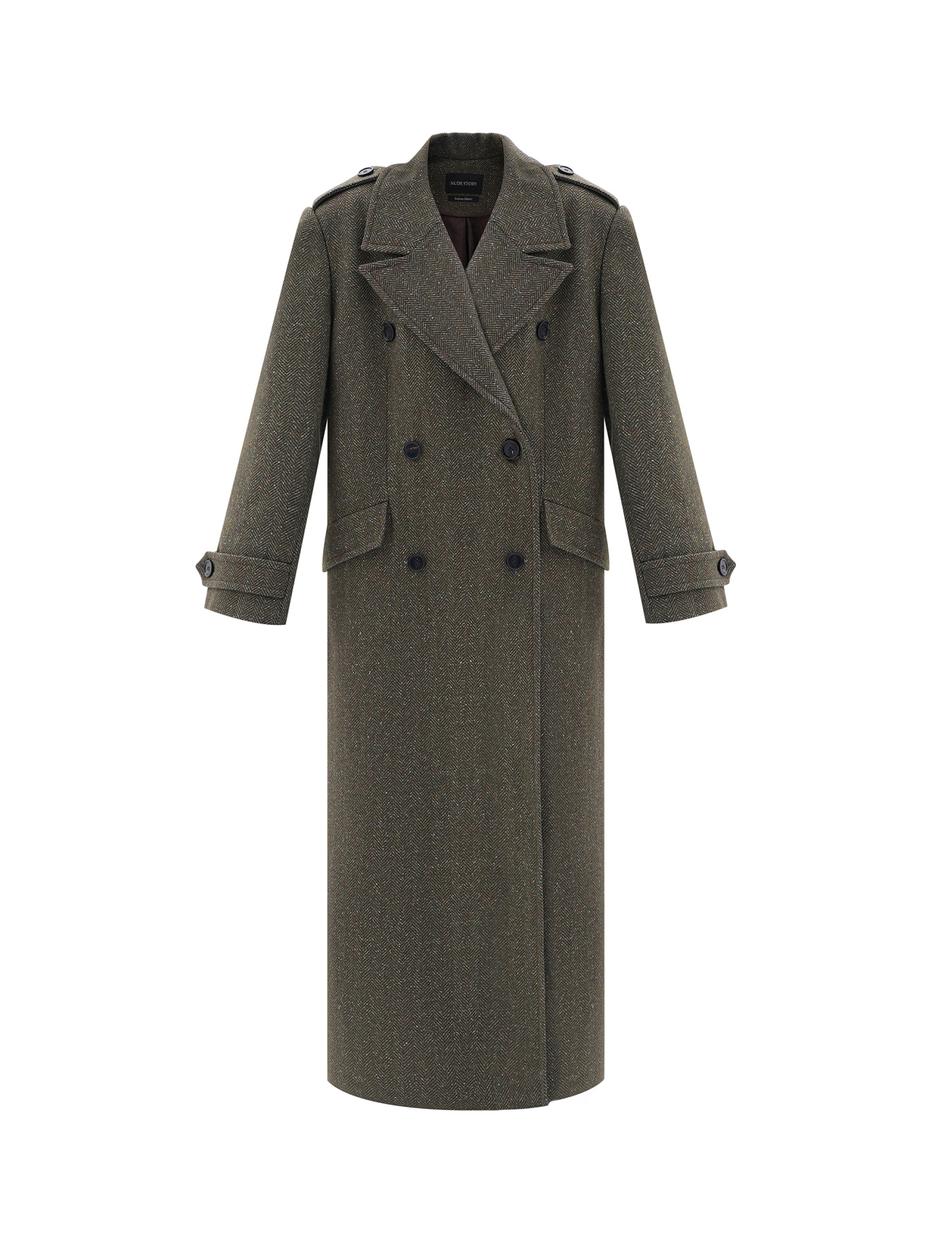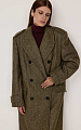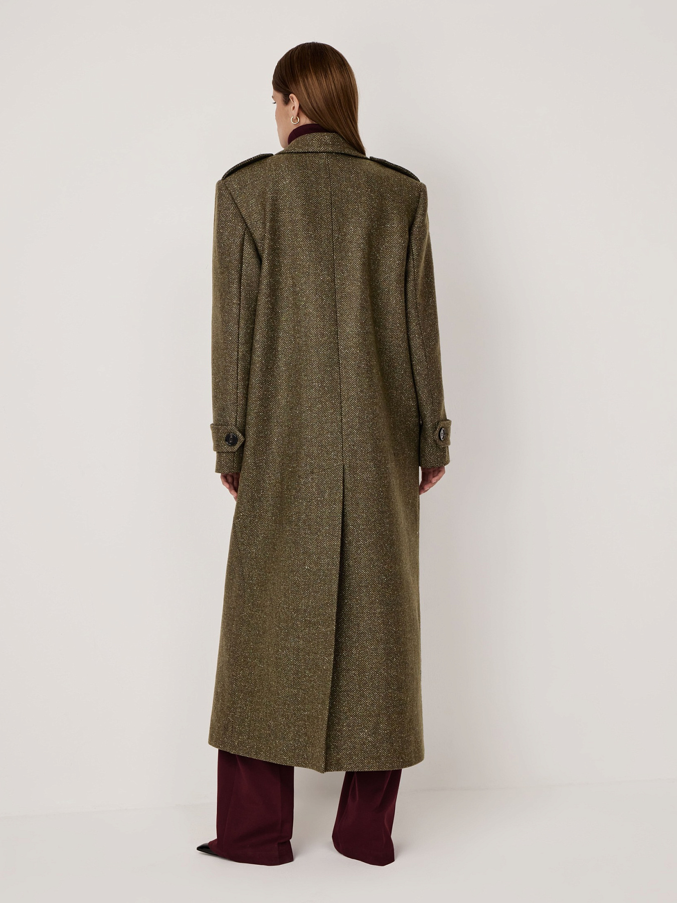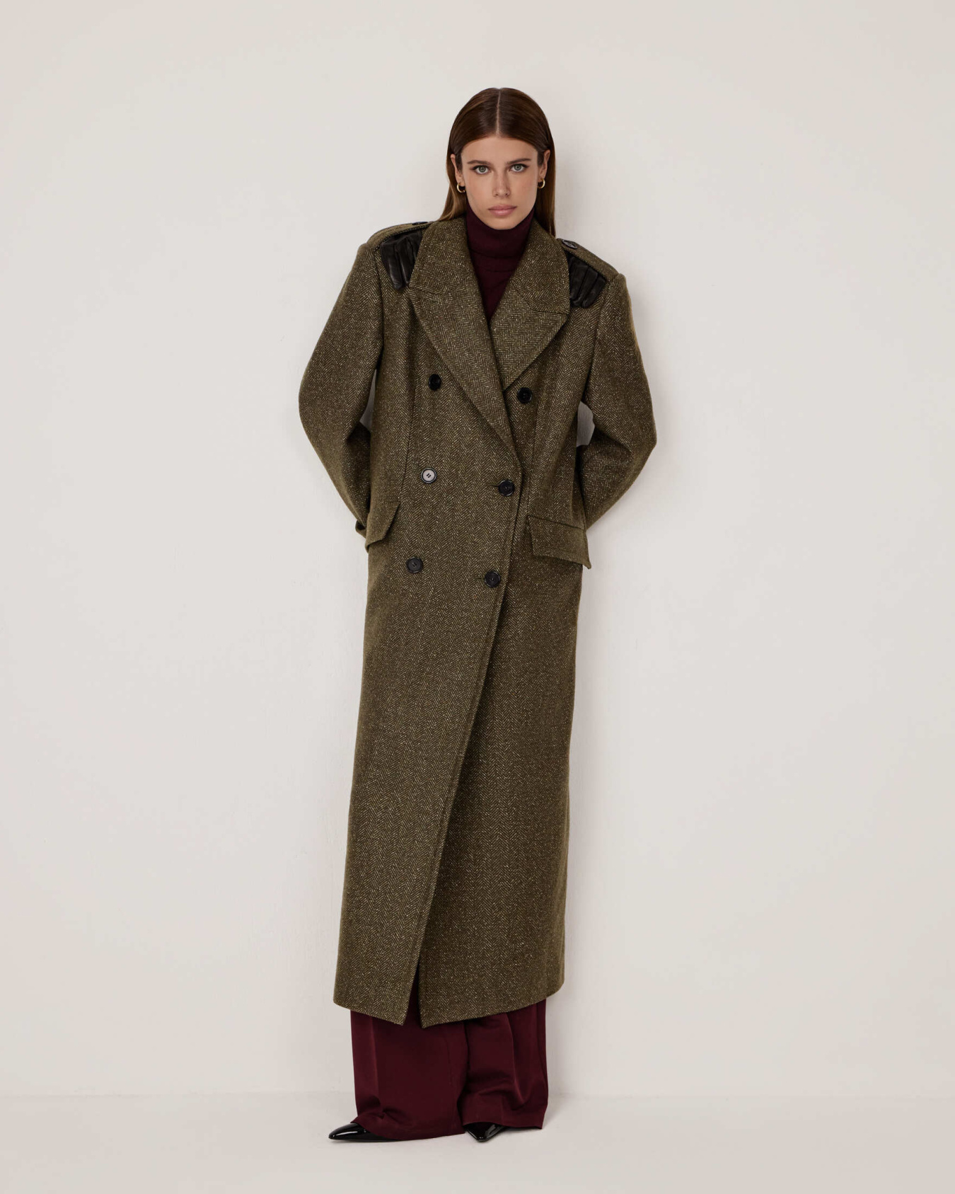 Олицетворение коллекции London Calling - двубортное пальто c объемными плечами из шерсти с узором Херрингбоун в глубоком зеленом оттенке.