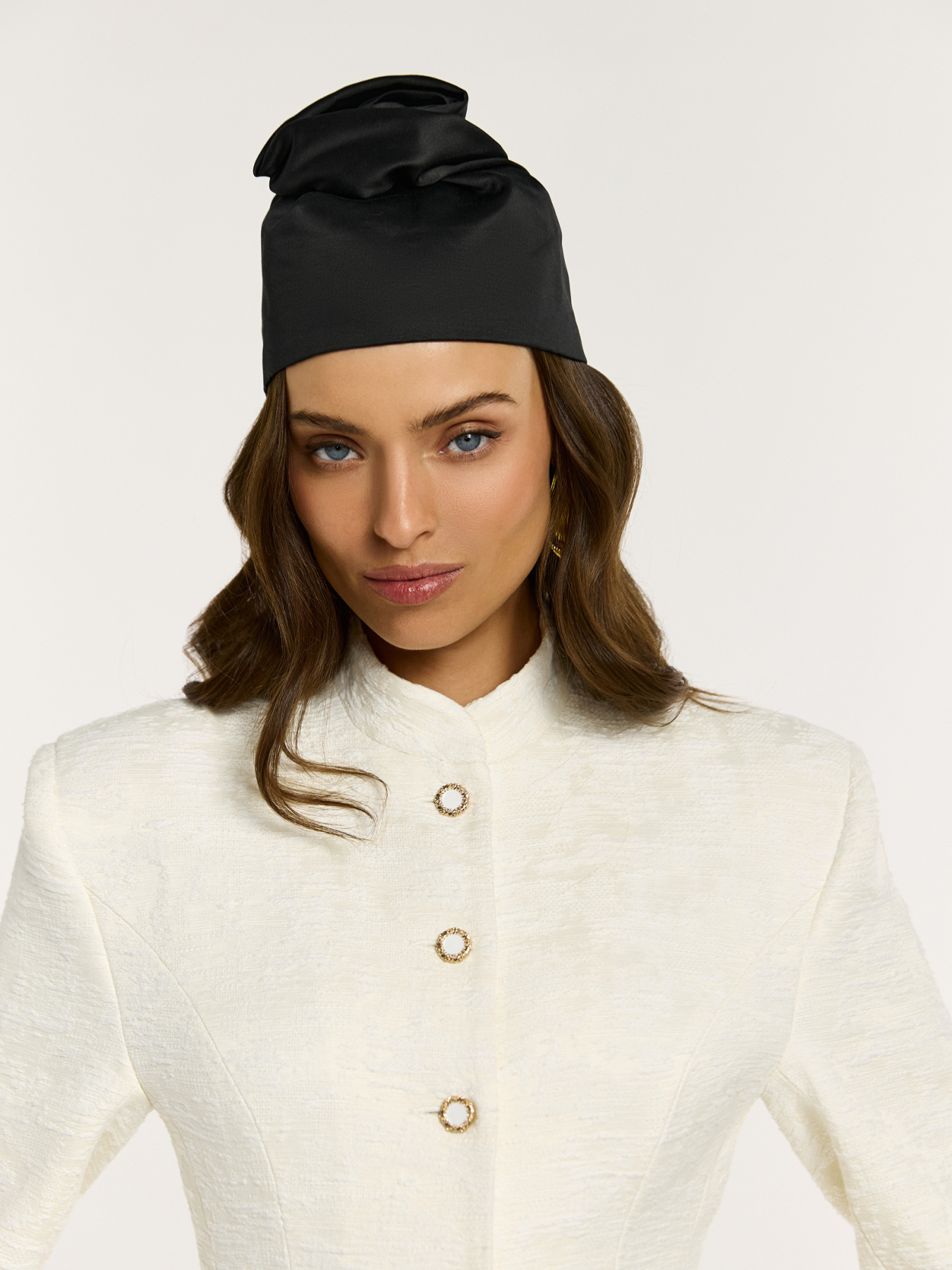 Чалма ручной работы Noche из итальянского кади в глубоком черном цвете с дизайнерской деталью в виде бутона.
