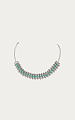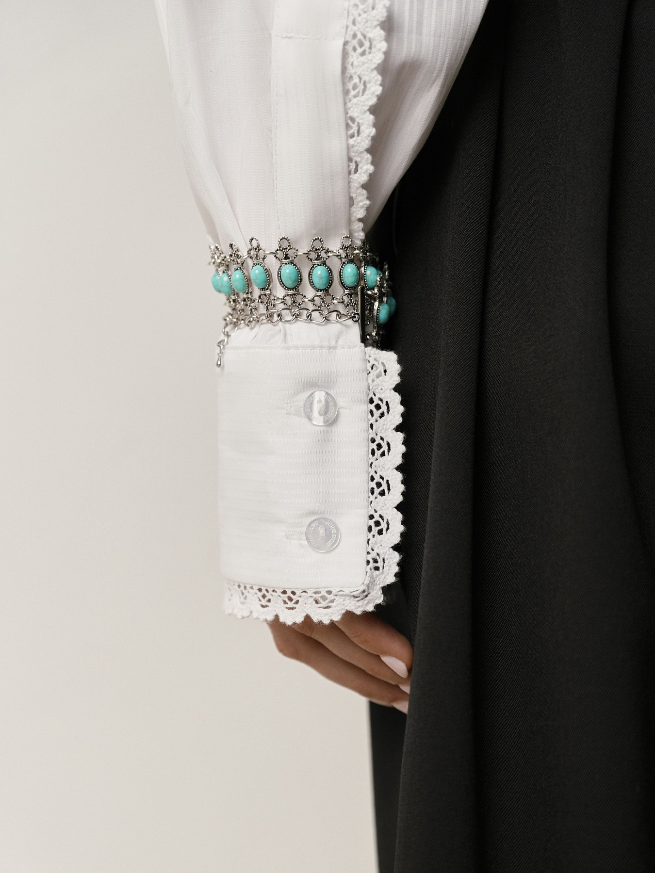 Центральный акцент — кабошон с имитацией бирюзы, органично вписанный в узор в кружевном стиле. Его тонкая графика перекликается с другими украшениями коллекции, создавая цельный образ.