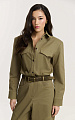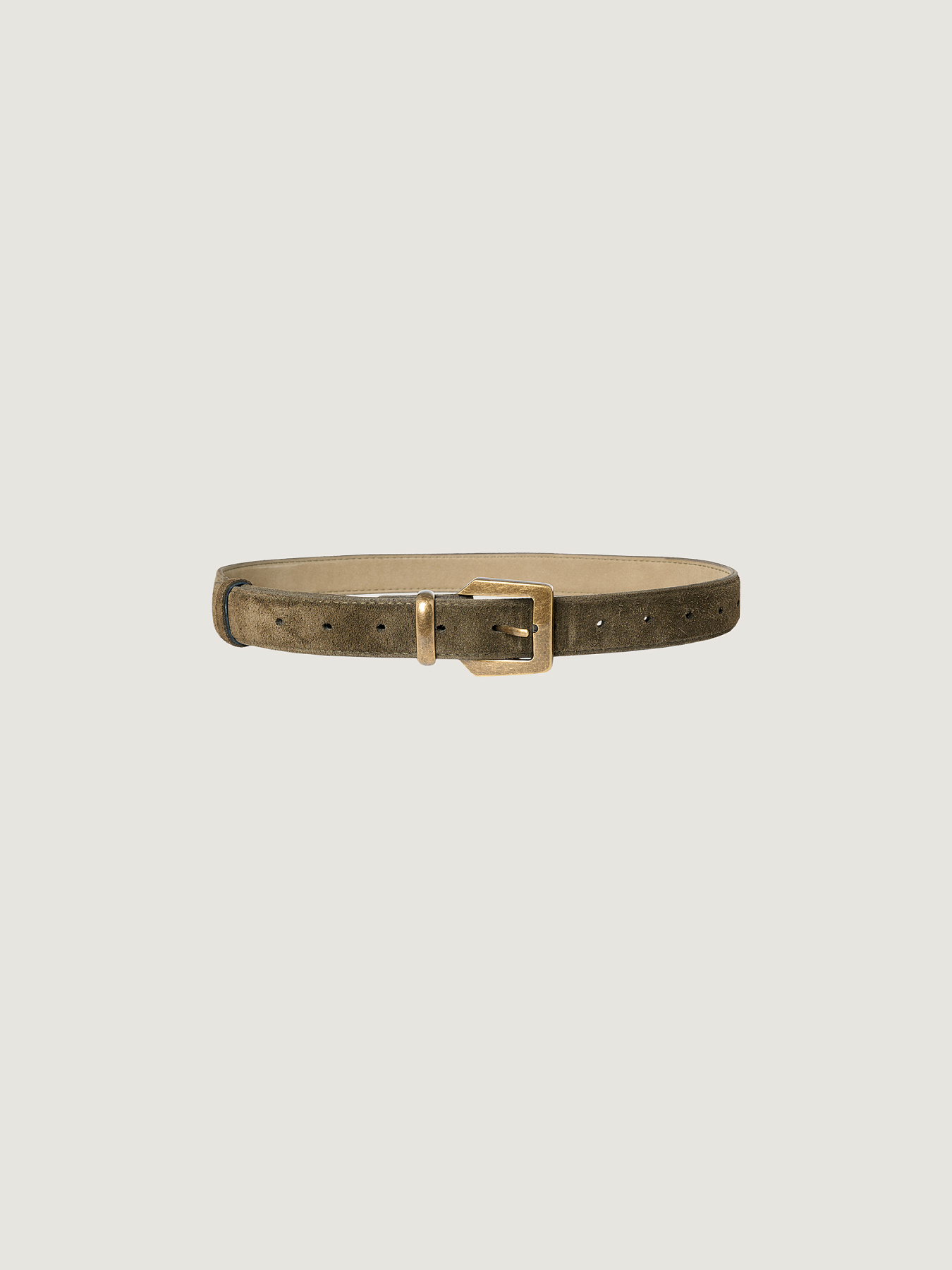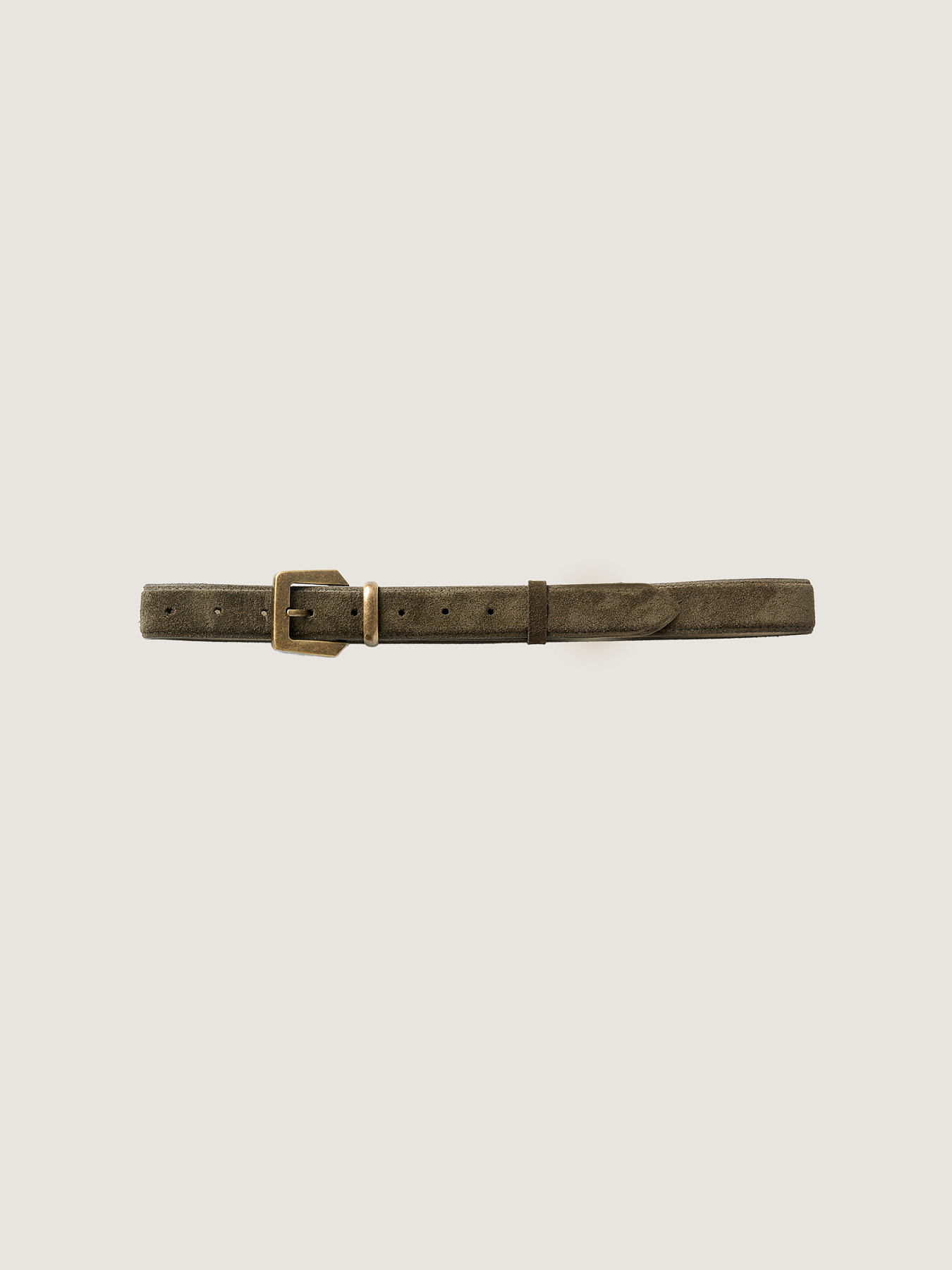 Ремень из премиальной натуральной замши в оттенке хаки. Металлическая пряжка античного цвета дополнена шлевкой в едином стиле.