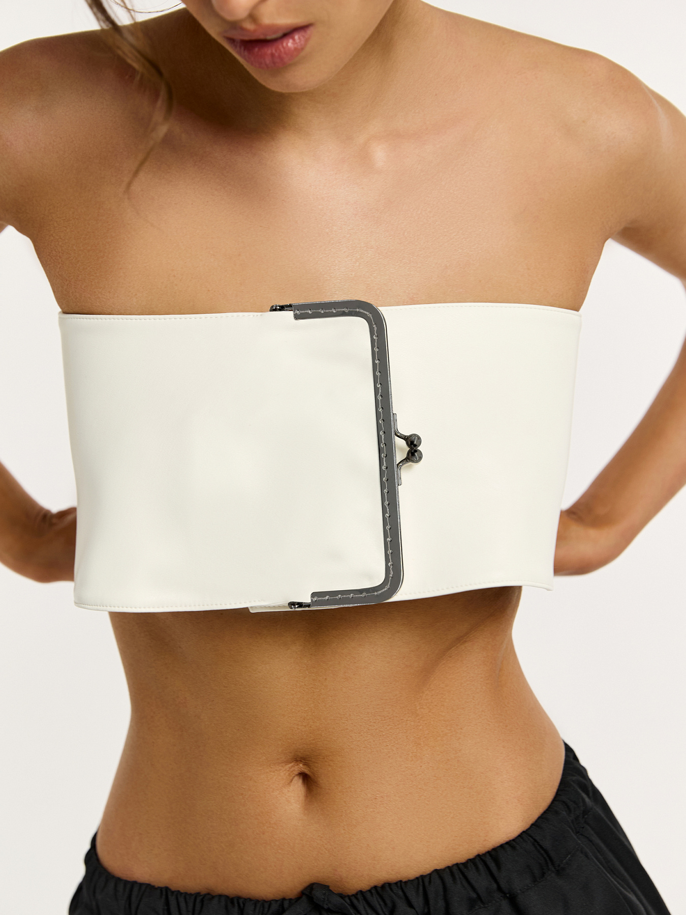 Акцентный пояс с фермуаром из мягкой молочной эко-кожи — самостоятельный элемент образа.