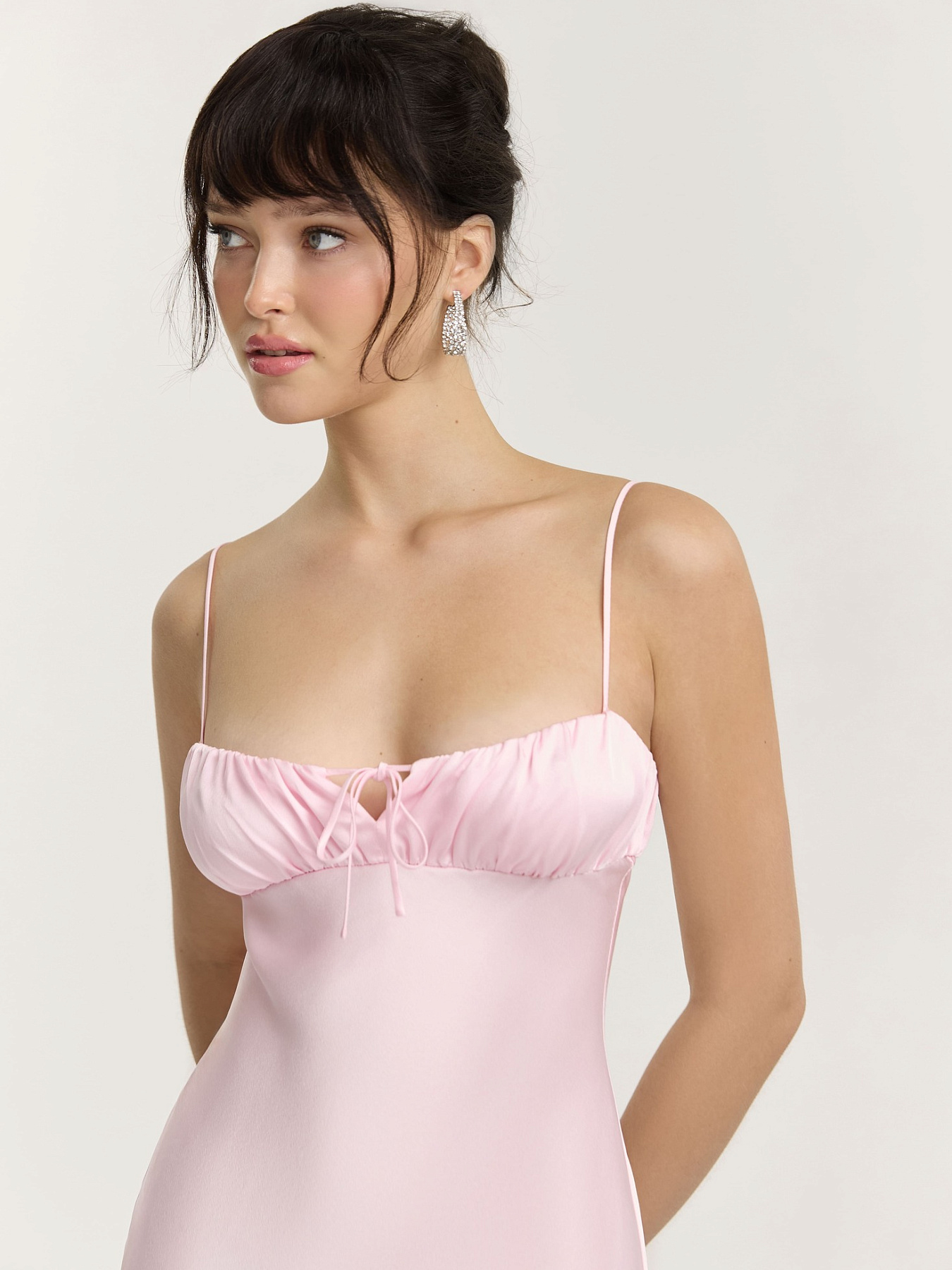 Тонкие бретели регулируются по длине. По центру лифа расположен вертикальный вырез, который можно менять по глубине с помощью тонких завязок. Все внутренние срезы выполнены люксовой обработкой.