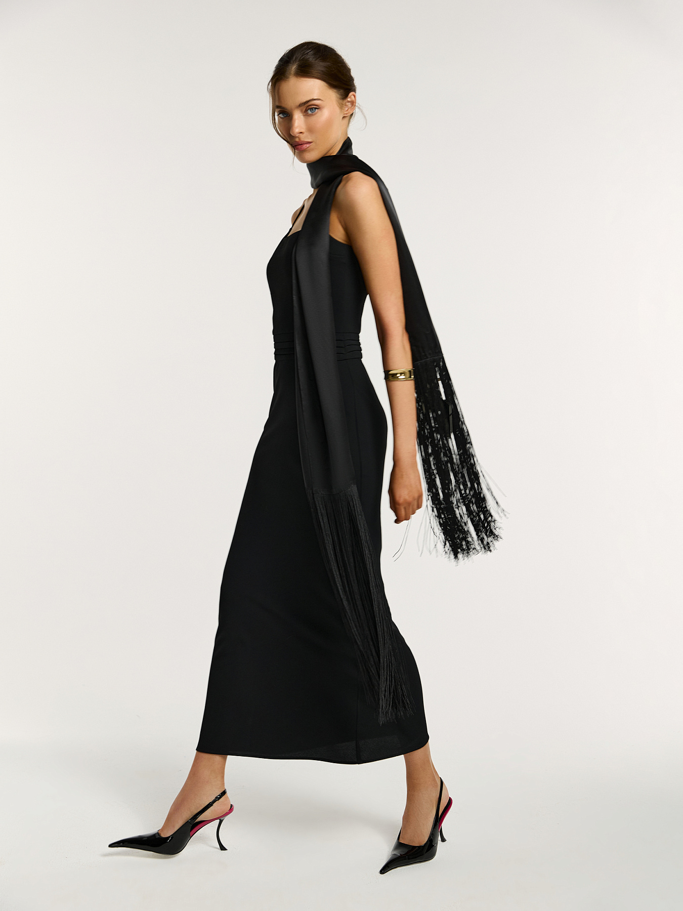 Платье выполнено на отрезном поясе. По боковым швам пояса заложены графичные горизонтальные складки — выразительная конструктивная деталь, которая подчеркивает талию и добавляет силуэту динамику.
