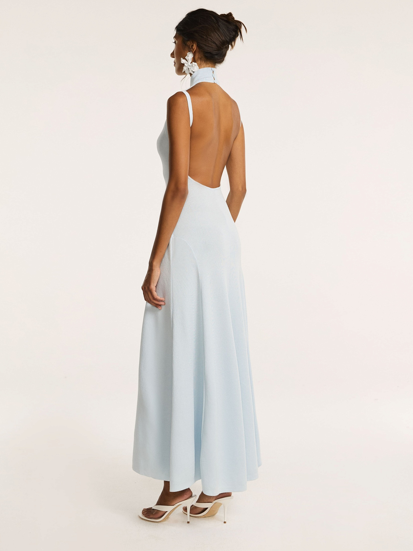 Трикотажное платье макси с открытой спинкой в голубом оттенке — модель, в которой женственность силуэта сочетается с выразительной конструкцией.