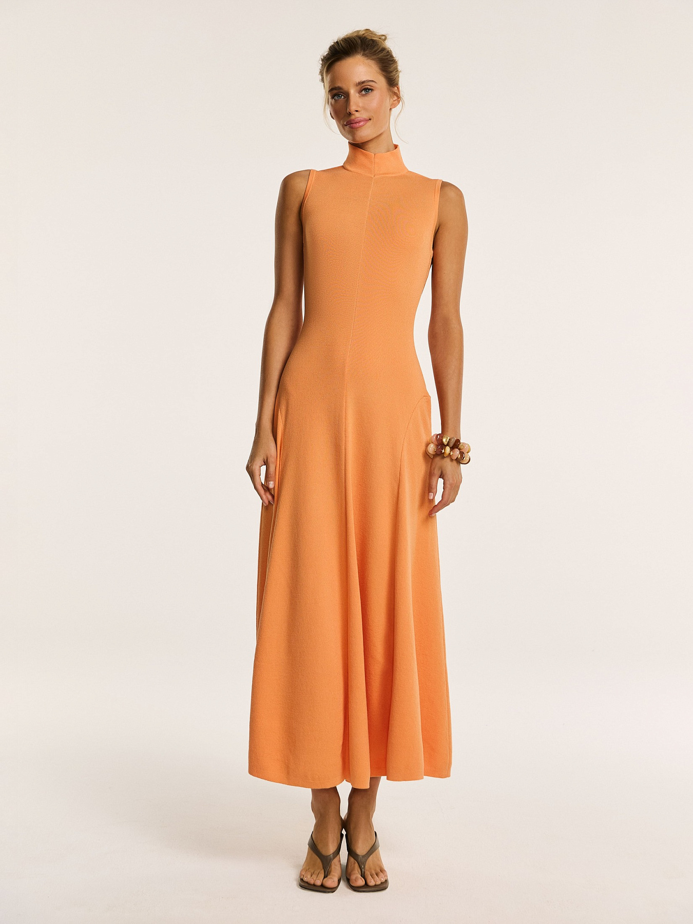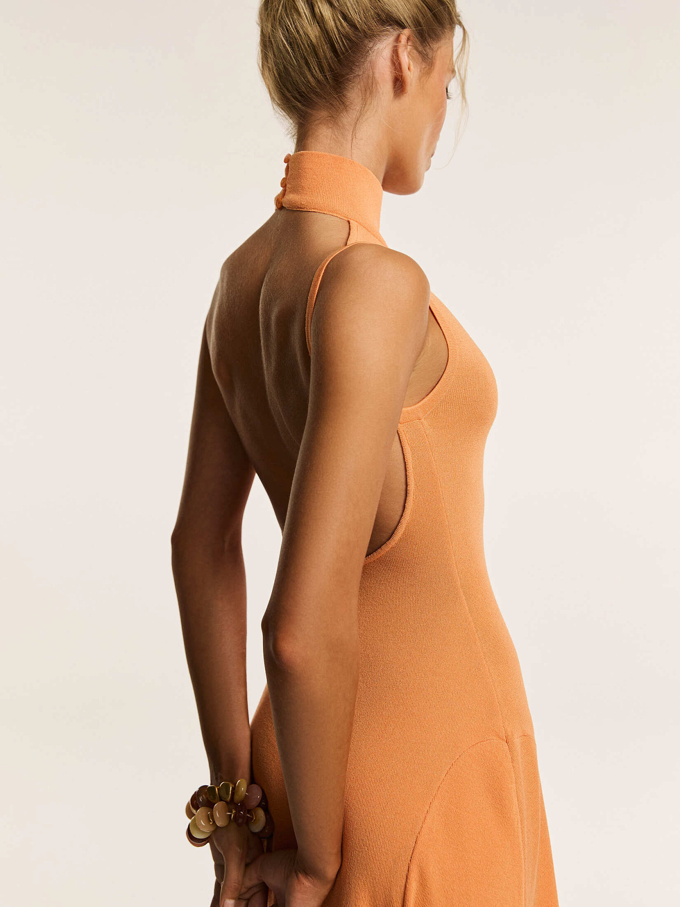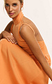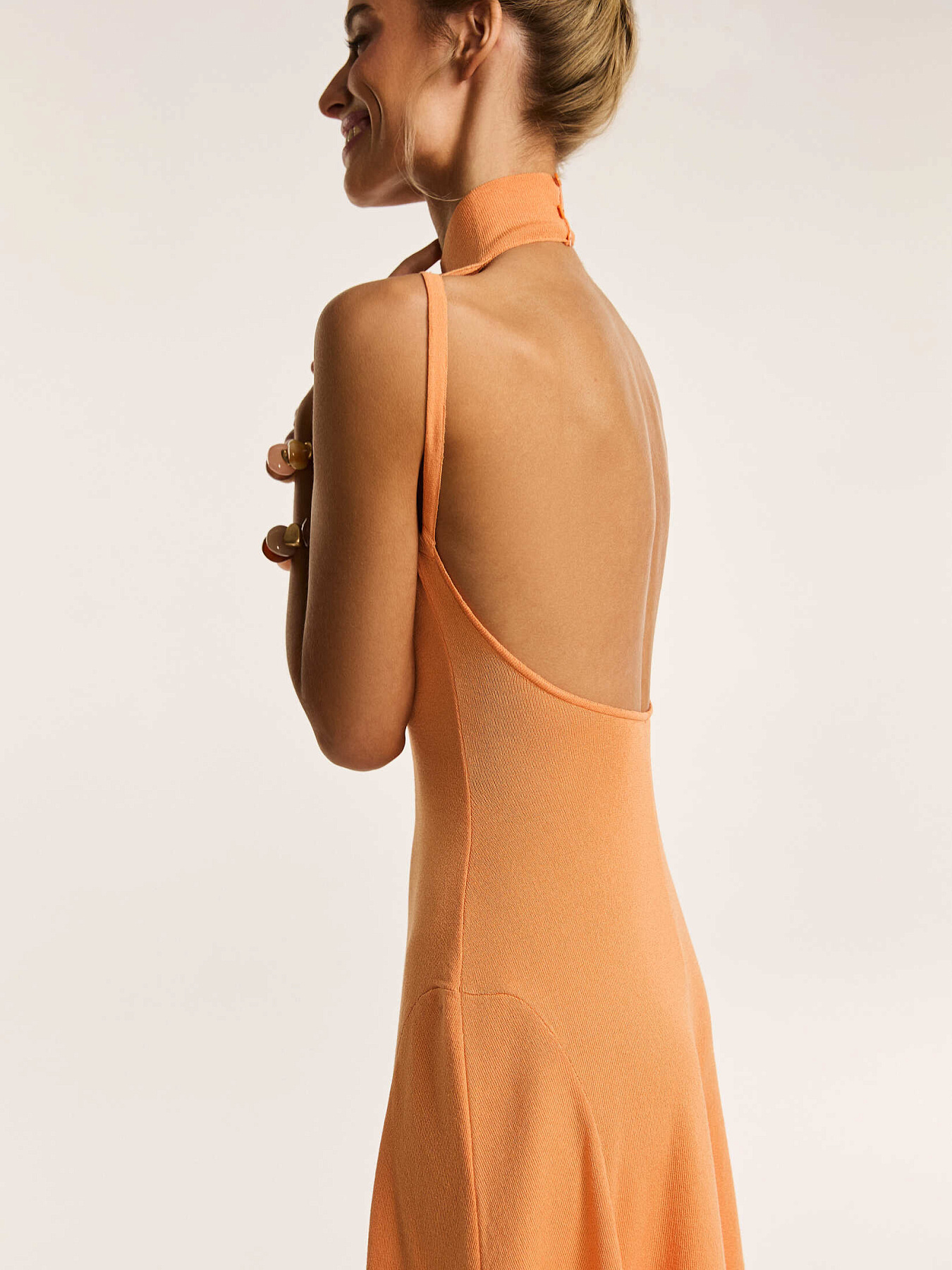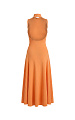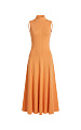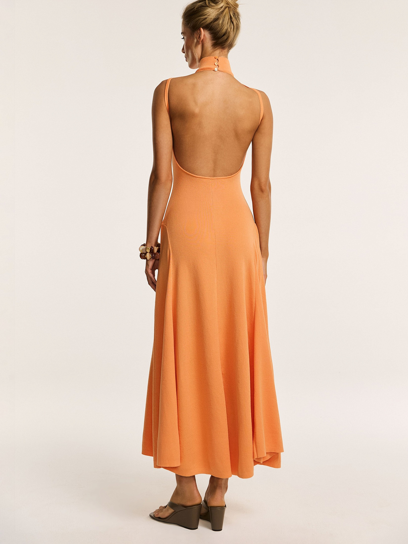 Трикотажное платье макси с открытой спинкой в апельсиновом оттенке — модель, в которой женственность силуэта сочетается с выразительной конструкцией.