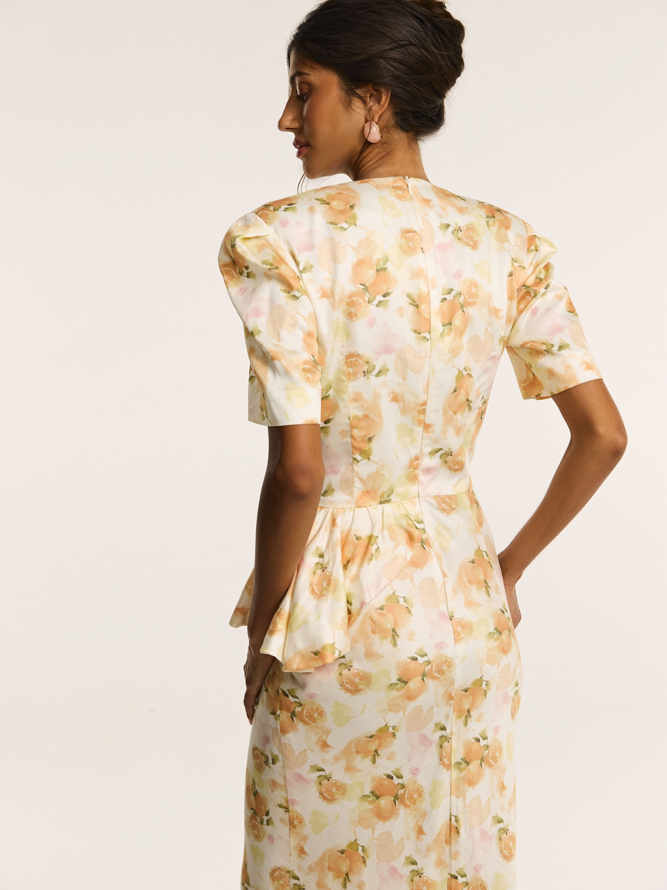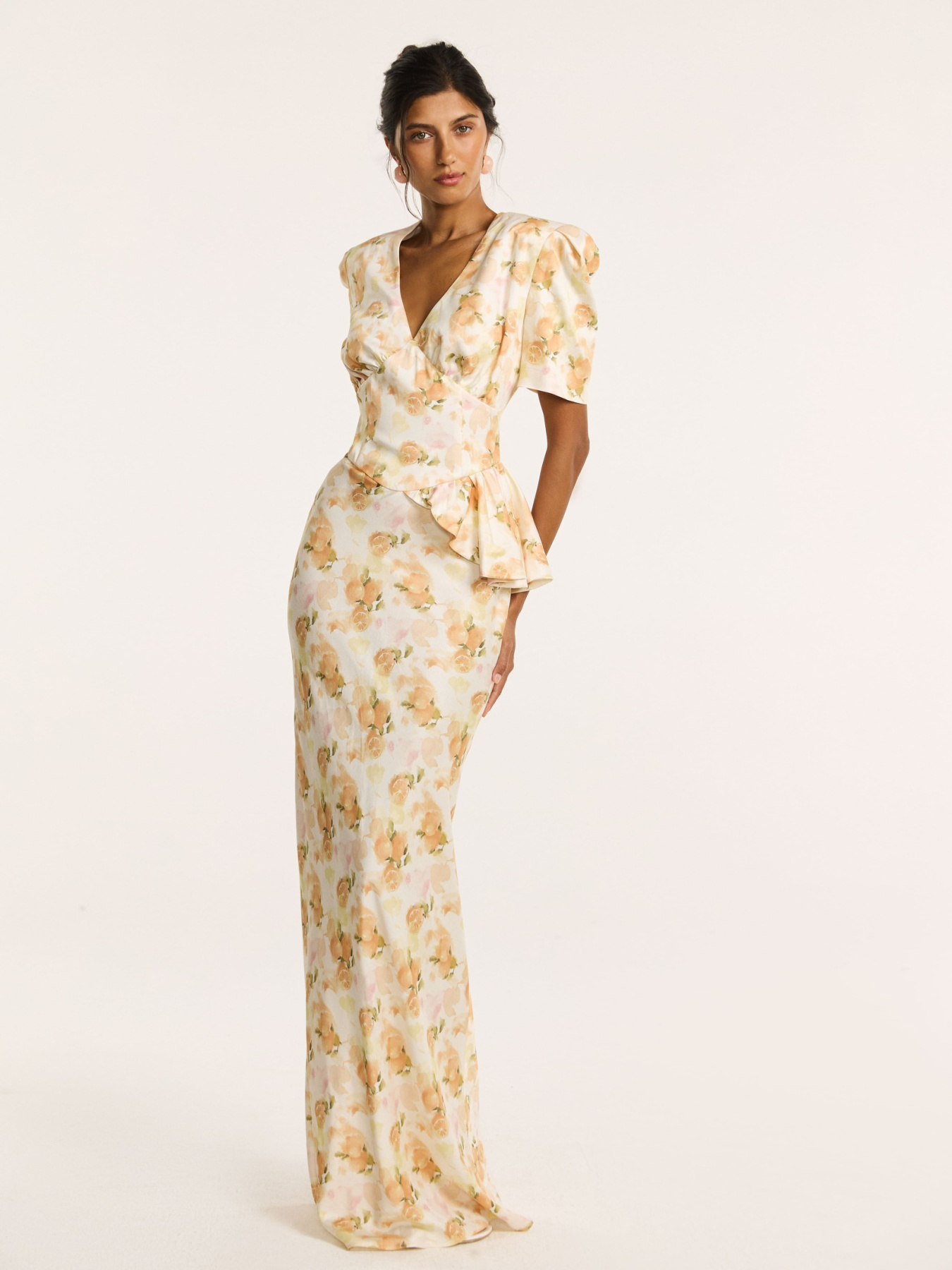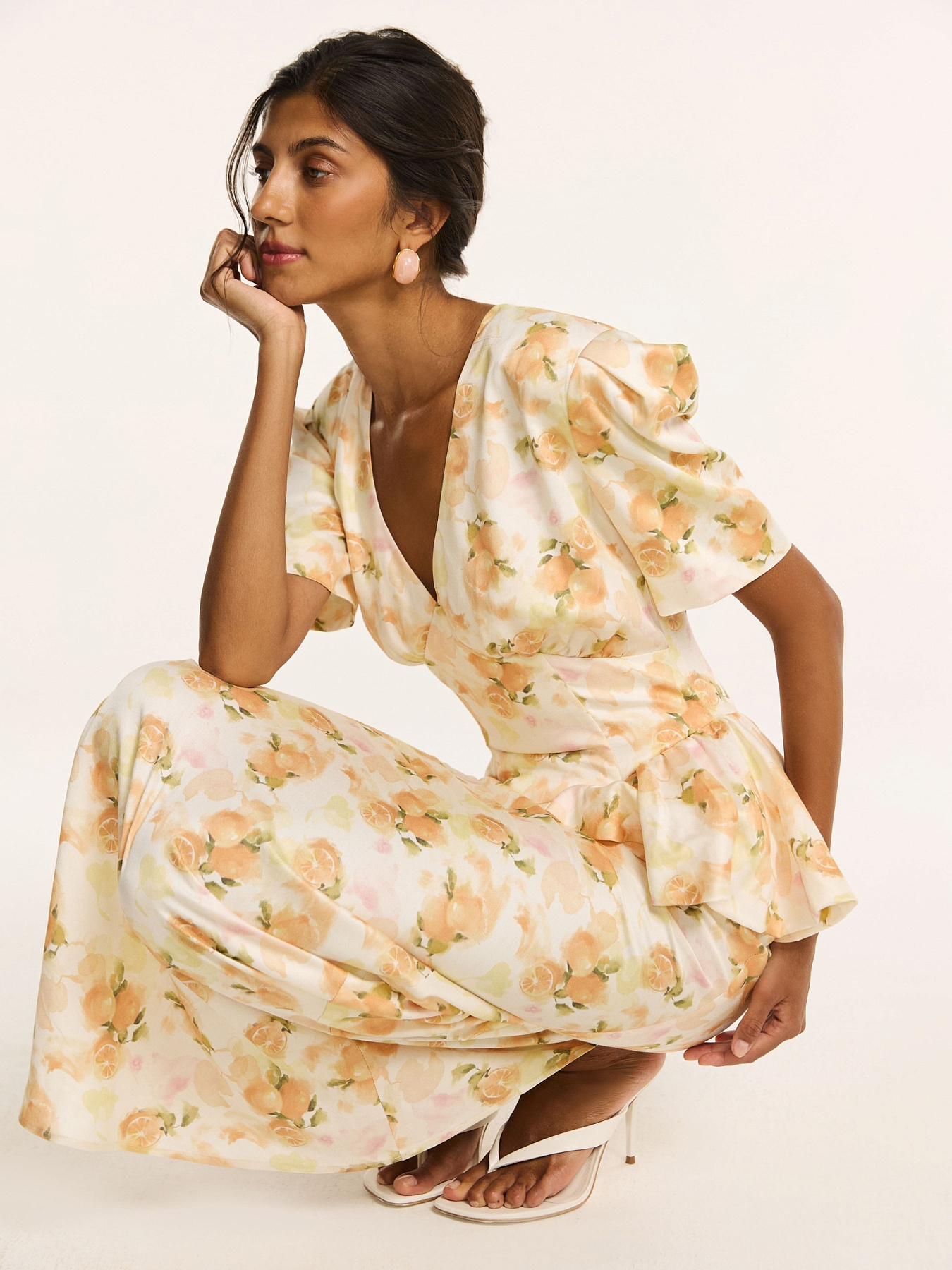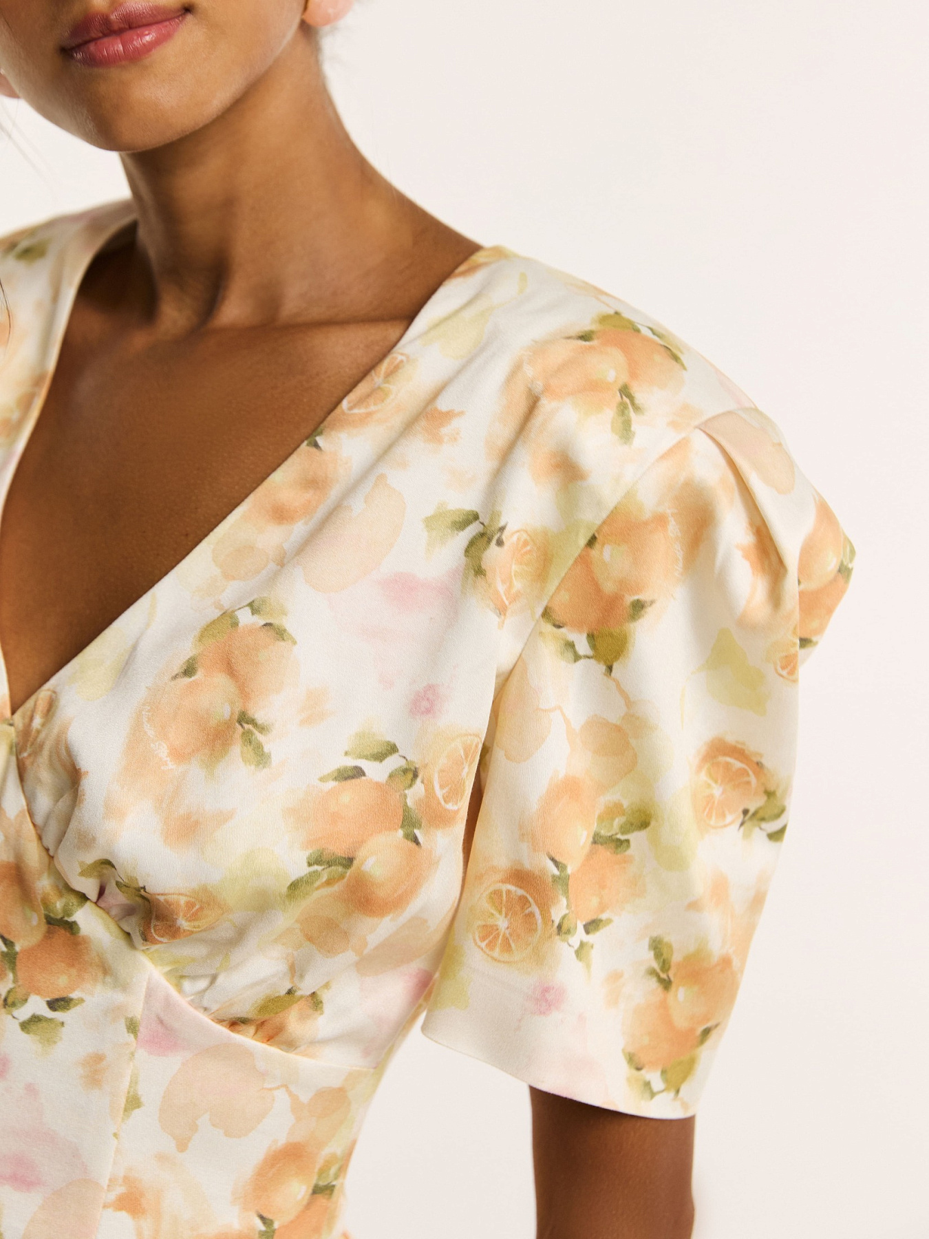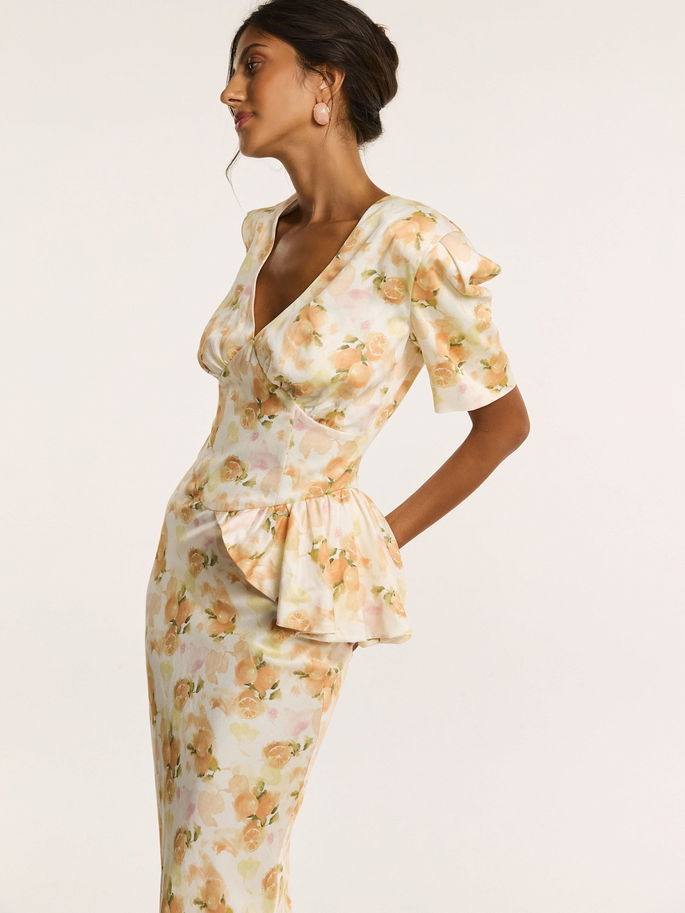 На молочном фоне — итальянские апельсины в припылённых оттенках оранжевого. Принт создан нашим дизайнером и наполнен образом тепла южной Италии. Он напечатан на итальянской фабрике специально для этой коллекции.