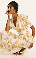 Отрезной лиф под линией груди со сборкой, объемный рукав с глубокими складками по окату придает силуэту выразительность и женственную глубину.