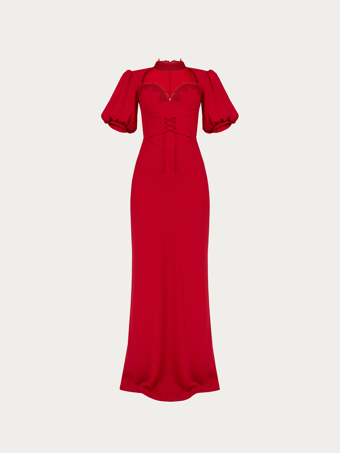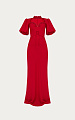 Платье макси из итальянского вискозного крепа в выразительном красном оттенке, с фигурным вырезом на груди и корсетным лифом. Лиф сконструирован по принципу корсажа: он имеет отрезные чашки из бельевого поролона и встроенную монокость, которая формирует скульптурный фигурный контур. Прилегание по переду и спинке достигается за счёт рельефов с регилином, удерживающим чёткую архитектуру лифа.