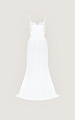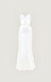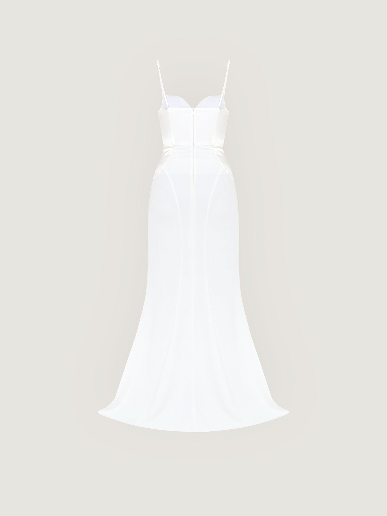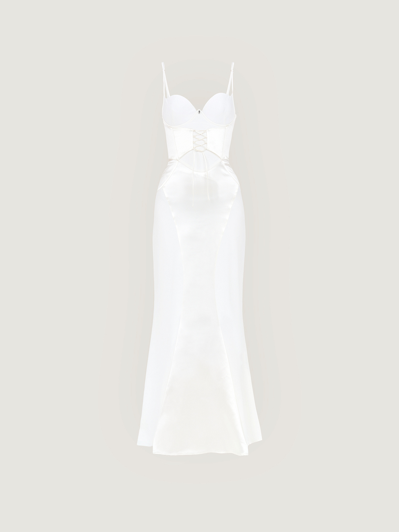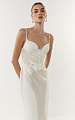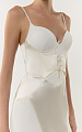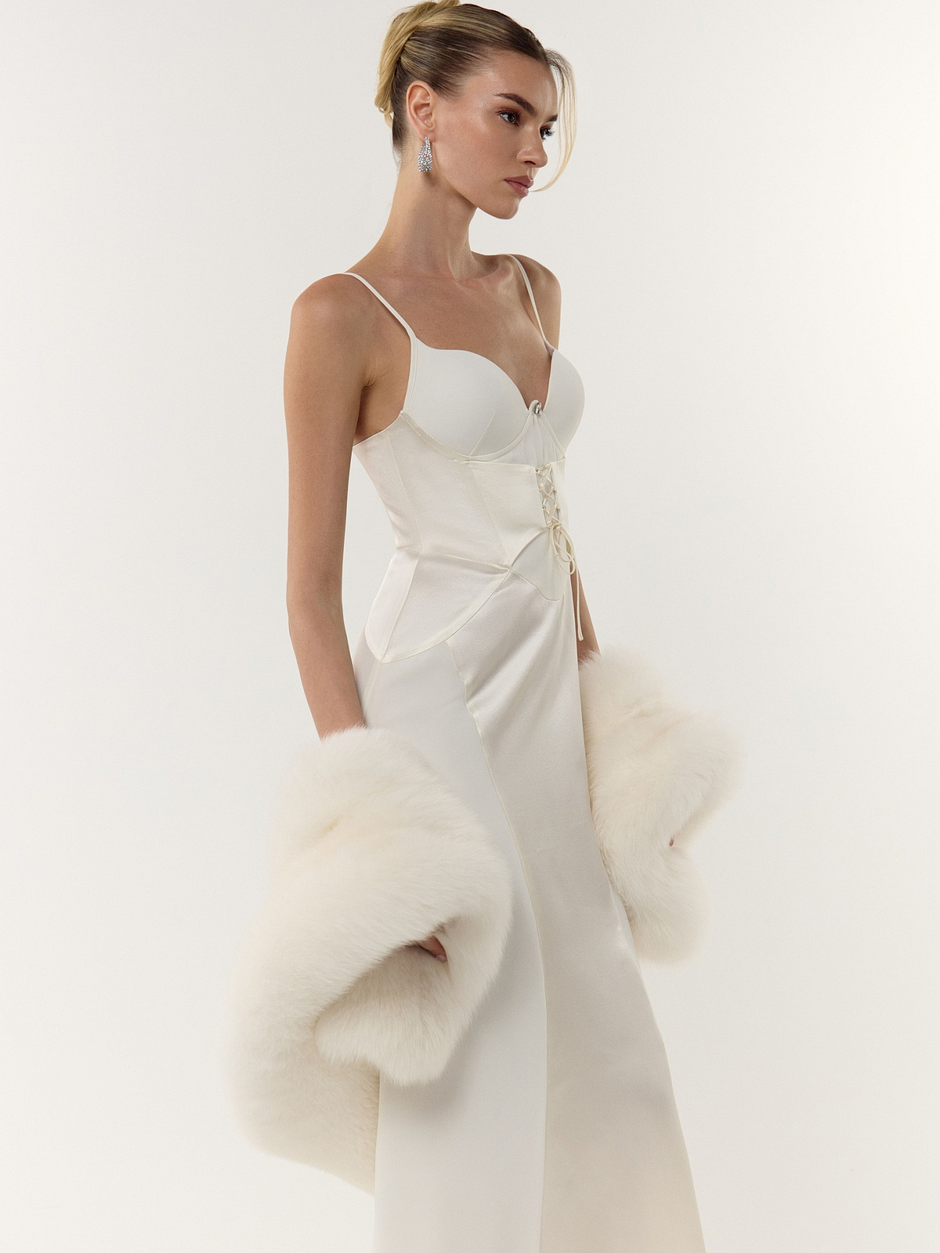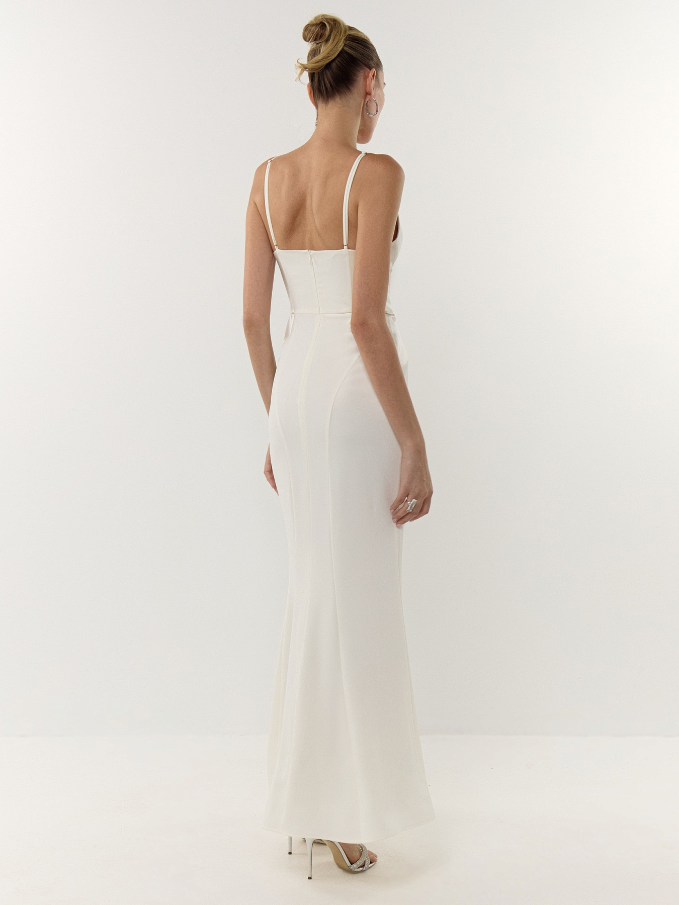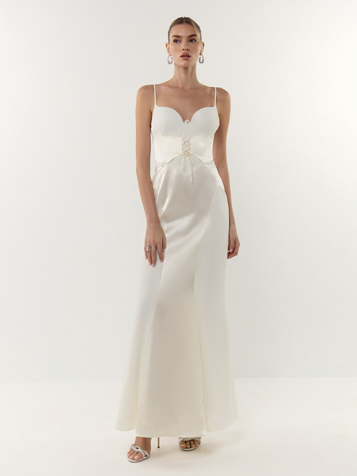 Юбка макси силуэта прилегает по бедрам и раскрывается от колена за счет вертикальных конструктивных швов. Платье сочетает две фактуры: матовый итальянский вискозный креп молочного оттенка на чашках, центральной части корсажа, боковом и заднем полотнище юбки, и вискозу с шелком в сливочном оттенке с мягким блеском на бочках корсета и центральной части переднего полотнища юбки.