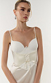 Платье корсетного силуэта на тонких регулируемых бретелях, выполненное из двух тканей-компаньонов. Лиф — конструктивный корсаж с отрезными чашками из бельевого поролона и встроенной монокостью, формирующей фигурный, аккуратный контур. Между чашками закреплен небольшой кристалл, добавляющий светлый акцент.