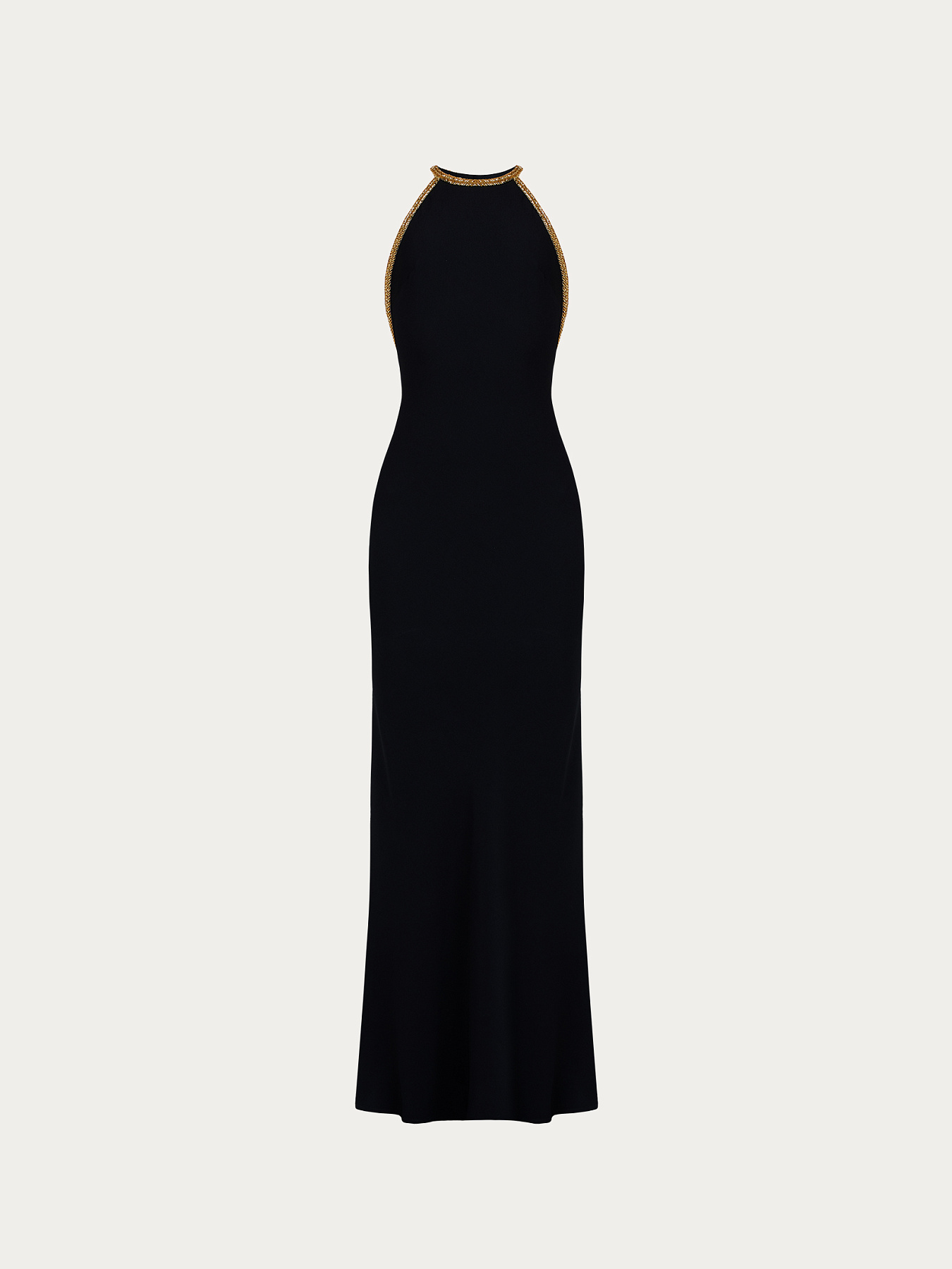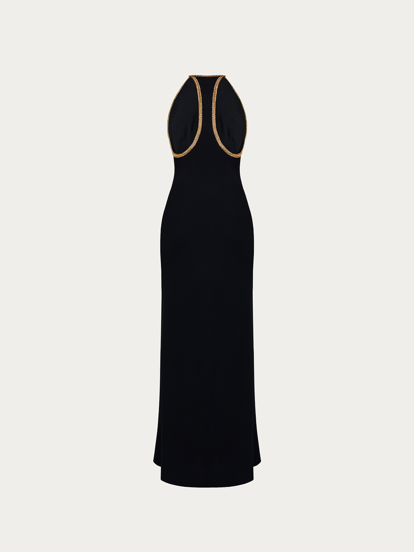 Главная деталь — золотистая бисерная тесьма, обрамляющая вырез горловины, проймы и глубокий вырез спинки. Тесьма сложна в обработке, поэтому выкладывается и фиксируется на каждом изделии индивидуально вручную.