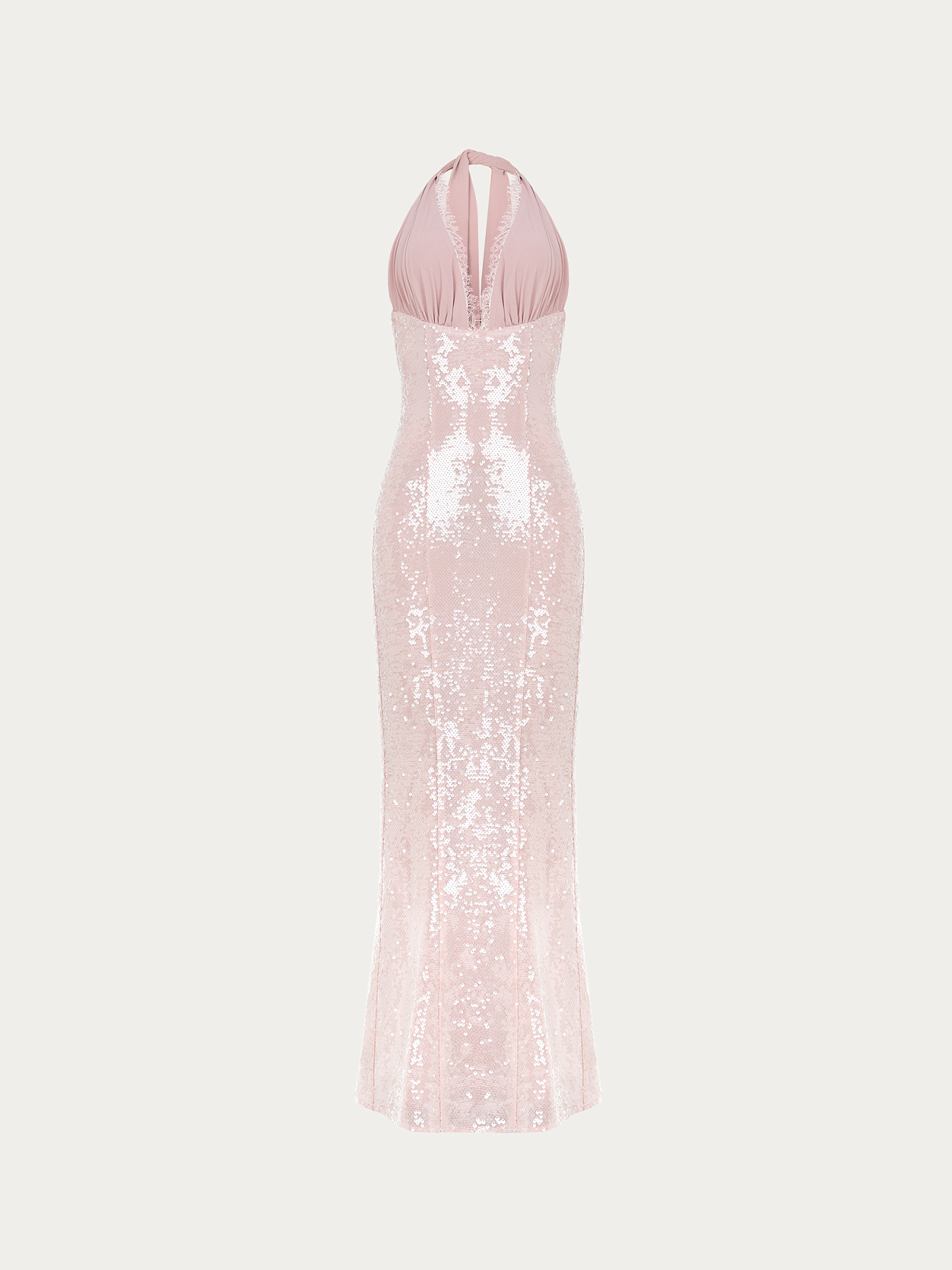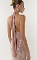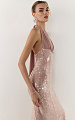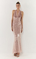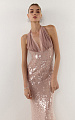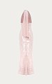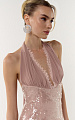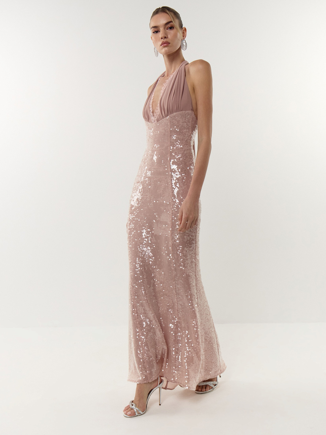 Платье макси, выполненное из двух тканей: итальянской пайетки и вискозного шифона в пыльно-розовом оттенке. Лиф полностью изготовлен из двойного шифона, который крепится к основе под грудью в густую аккуратную сборку. Шифоновые детали мягко закрывают зону декольте и фиксируются на шее узлом или бантом, создавая легкий, воздушный акцент.