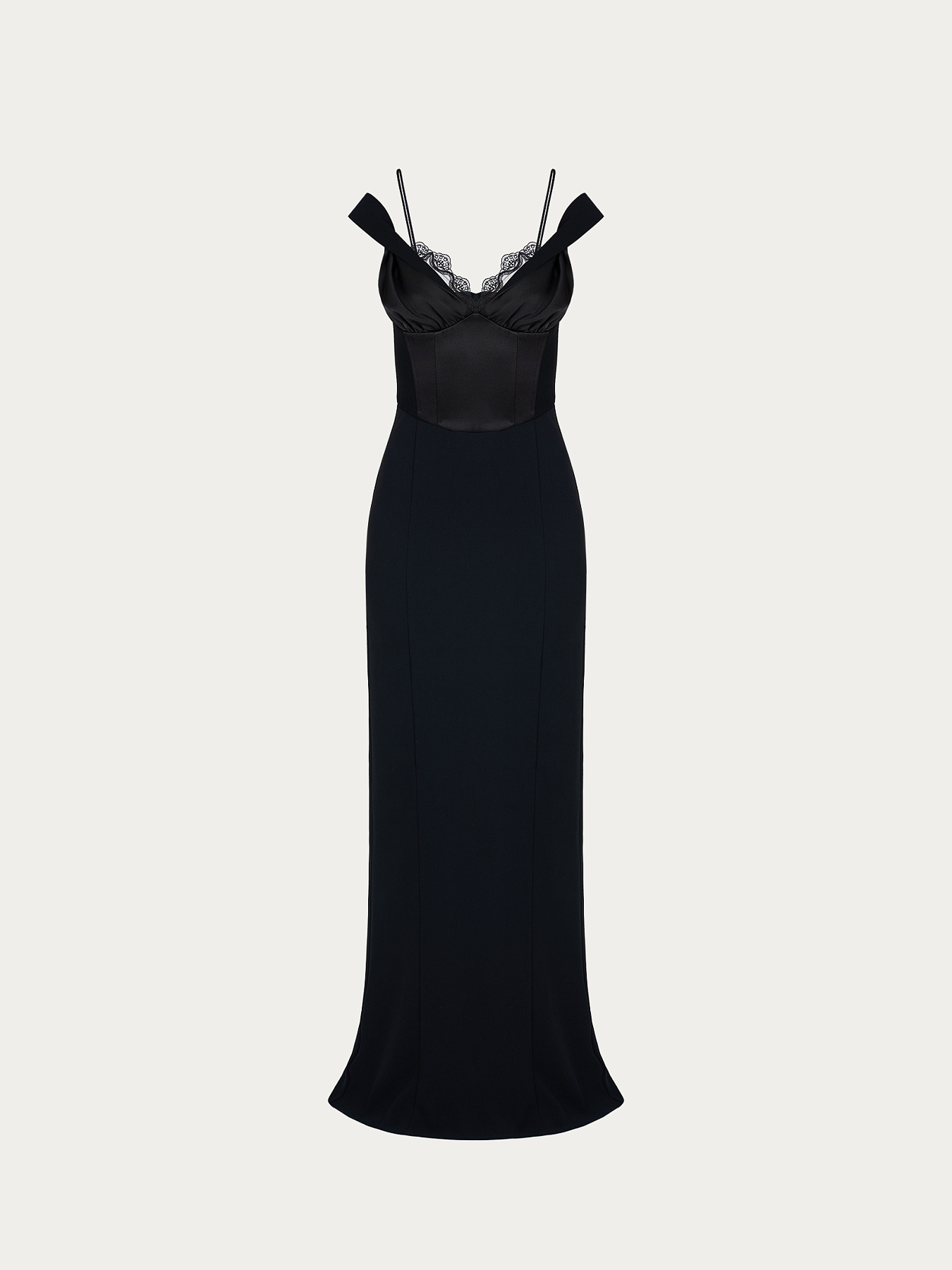 Платье корсетного силуэта из итальянского вискозного крепа и ткани дюшес в глубоком черном оттенке. Лиф до линии талии выполнен как полноценный корсаж с отрезными чашками, верхний срез которых украшен деликатным итальянским кружевом.
