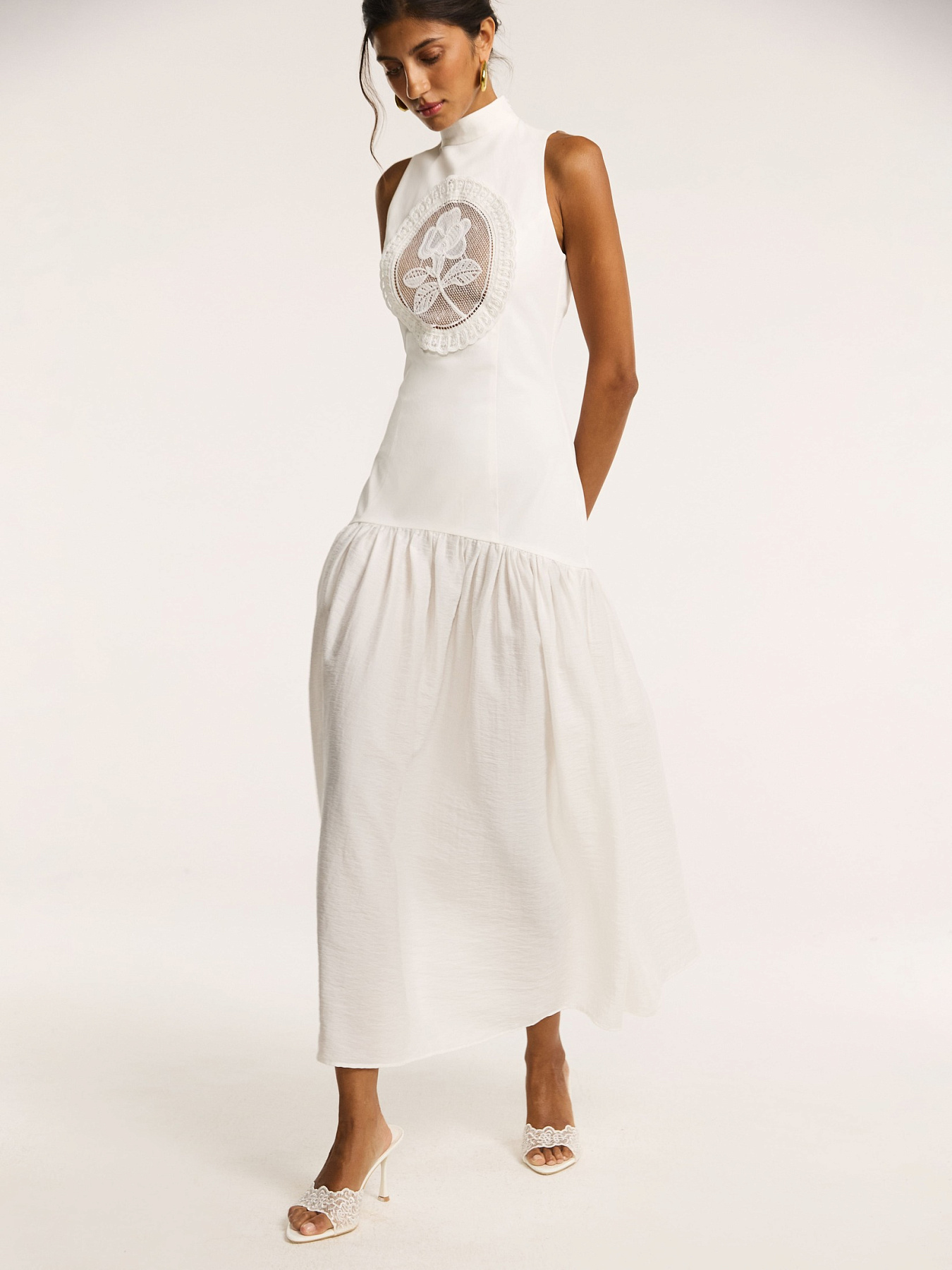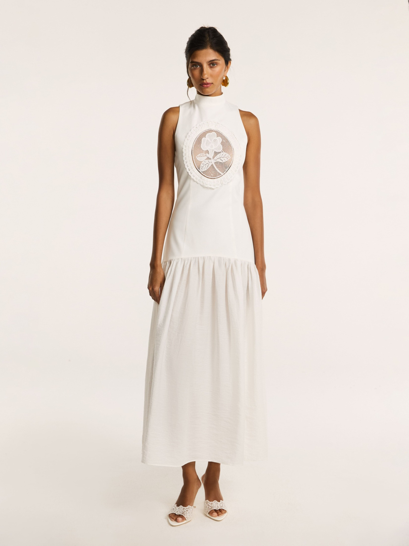 Платье из итальянского хлопка в молочном оттенке — элегантная модель, в которой строгость лифа и воздушность юбки создают безупречный баланс.