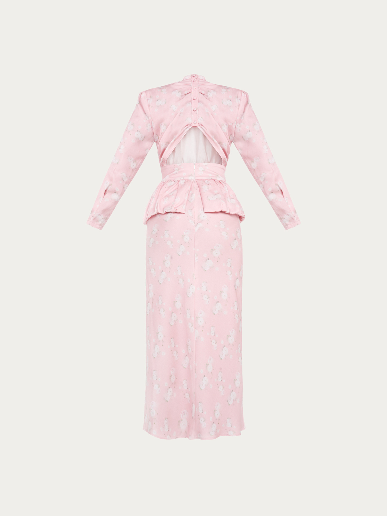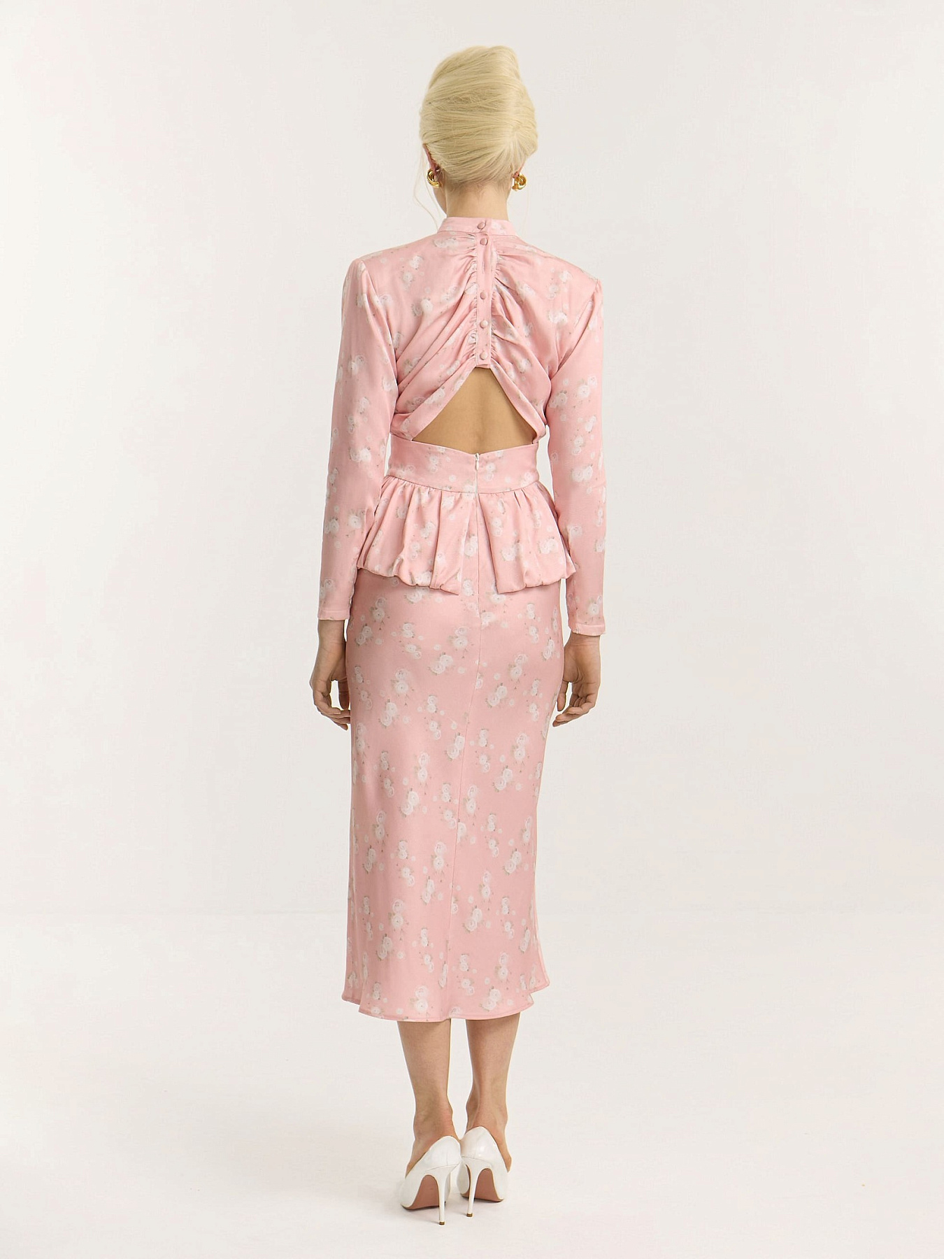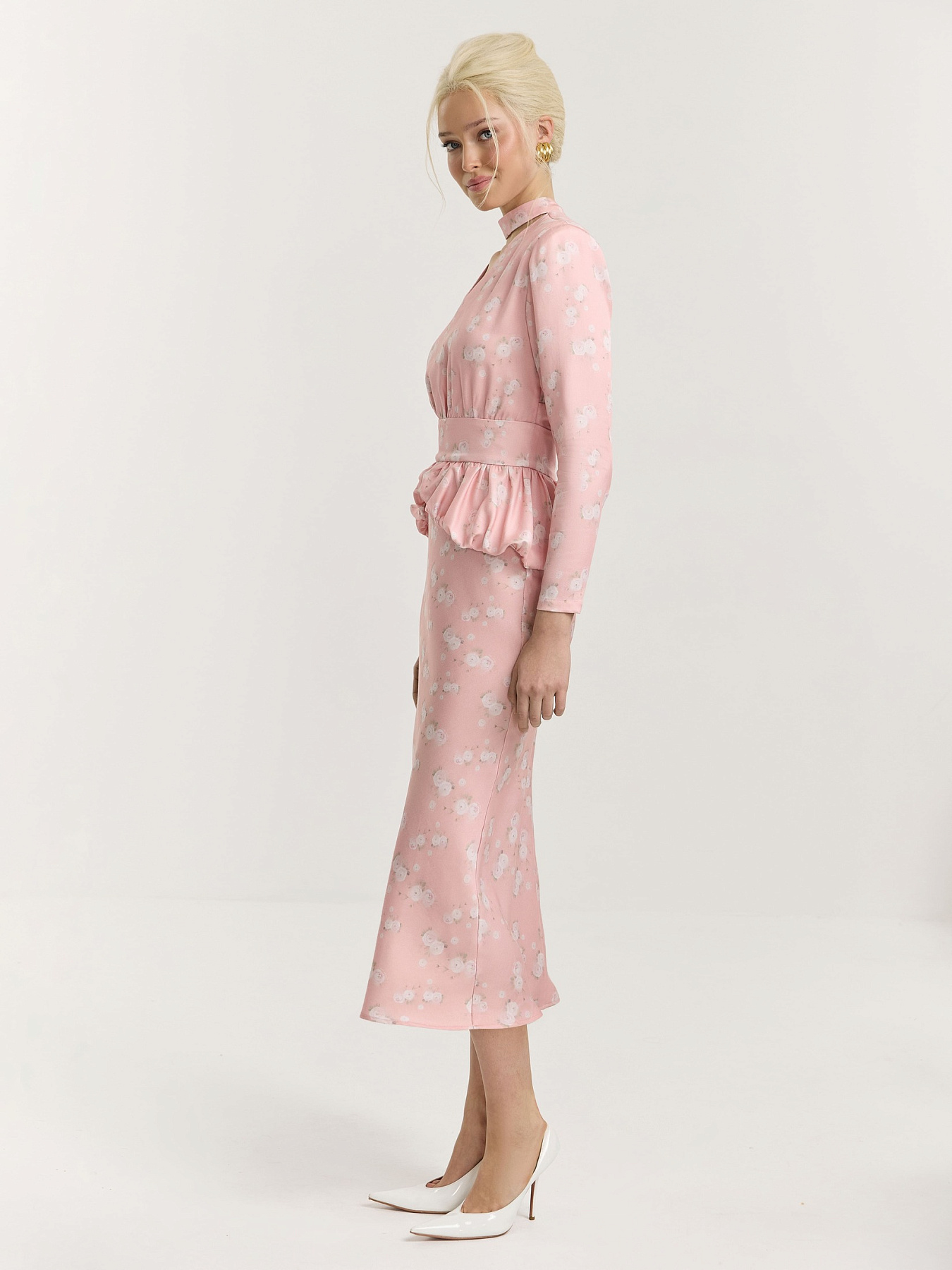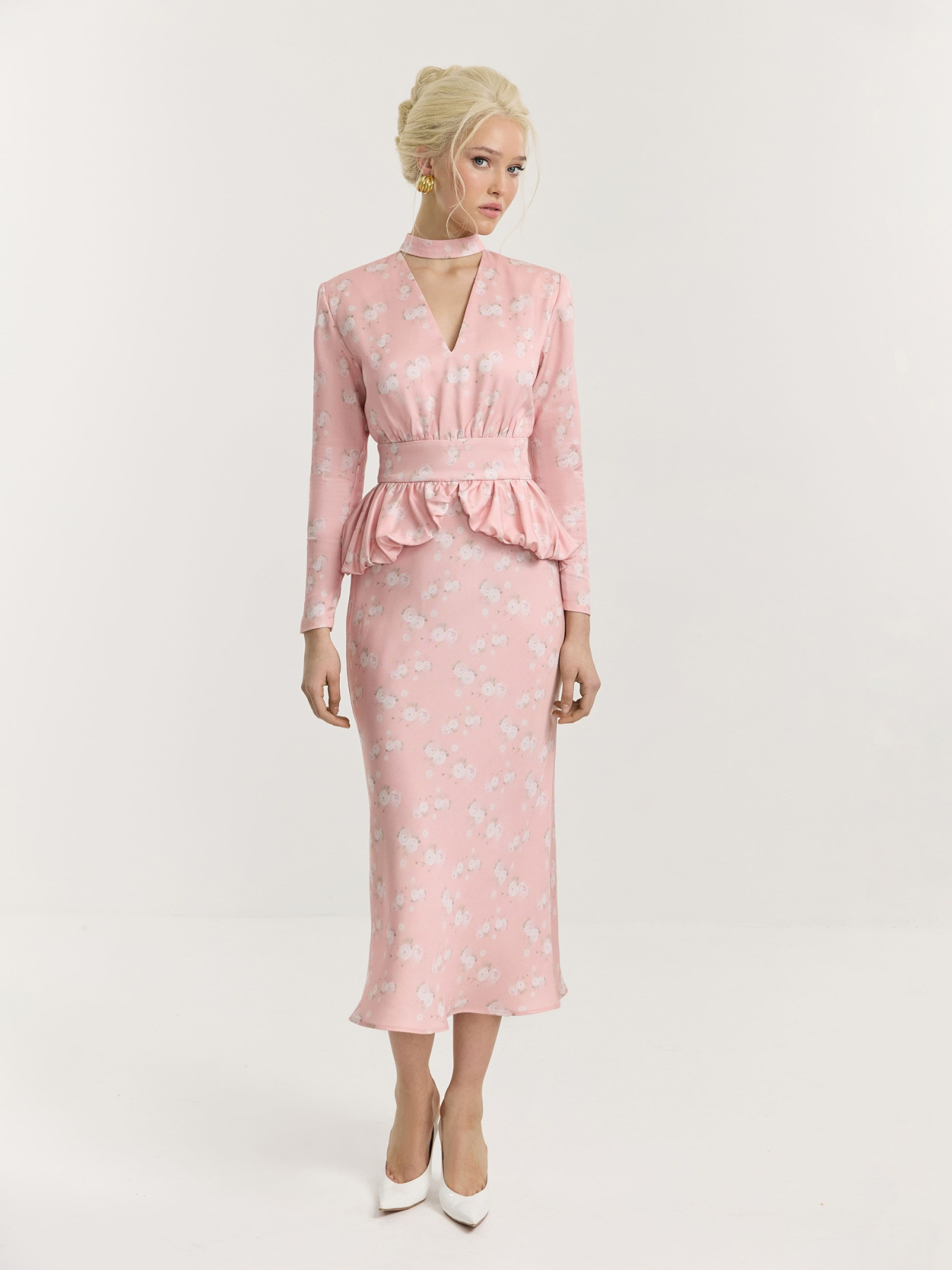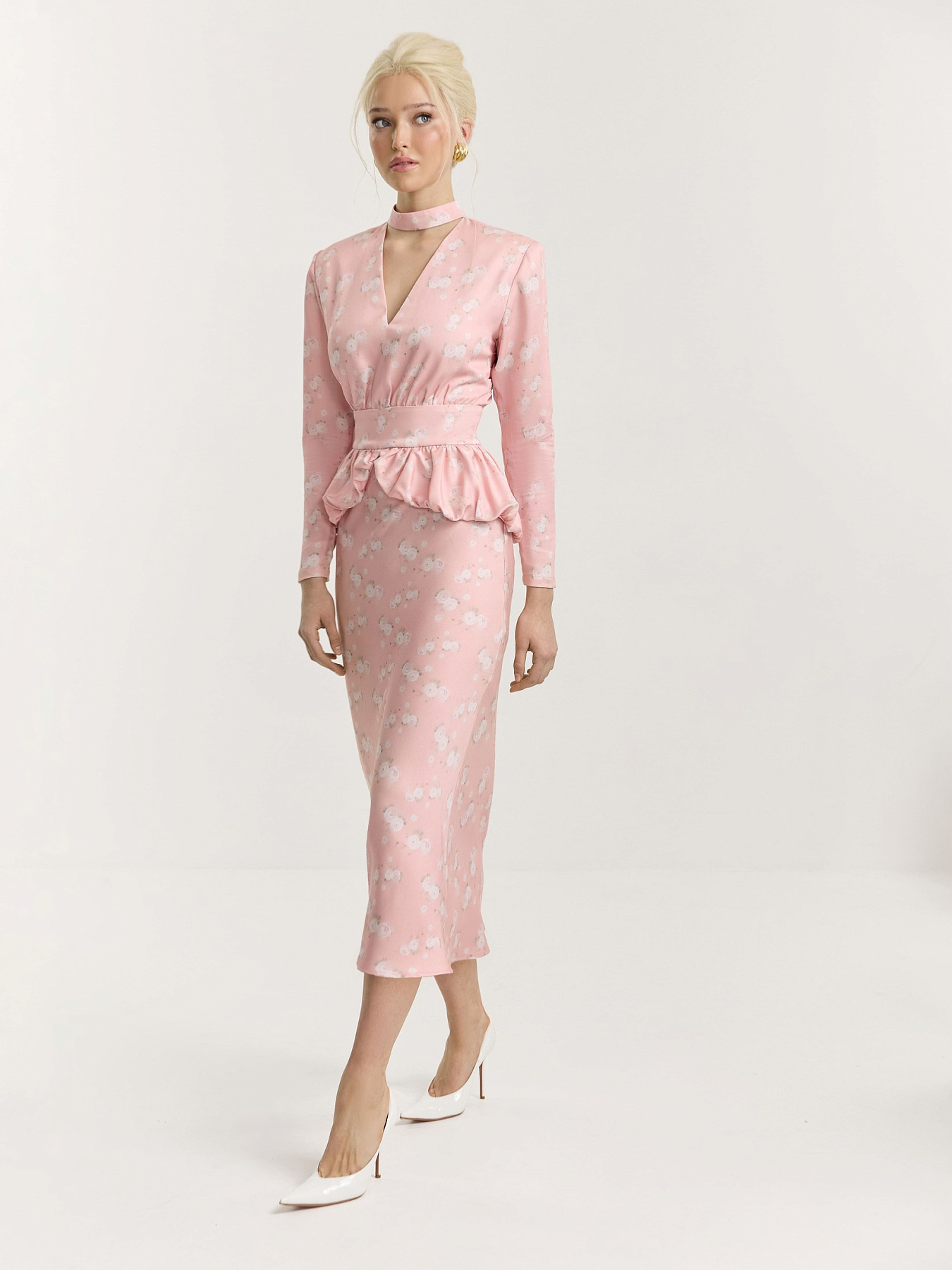Платье миди из итальянской принтованной итальянской вискозы в нежно-розовом оттенке. На фоне — молочные ранункулюсы, хаотично рассыпанные по полотну. Принт создан специально для этой коллекции нашим графическим дизайнером.
