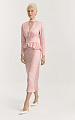 Платье собрано на широком отрезном поясе, от которого начинается объемная баска-баллон. Юбка скроена по косой, благодаря чему ткань пластично ложится по фигуре.