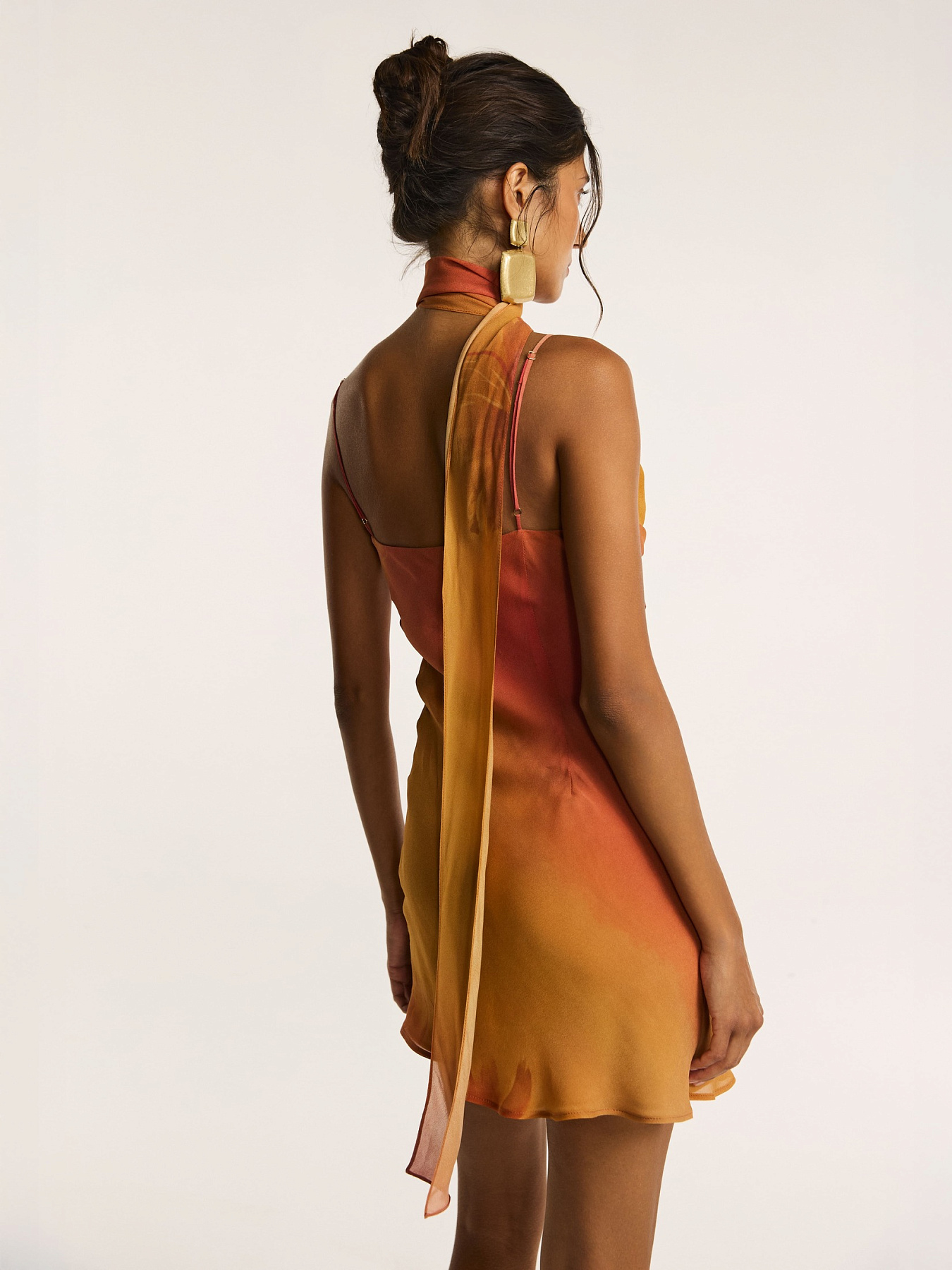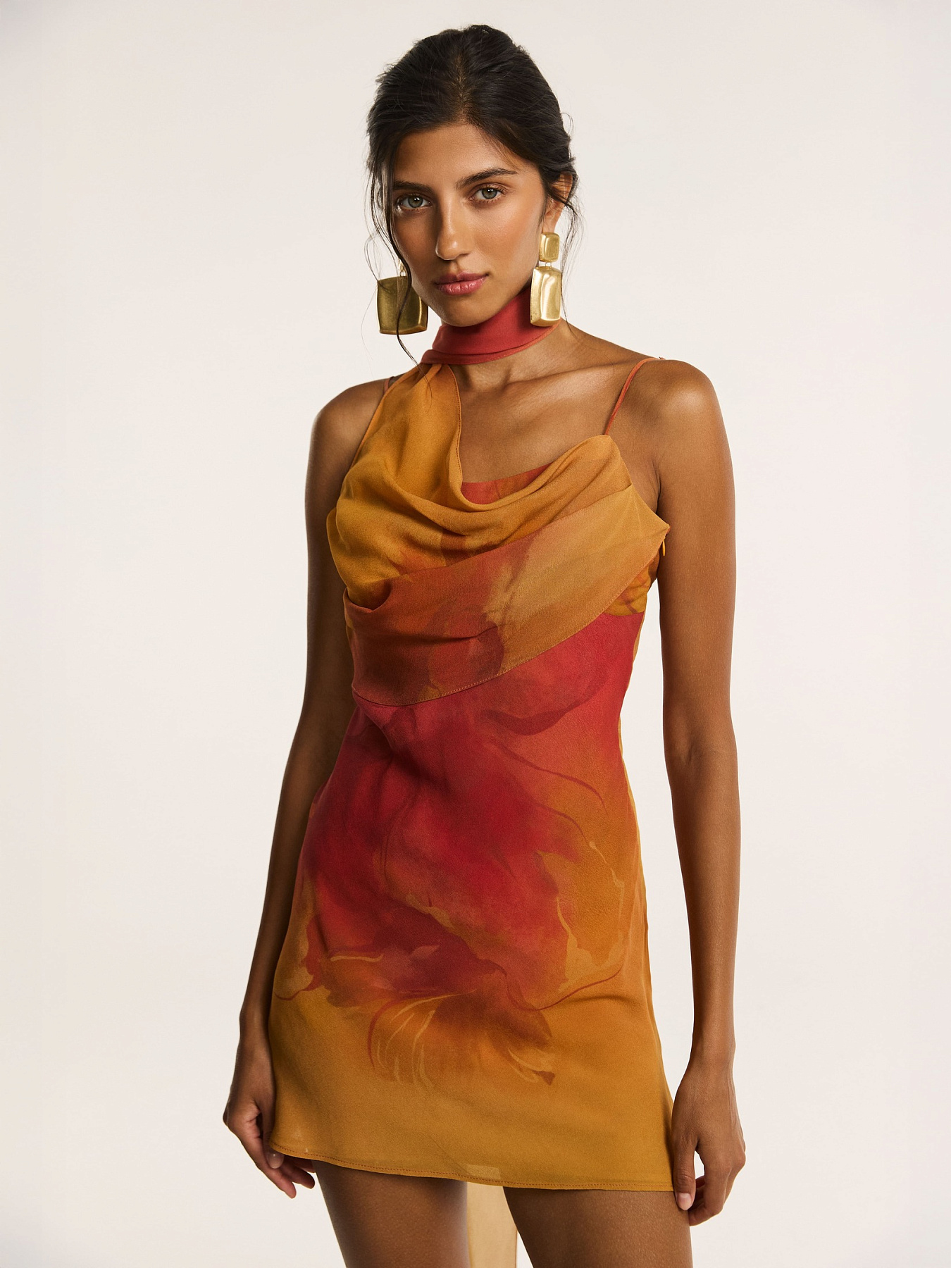 Платье мини из принтованного вискозного шифона — модель, в которой принт задаёт всё настроение образа.