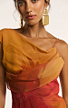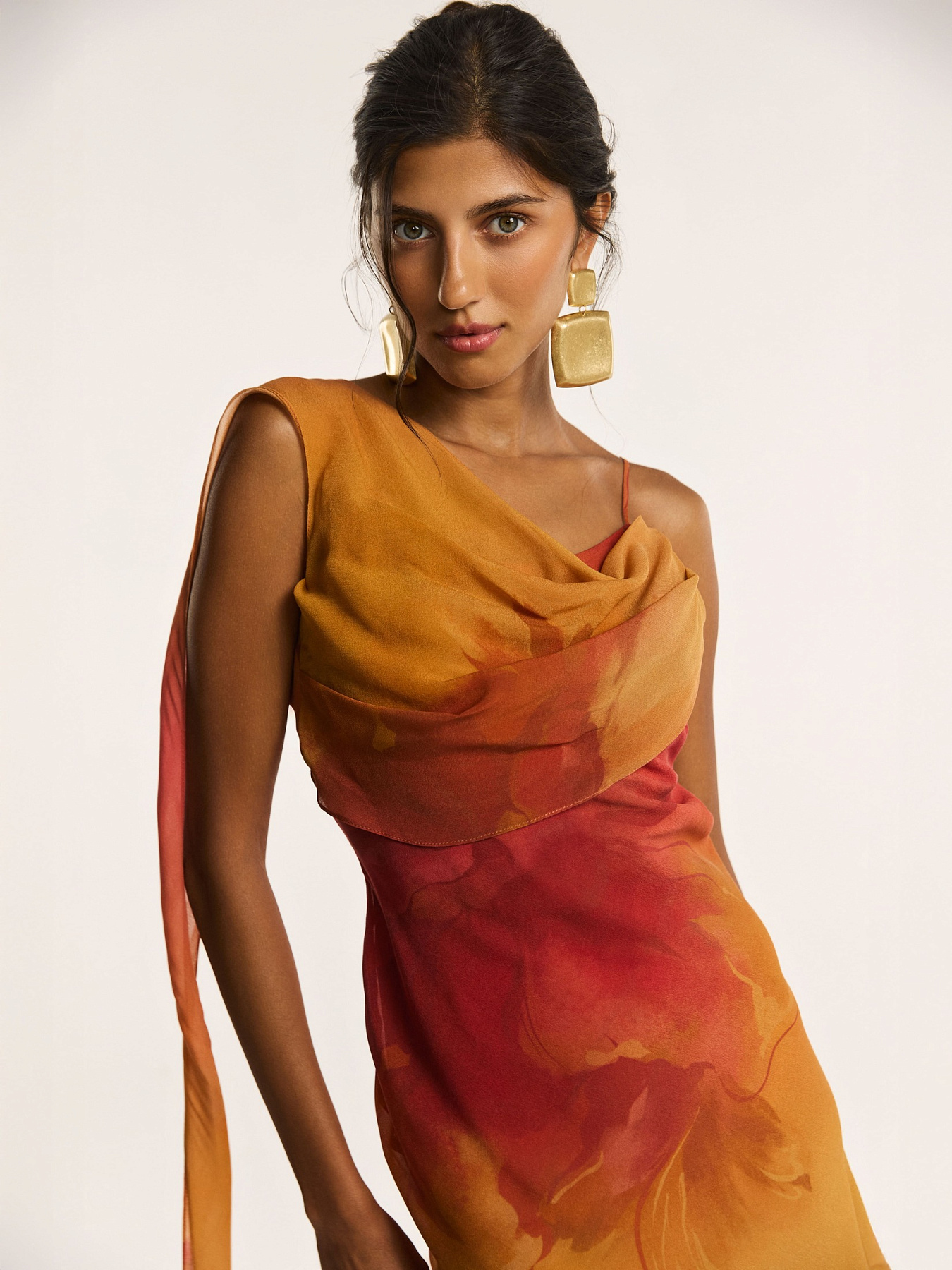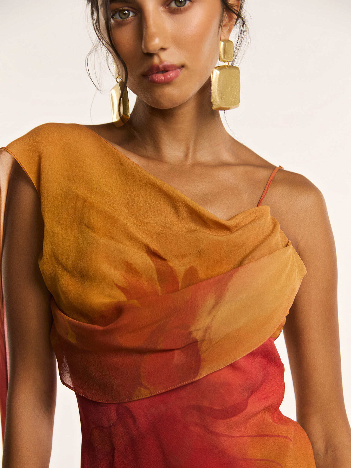 На оранжево-жёлтом фоне с градиентным окрашиванием — пышные распустившиеся пионы в красно-оранжевых оттенках. Принт создан нашим дизайнером — живой, насыщенный рисунок, который красиво раскрывается в движении. Он напечатан на итальянской фабрике специально для этой коллекции.