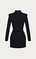 Вырез на уровне груди дополнен узкой полоской белого хлопкового кружева, создающей деликатный контраст. Цельнокроеный воротник-стойка и акцентированные плечи с подплечниками подчеркивают архитектуру образа. Отрезная линия талии формирует пропорции, удлиненные облегающие рукава завершают силуэт.