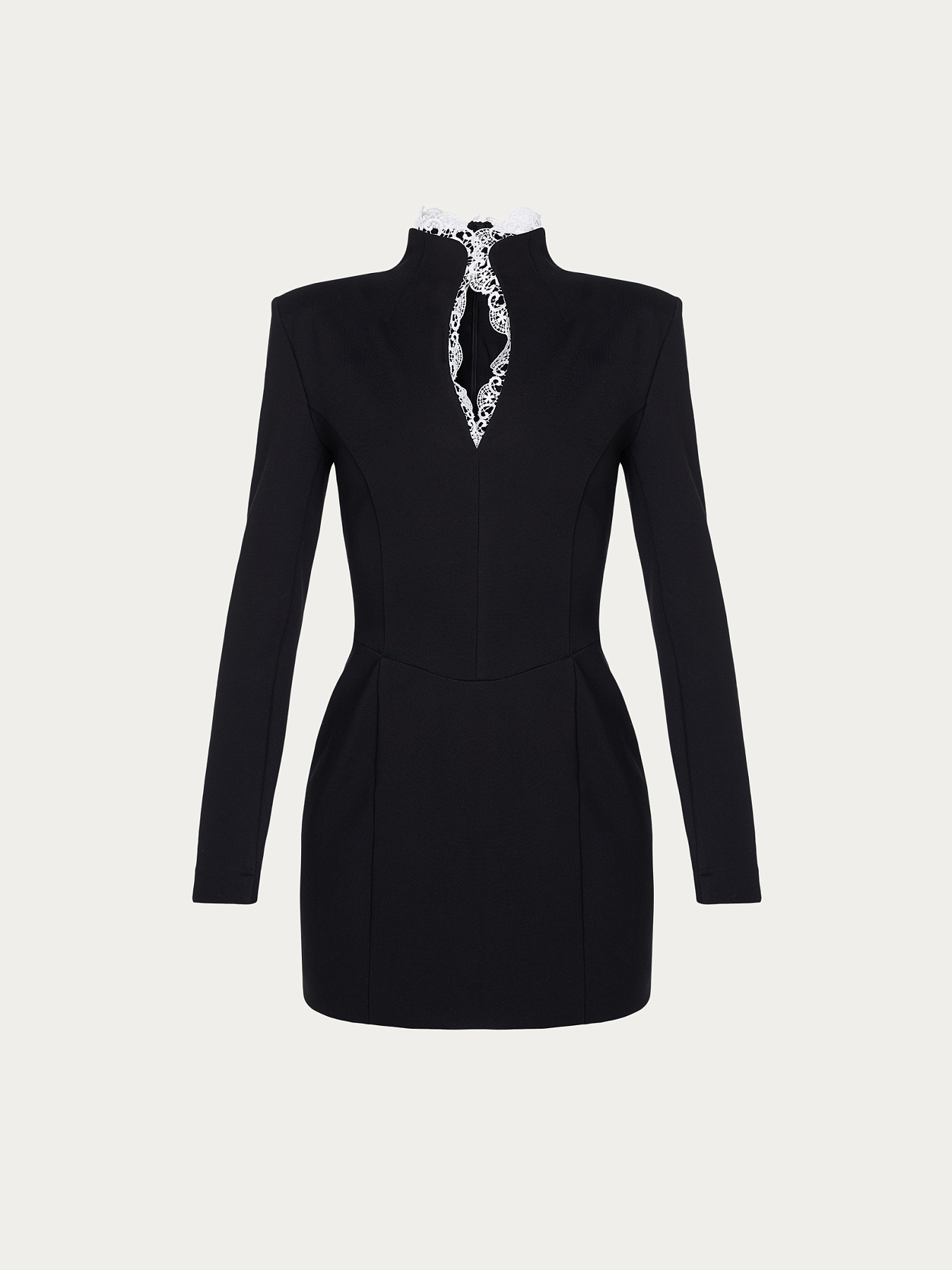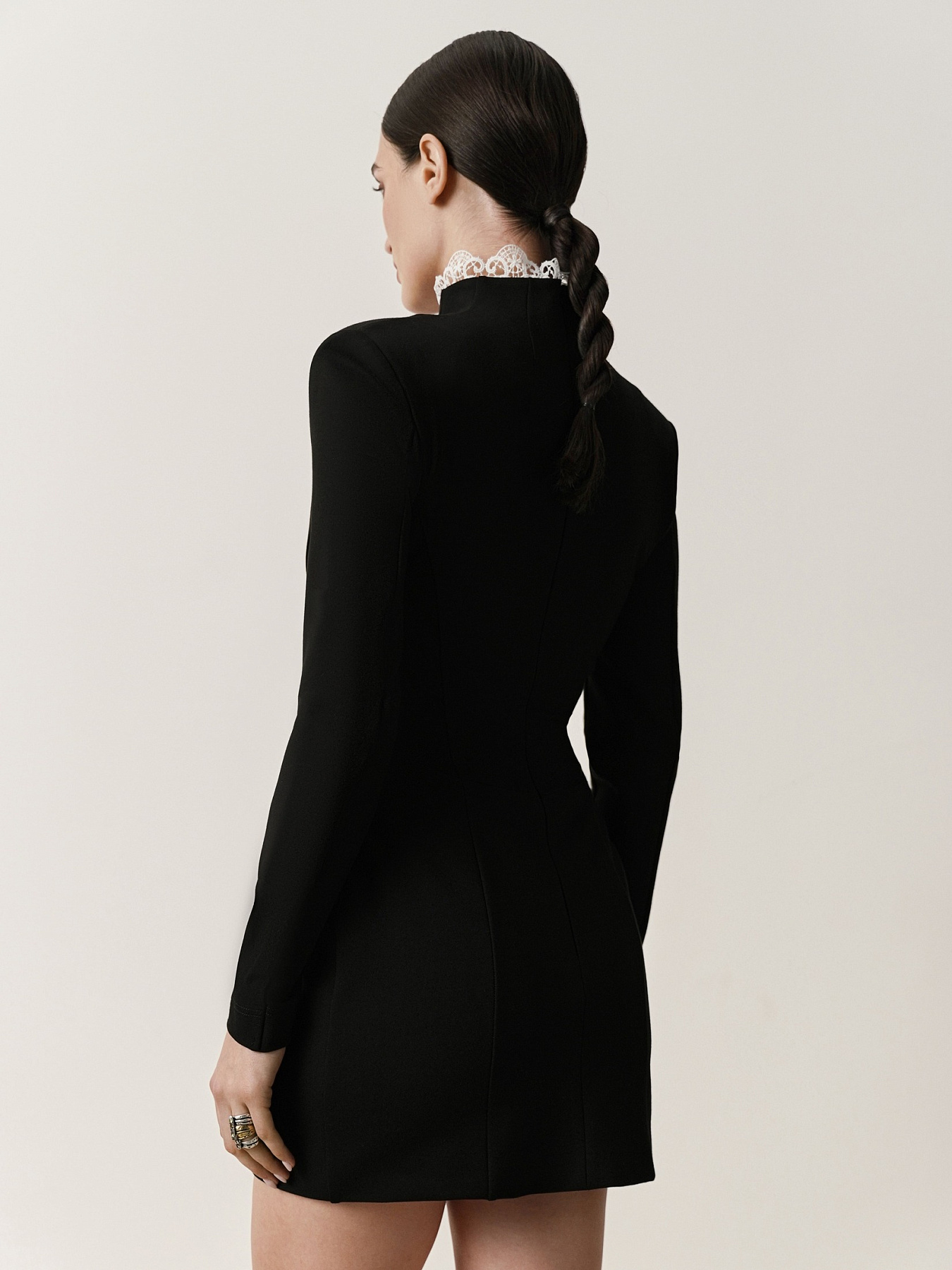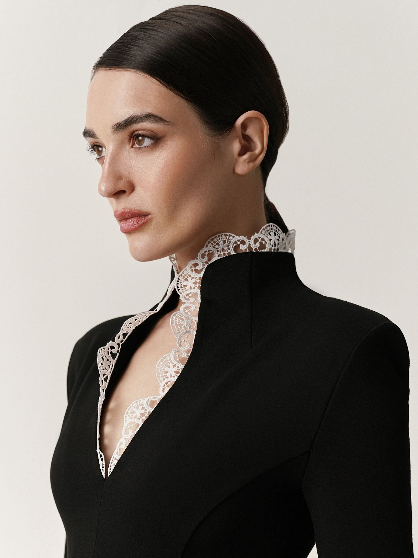 Вырез на уровне груди дополнен узкой полоской белого хлопкового кружева, создающей деликатный контраст. Цельнокроеный воротник-стойка и акцентированные плечи с подплечниками подчеркивают архитектуру образа. Отрезная линия талии формирует пропорции, удлиненные облегающие рукава завершают силуэт.