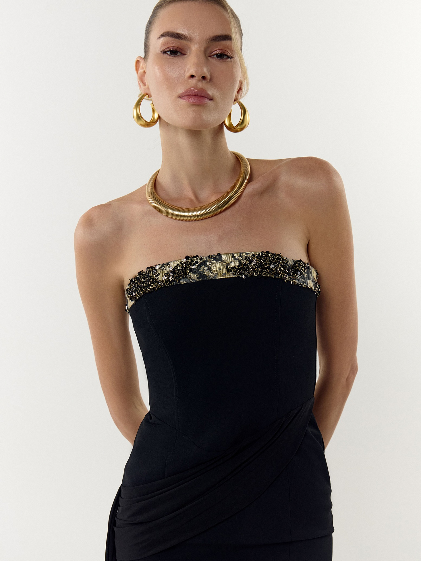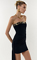Платье мини из итальянского вискозного крепа прилегающего силуэта. Прямой вырез декольте оформлен акцентной тесьмой из итальянской ткани с пайетками, расшитой золотистым бисером-стеклярусом — линия выглядит чисто, с деликатным блеском. Платье отрезное по талии, прилегание лифа обеспечивают рельефы с регилином. Изнутри по верхнему срезу вшита силиконовая тесьма, которая надёжно фиксирует платье и обеспечивает комфортную посадку.