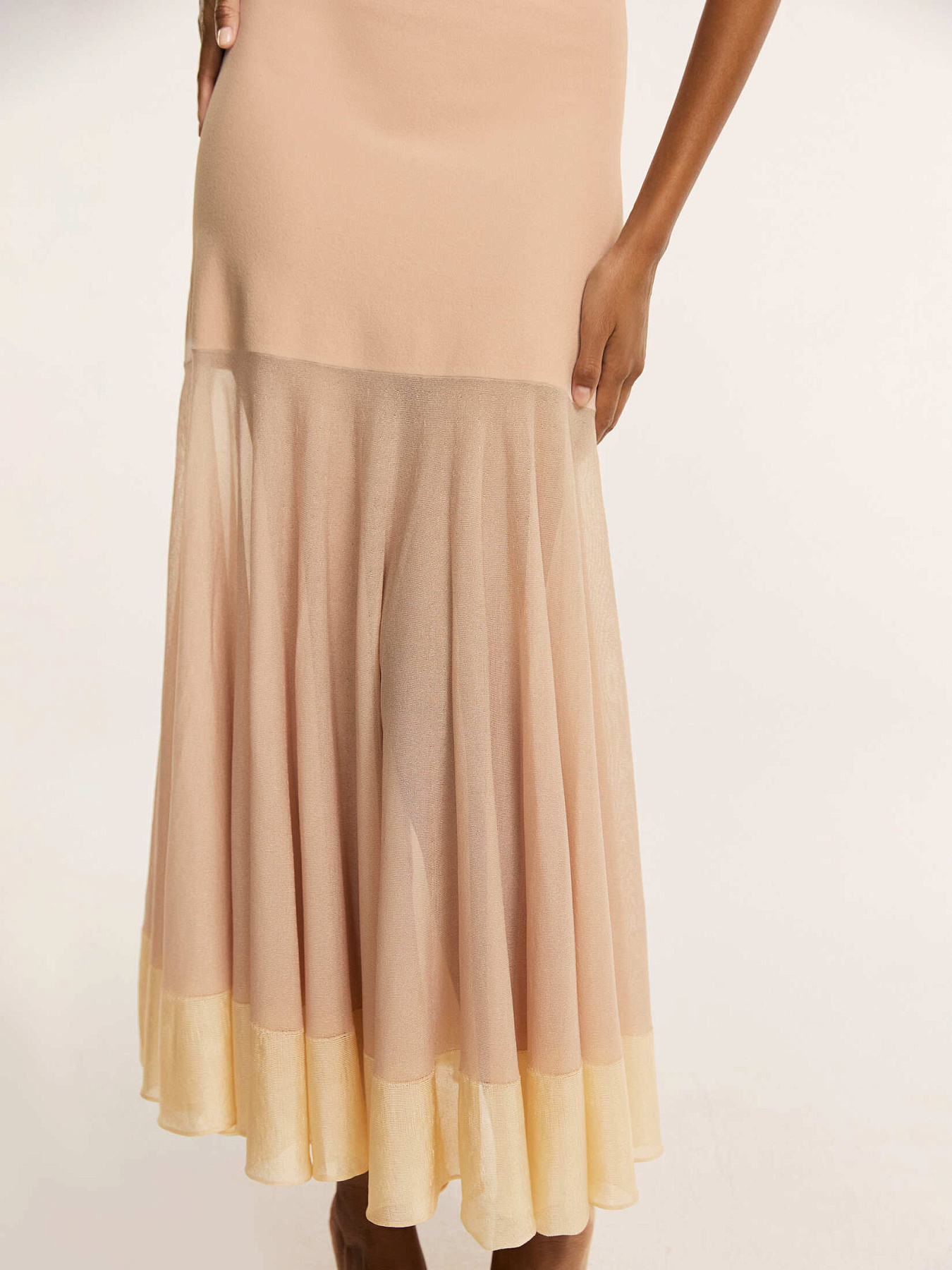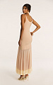 Платье макси на тонких бретелях в бежевом оттенке — модель, в которой три итальянские пряжи создают единый, многослойный силуэт.
