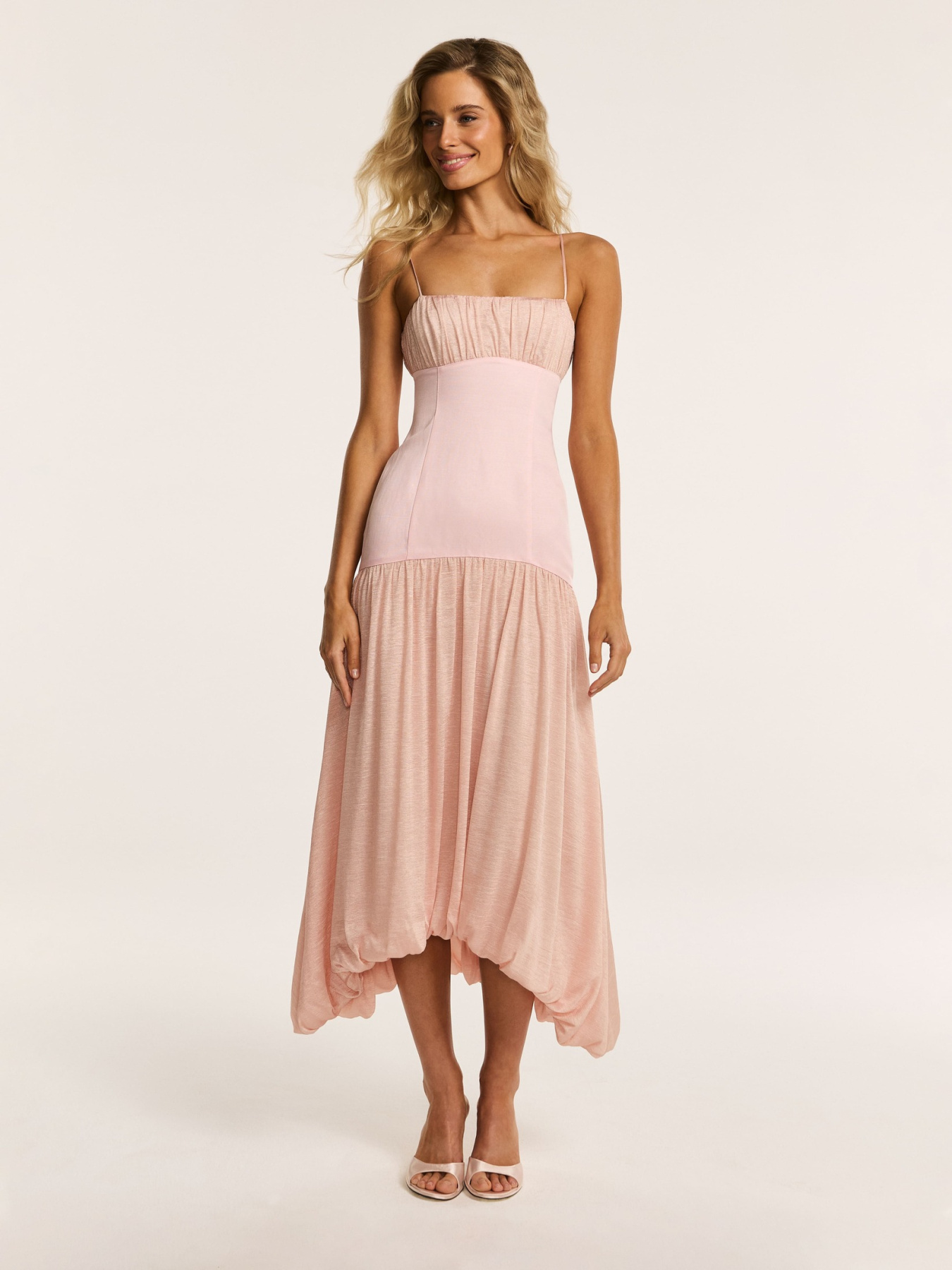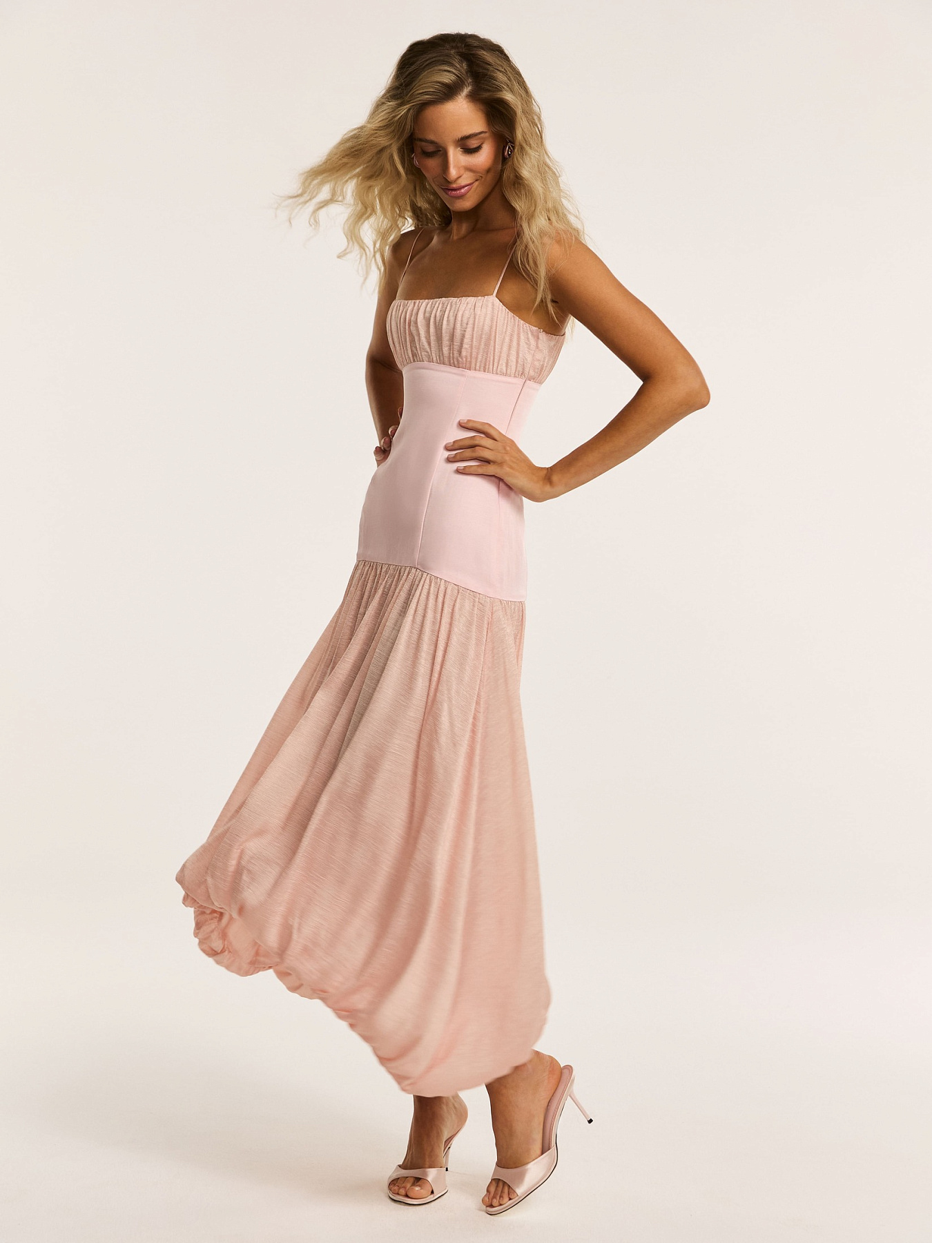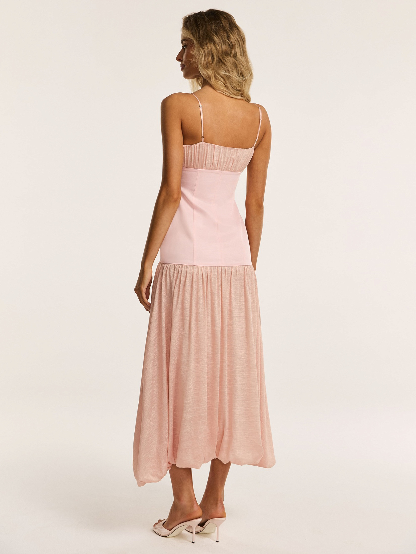 Платье миди в нежно-розовом оттенке — модель, в которой полупрозрачная вискоза и итальянский лён создают многослойный, живой силуэт.