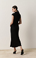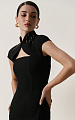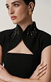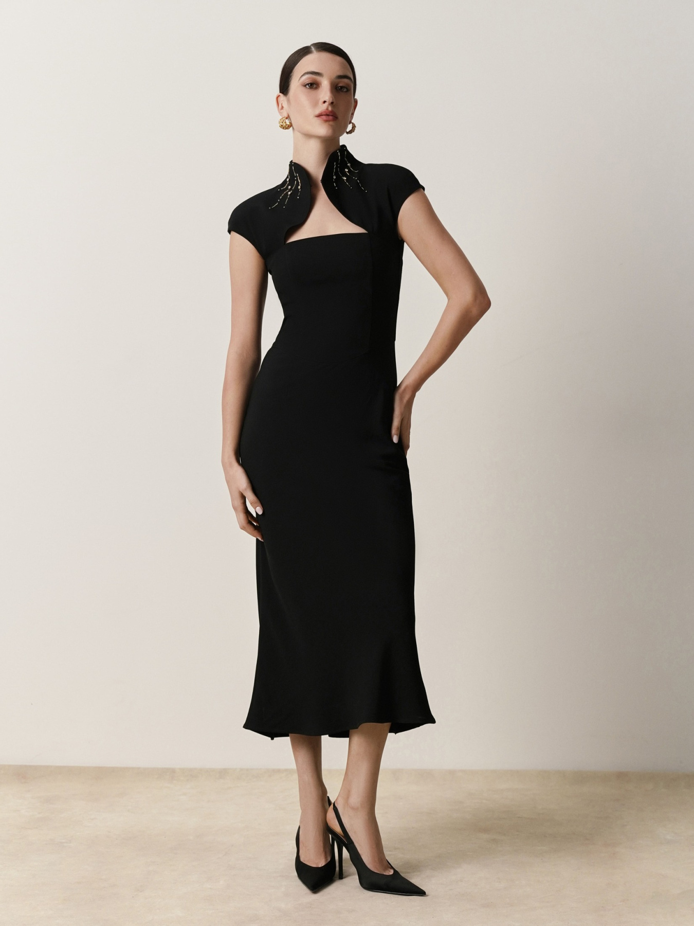 Платье миди из итальянской вискозы в креповом переплетении. Фигурная верхняя часть напоминает болеро с цельнокроеной стойкой и застежкой встык на черный металлический крючок. От верхнего среза расходится ручная вышивка из бисера и камней в золотистом оттенке — рисунок создан индивидуально под каждое изделие и выполнен вручную нашими мастерами.