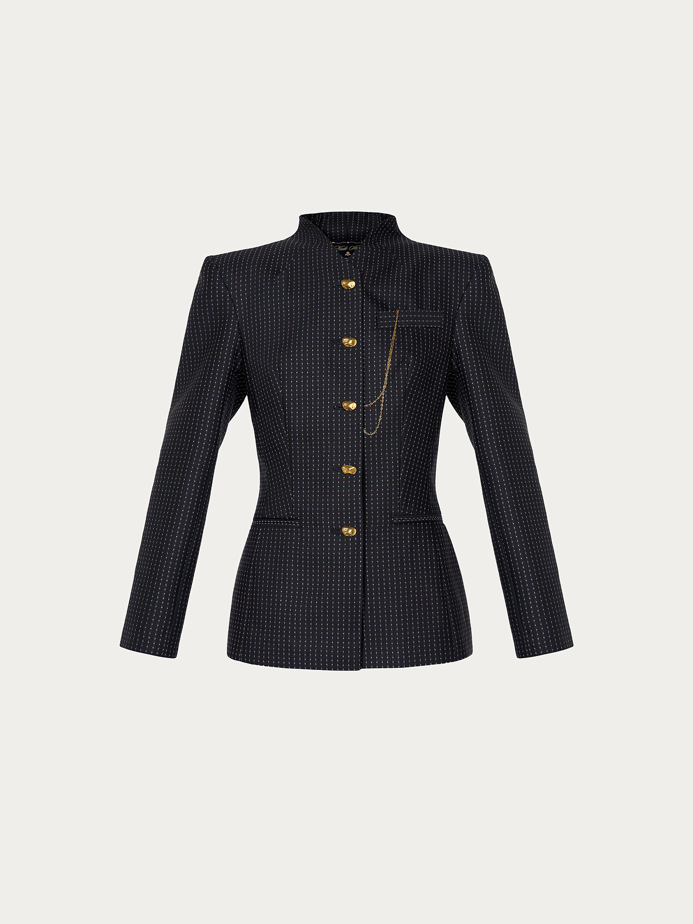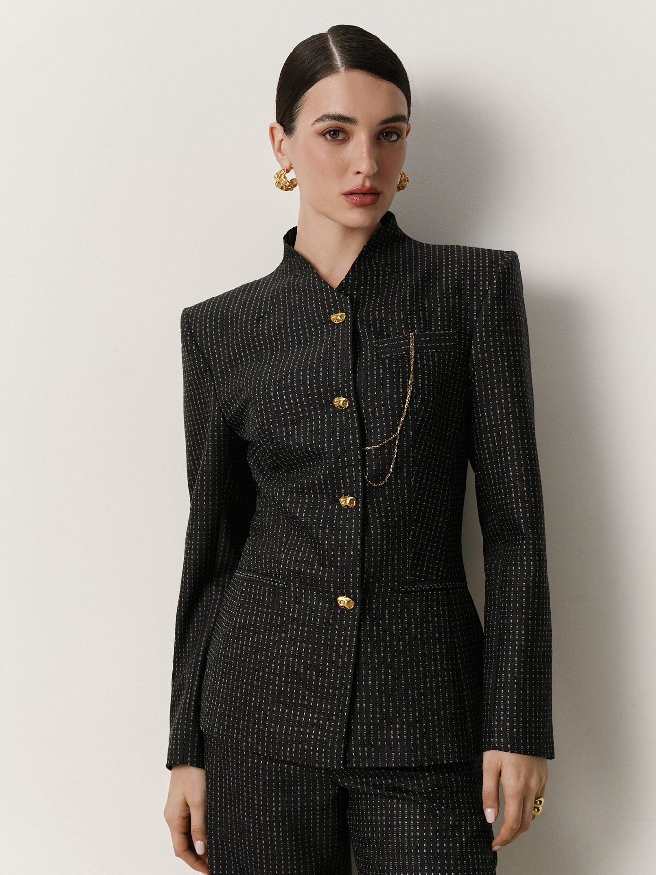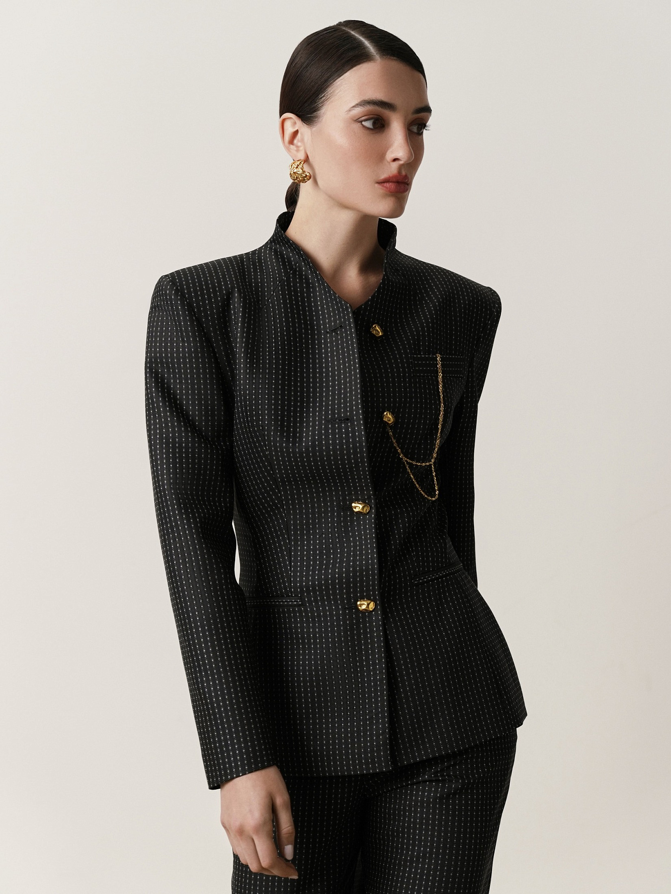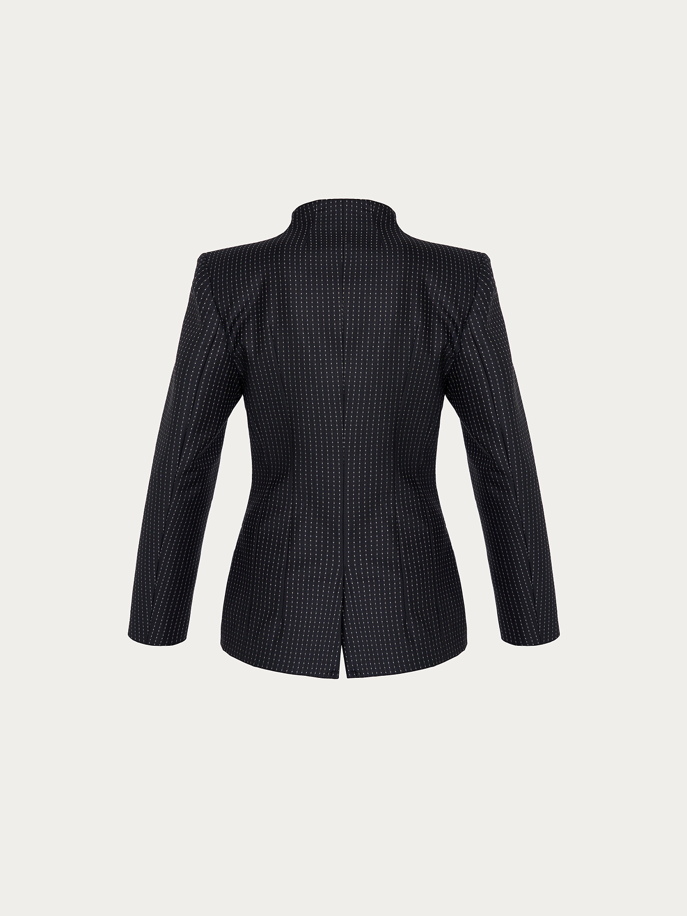 Жакет приталенного силуэта из итальянской шерсти в черном цвете с мелким белым орнаментом, образующим вертикальные полосы. Средняя длина модели подчеркивает талию, создавая графичный и собранный силуэт. Аккуратно выведенная линия плеча формируется за счет подплечников, цельнокроеный воротник-стойка завершает образ.