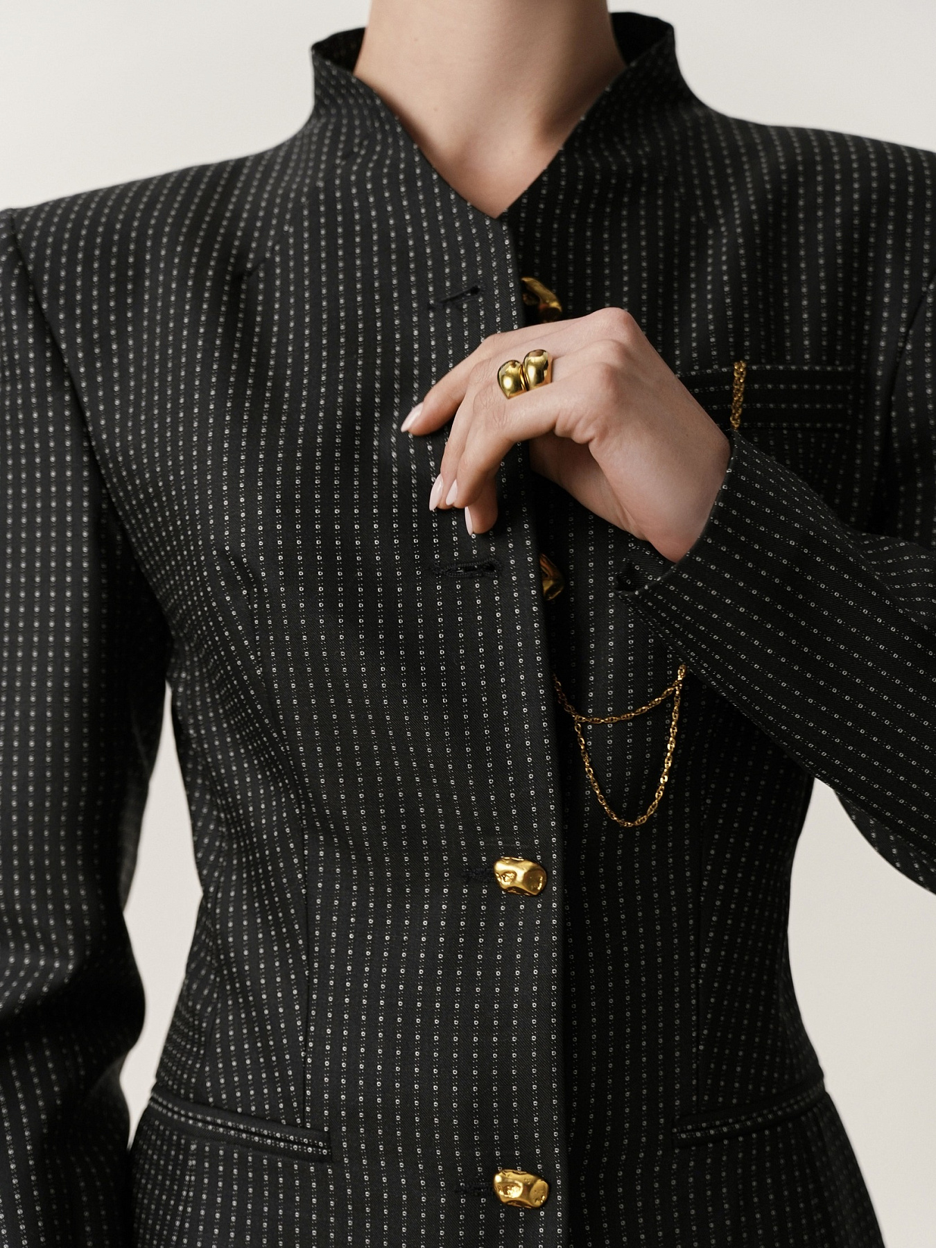 На уровне груди расположен аккуратный нагрудный карман, дополненный декоративной цепочкой на карабине, отсылающей к традиционным мужским часам на цепочке, которые носили в нагрудном кармане.
