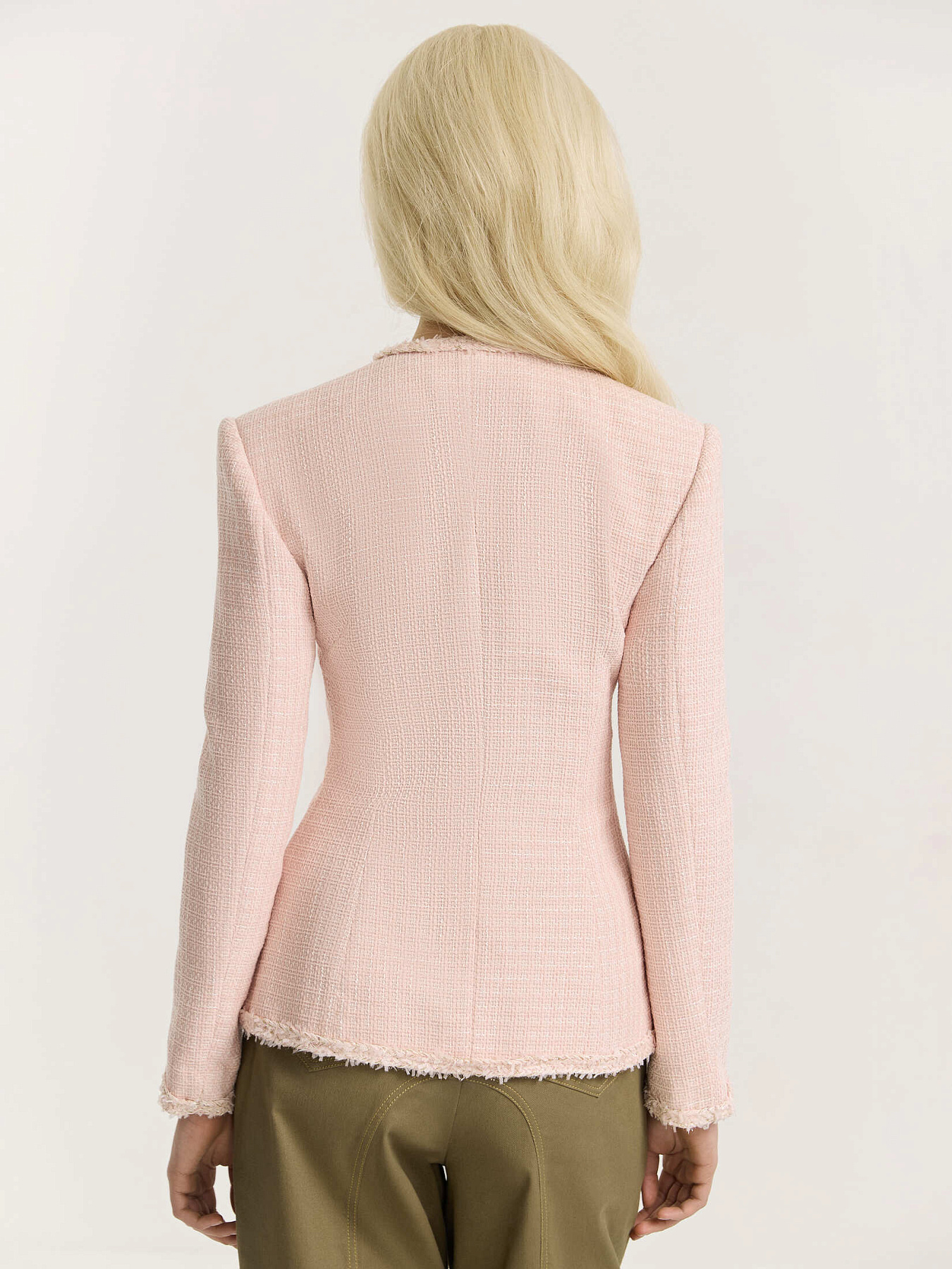 Жакет приталенного силуэта из итальянского твида. Фактурное переплетение нитей в розовой и белой гамме создает мягкую глубину и живую поверхность ткани.