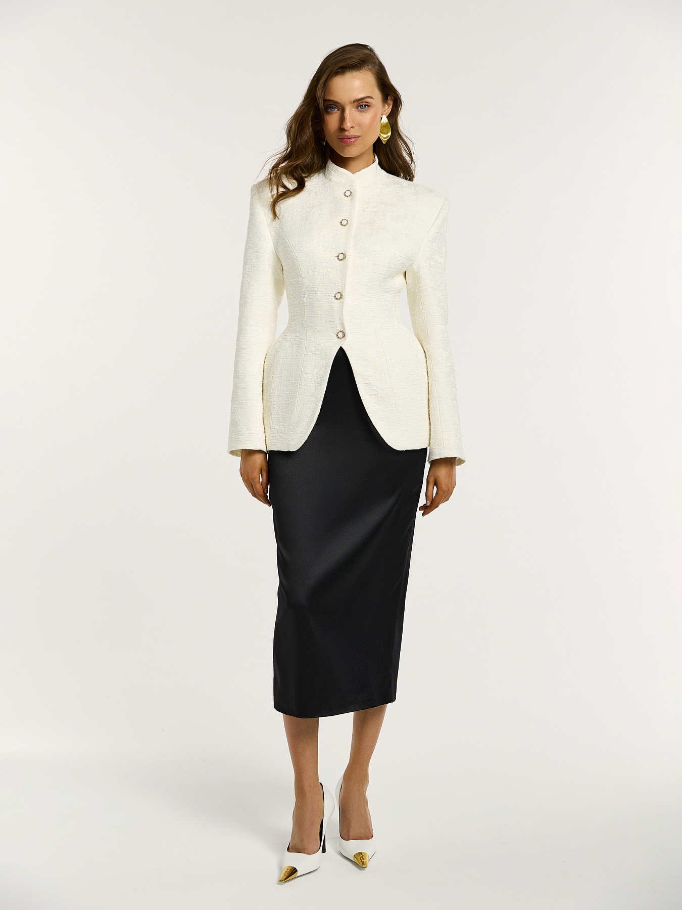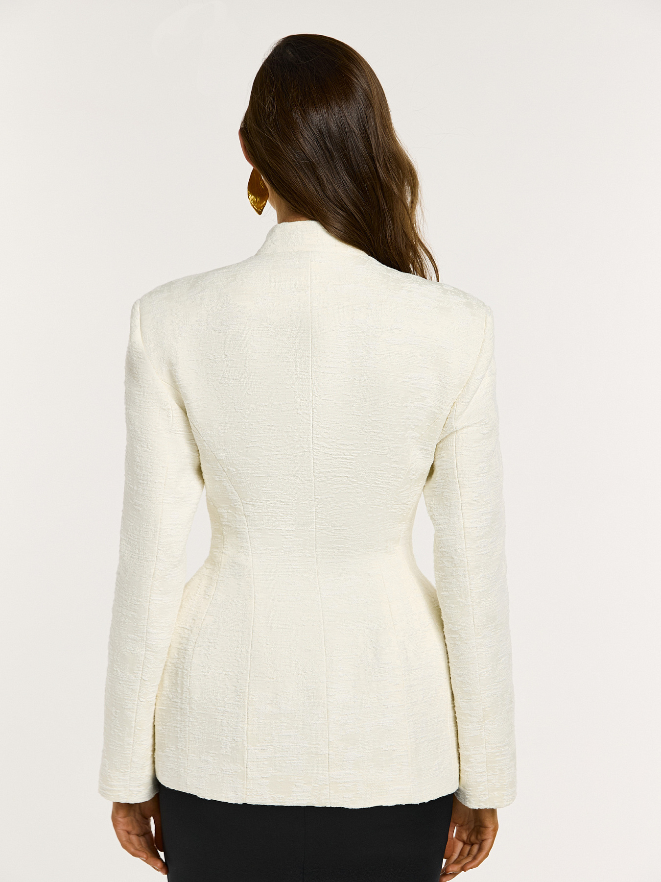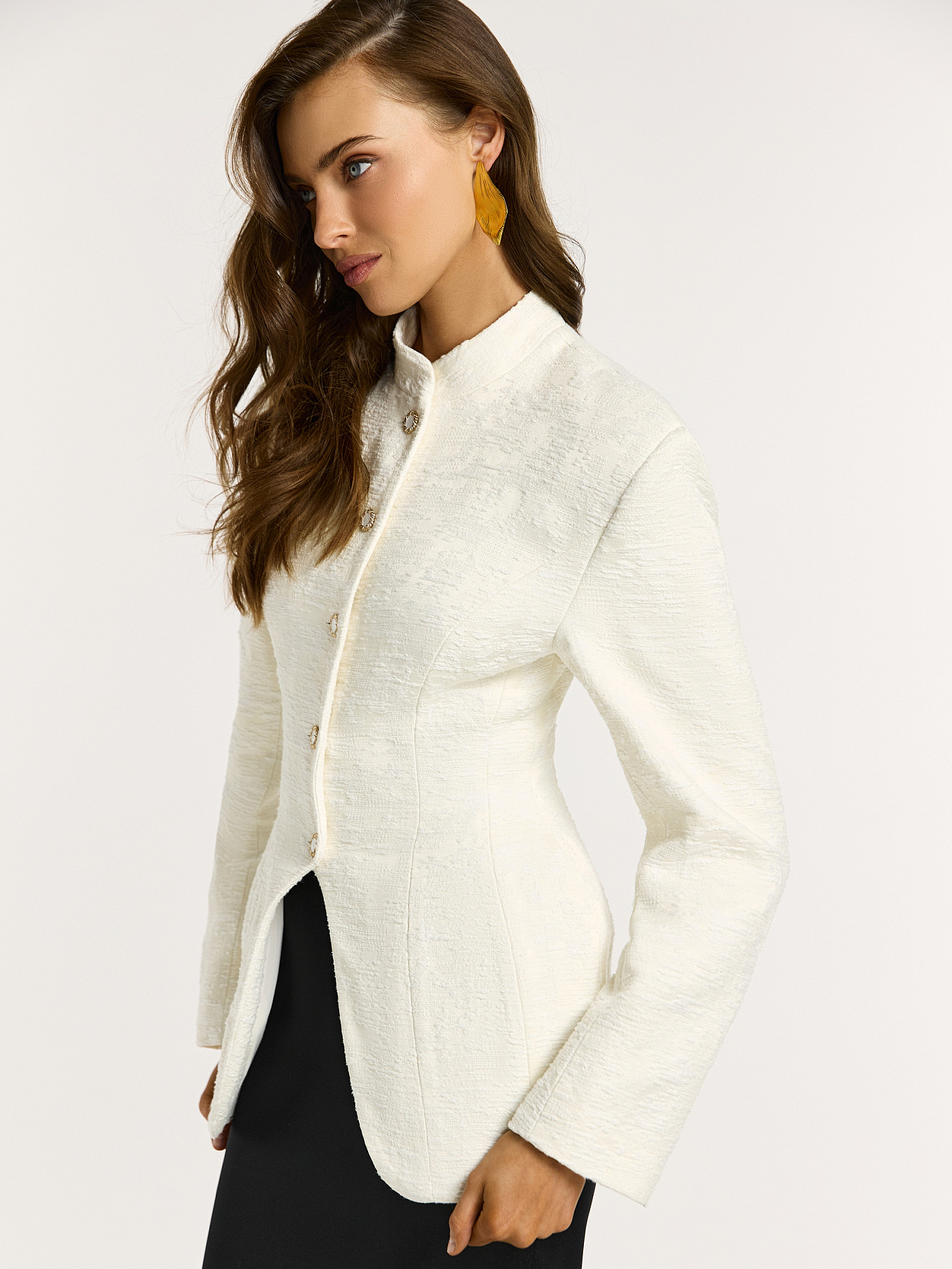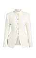 Жакет в молочном оттенке с металлическими пуговицами — изысканная модель с выразительной архитектурой силуэта и акцентом на фактуру.
