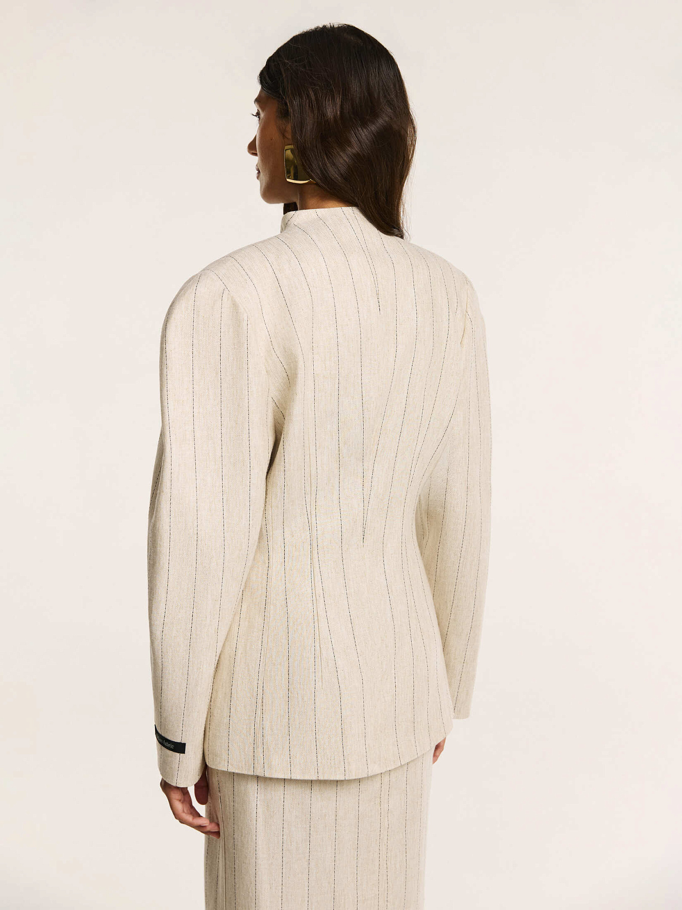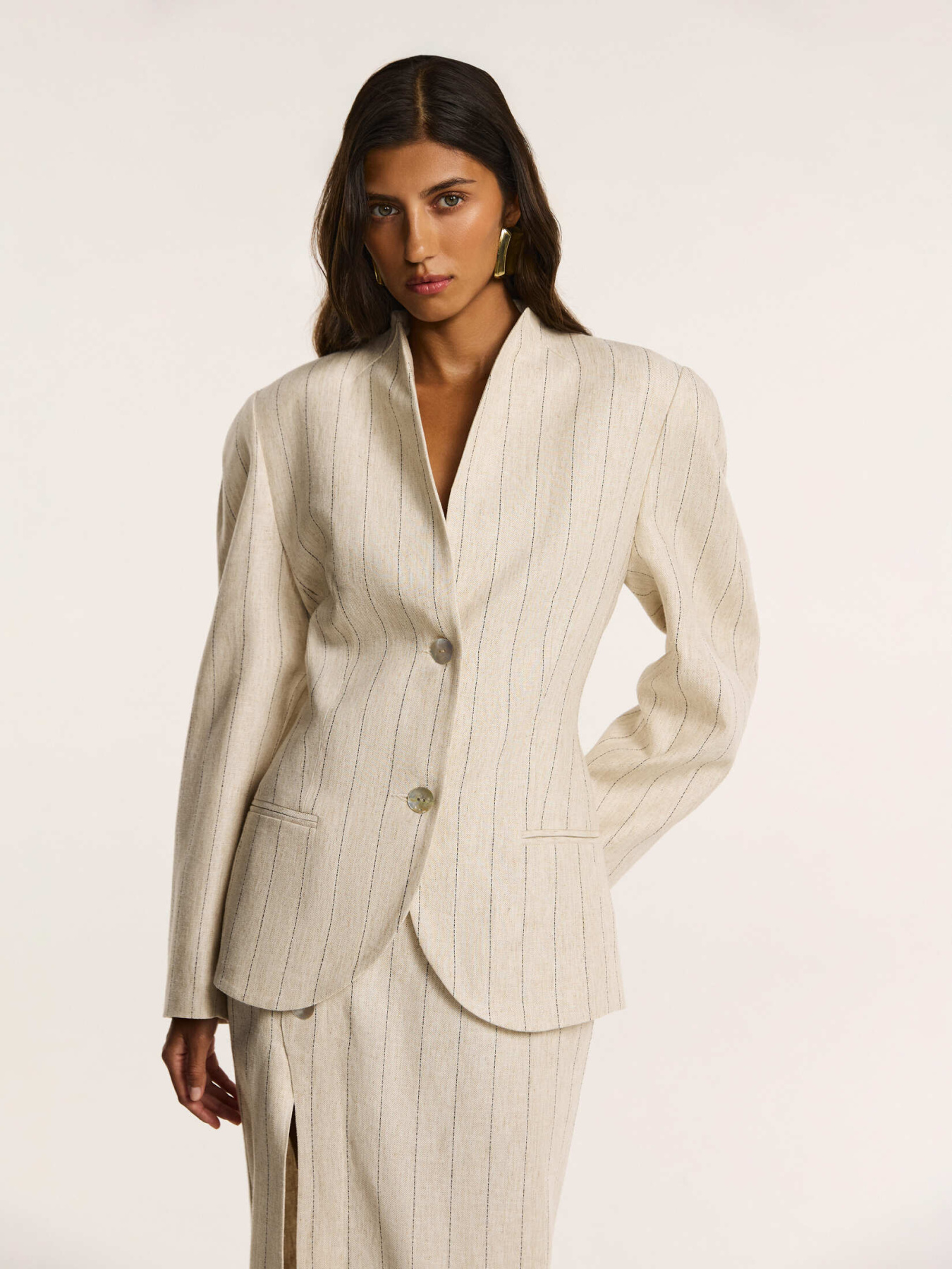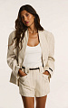 Жакет приталенного силуэта в благородном бежевом оттенке в полоску — летний костюм в его лучшем прочтении.