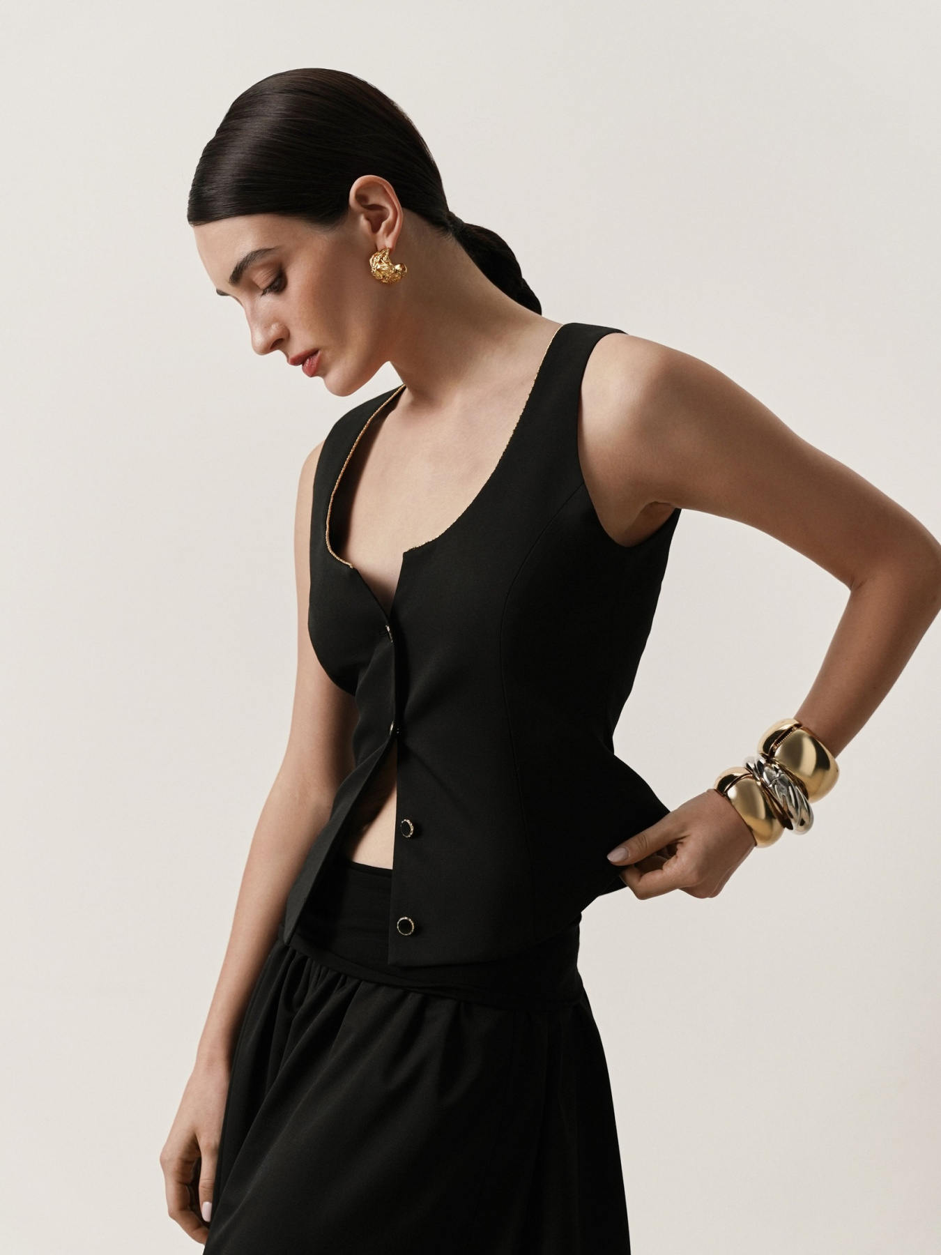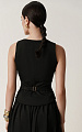 Жилет приталенного силуэта из итальянской костюмной шерсти. Глубокий округлый вырез горловины оформлен тесьмой из золотистого бисера, создающей мягкое сияние и деликатный акцент.