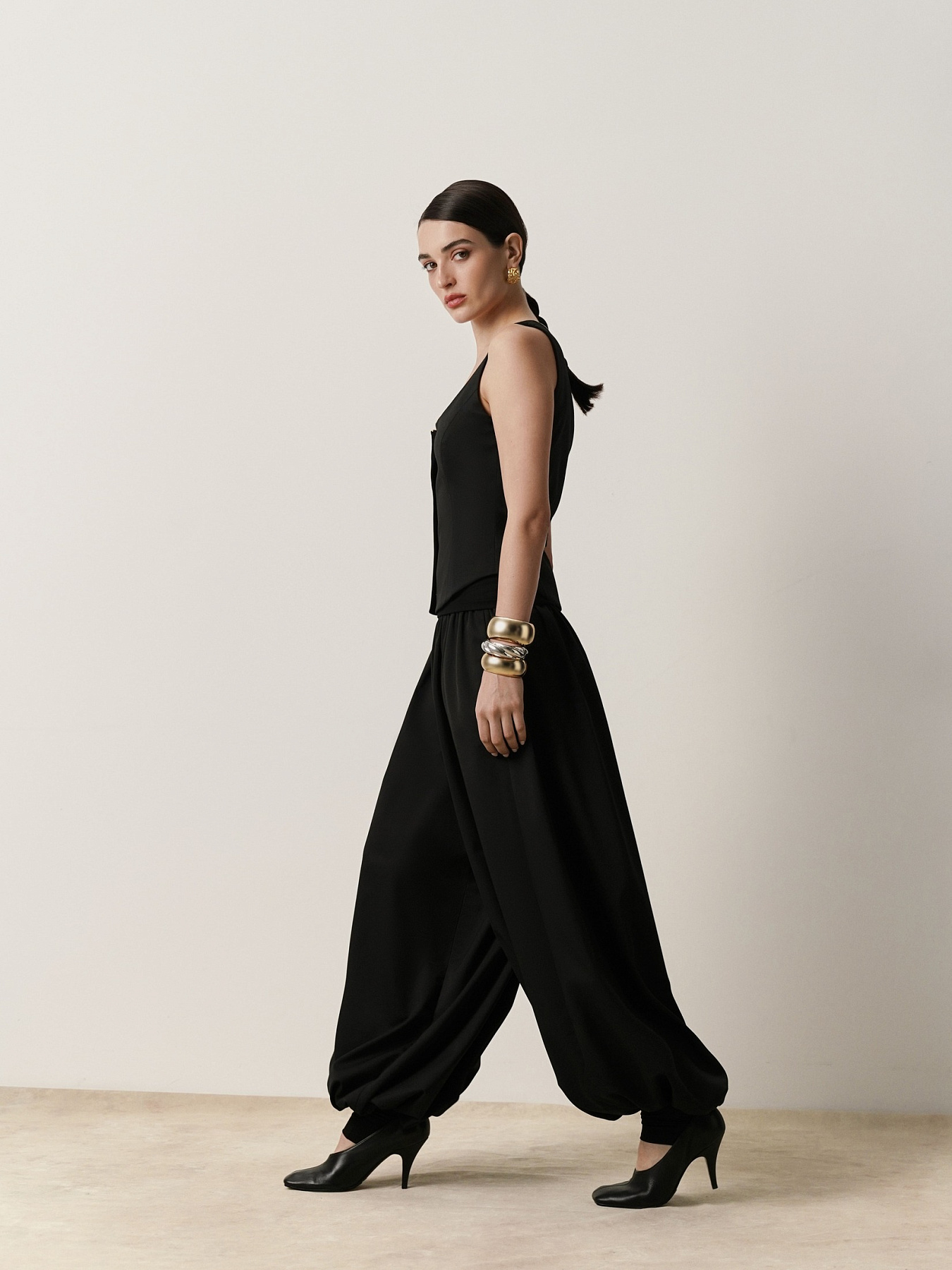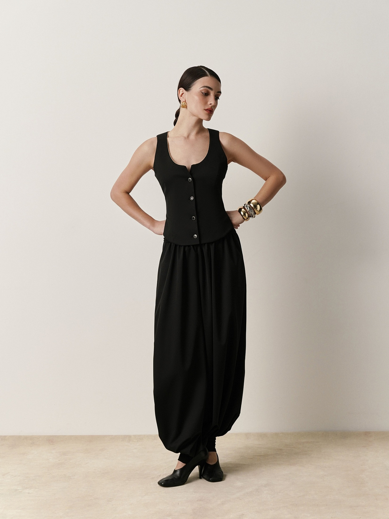 Жилет приталенного силуэта из итальянской костюмной шерсти. Глубокий округлый вырез горловины оформлен тесьмой из золотистого бисера, создающей мягкое сияние и деликатный акцент.