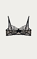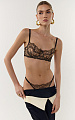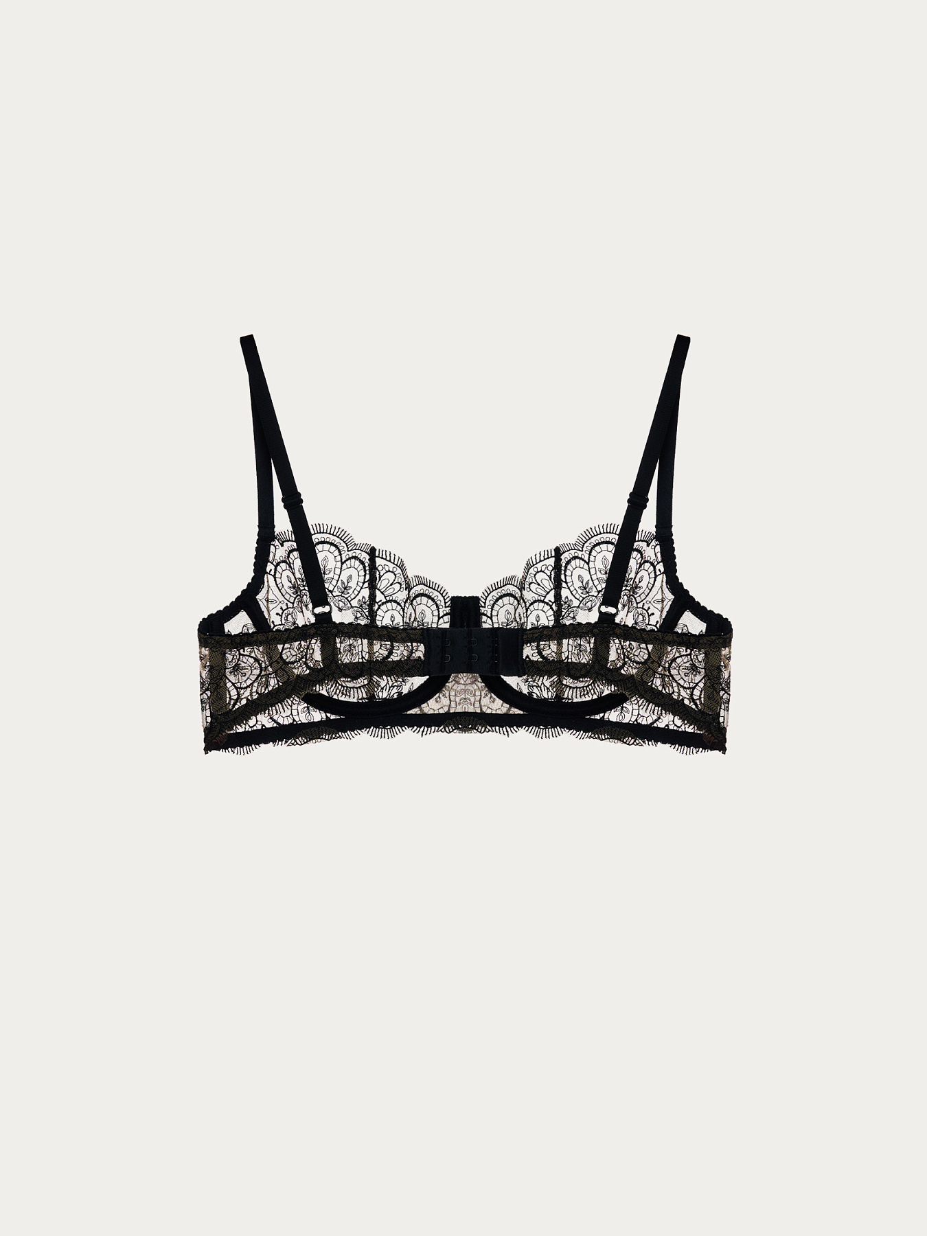 Бюстгальтер балконет на косточках с мягкими чашками из вышивки на телесной сетке. Благодаря такой основе черная вышивка выглядит особенно выразительно и становится главным акцентом модели. В центре лифа закреплён небольшой чёрный камушек, добавляющий деликатный блеск и подчёркивающий линию декольте.