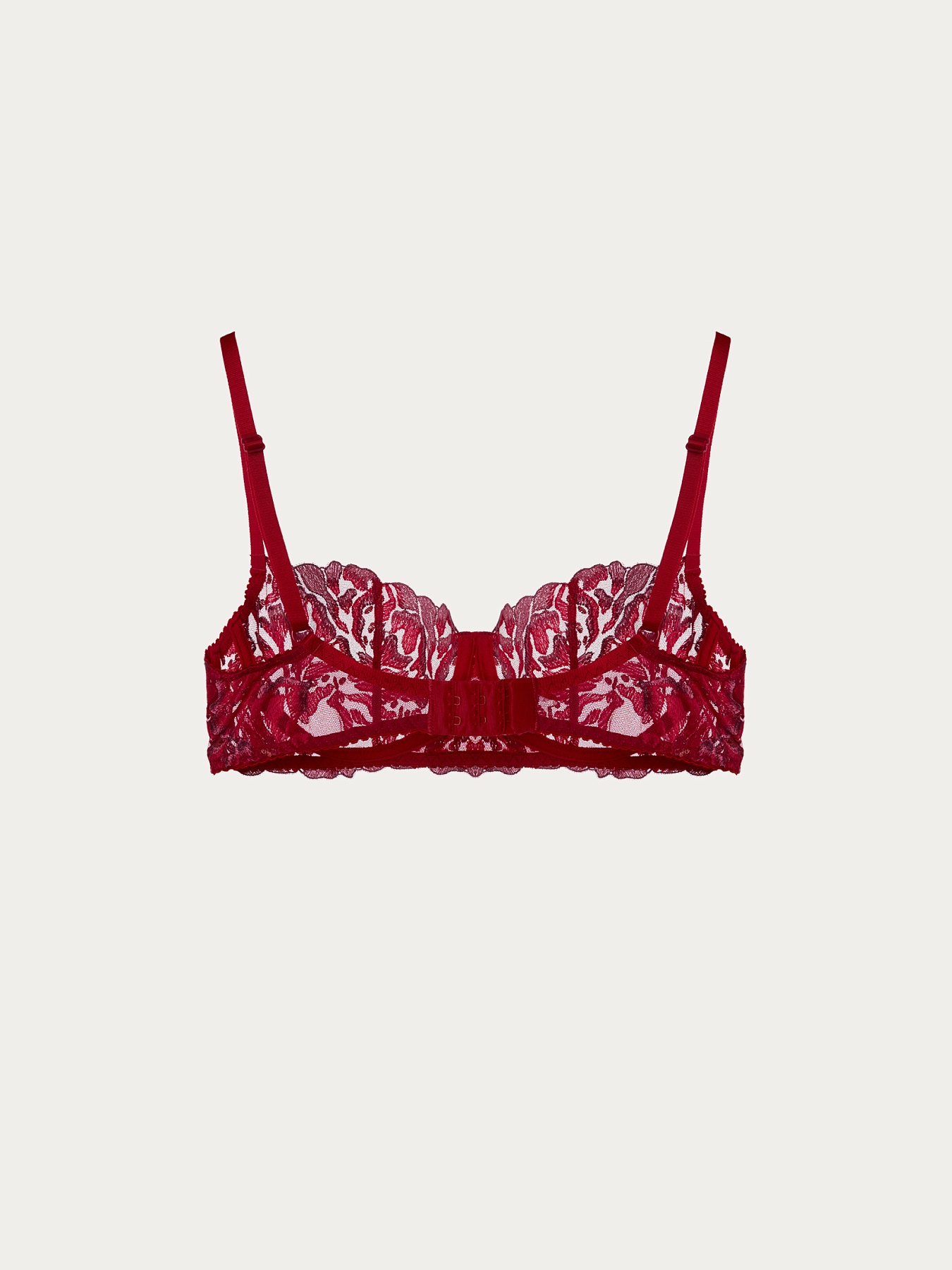 Бюстгальтер балконет на косточках с мягкими чашками из плотного итальянского кружева. В рисунке — изящное сочетание нескольких оттенков красного, в котором благодаря люрексовой нити по белью появляется мягкий мерцающий блеск, что делает изделие особенно насыщенным и утончённым.