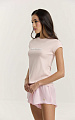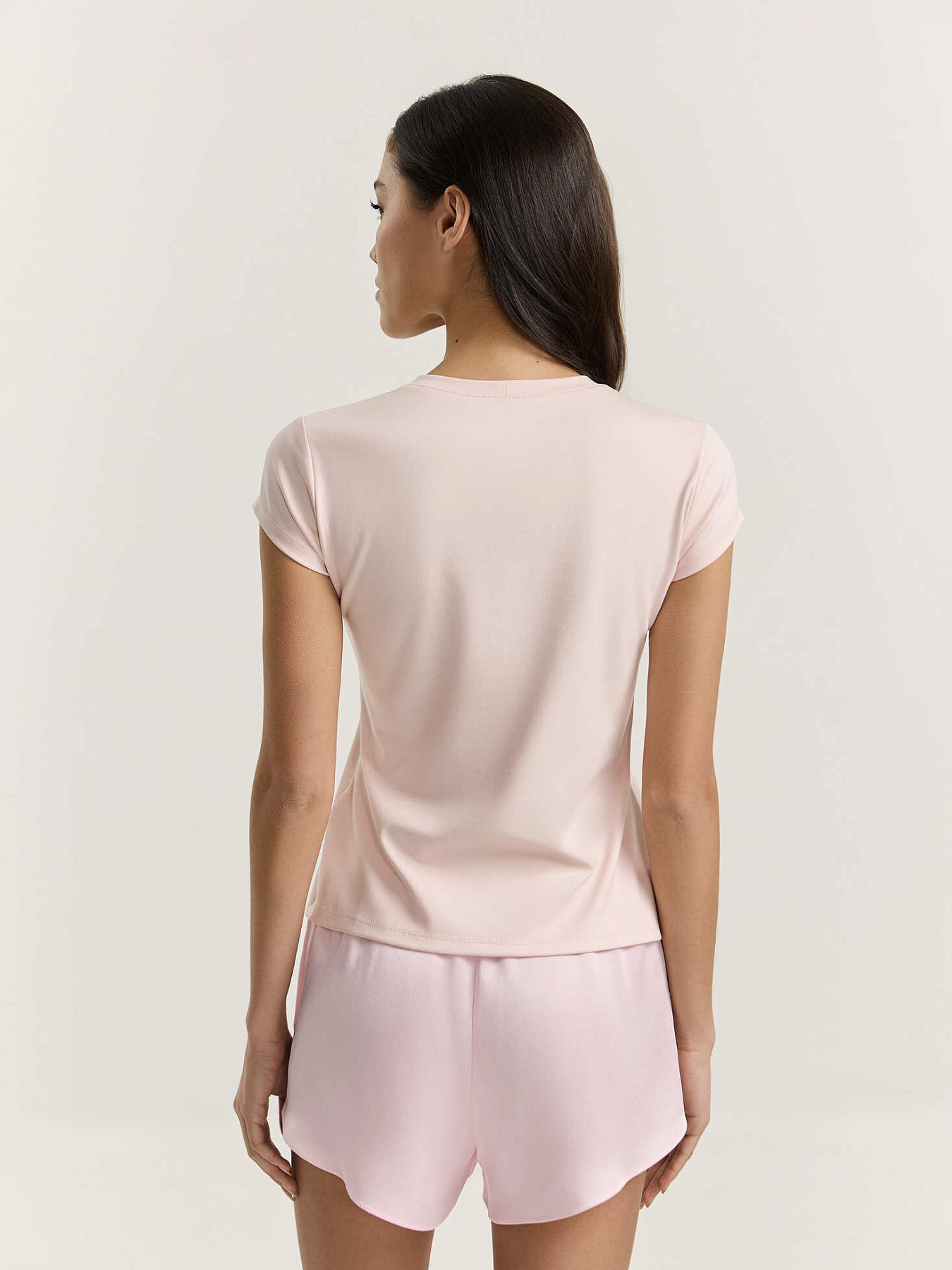 Футболка полуприталенного силуэта из мерсеризованного хлопкового трикотажа в нежно-розовом оттенке. Небольшой процент эластана обеспечивает комфортное прилегание и помогает изделию лучше сохранять форму. Укороченный рукав и средняя длина делают модель универсальной для повседневных сочетаний.