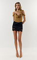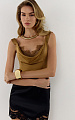 Корсет из итальянского вискозного кади в благородном бронзовом оттенке с мягким золотистым отливом. Центральная часть лифа плотно прилегает по талии и груди, а верхняя линия собирается в аккуратную качель, создавая мягкий объем.