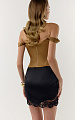 Боковые узкие рельефные вставки переходят в широкие бретели, которые надежно фиксируют корсет на фигуре и формируют чистый, графичный силуэт. За драпировкой, внутри лифа, расположена вставка из кружева шантильи в бронзовом оттенке с легким золотистым блеском — деликатный скрытый акцент, видимый только в движении.