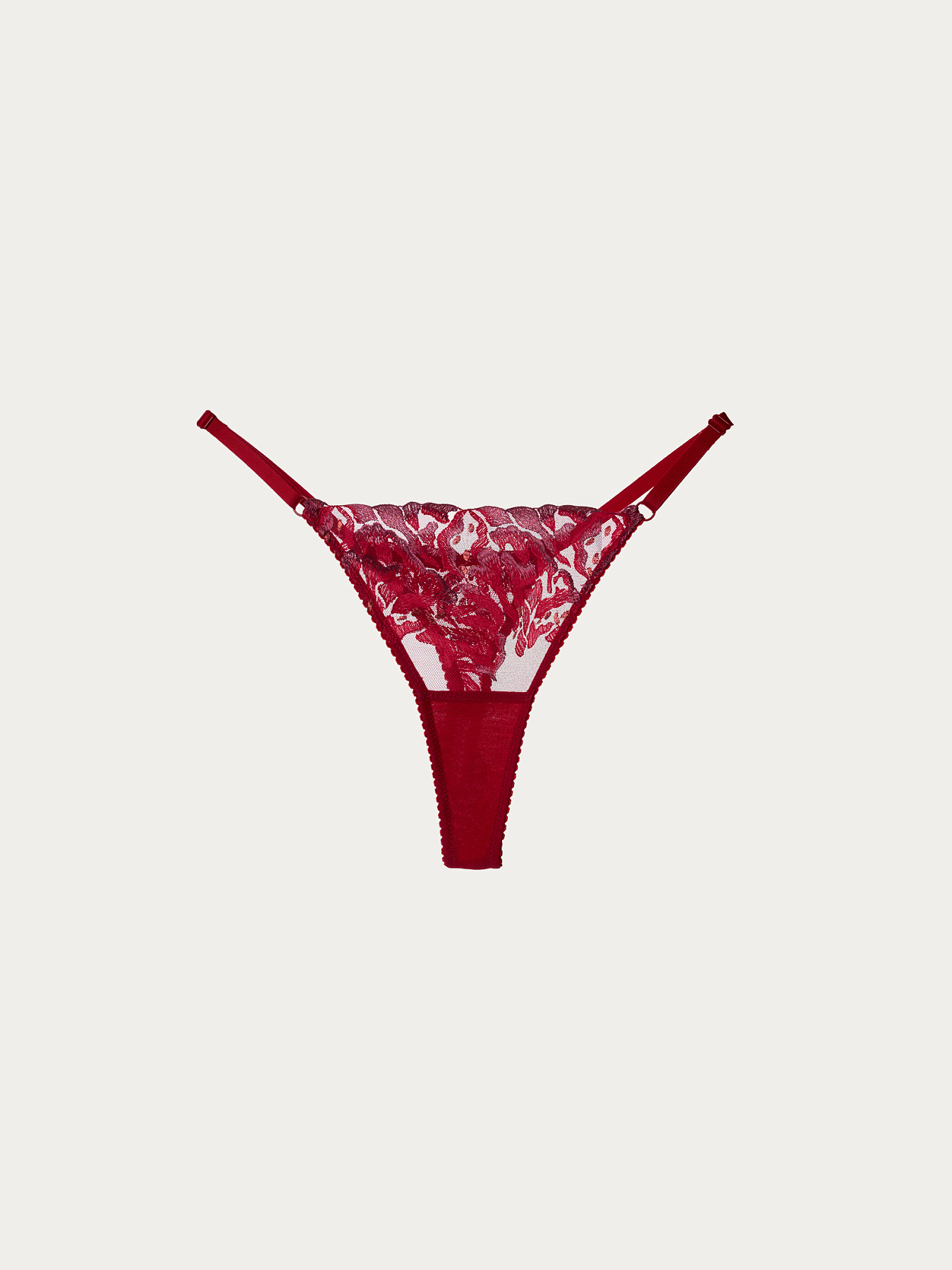 Стринги из итальянского кружева с регулируемыми боковыми элементами — посадку можно настроить под себя, сохраняя комфорт и аккуратную линию по бедру. Кружево выполнено с люрексовой нитью, благодаря чему изделие мягко мерцает и выглядит особенно изысканно. Модель дополнена хлопковой ластовицей, что делает её мягкой и удобной для повседневного ношения.