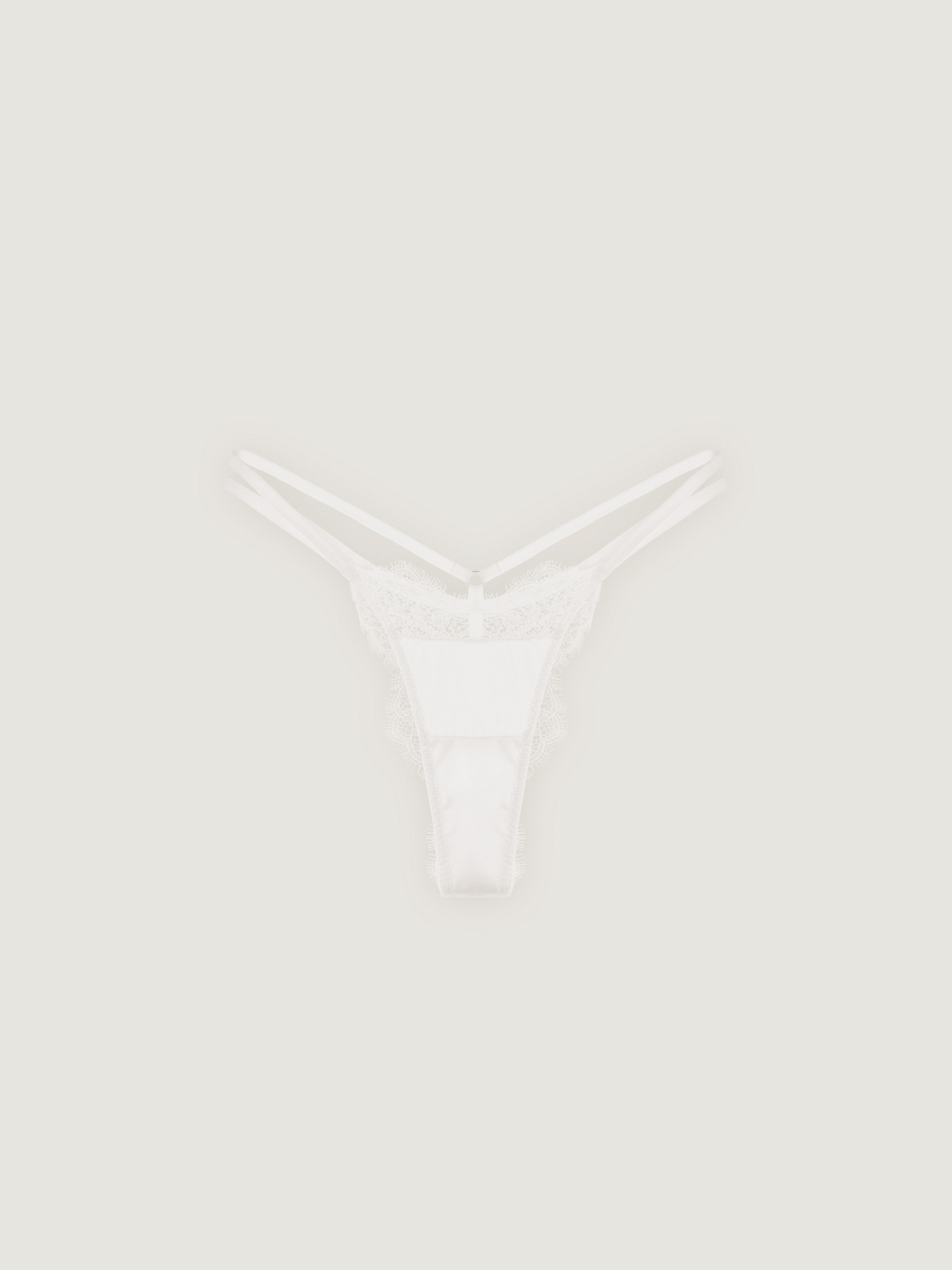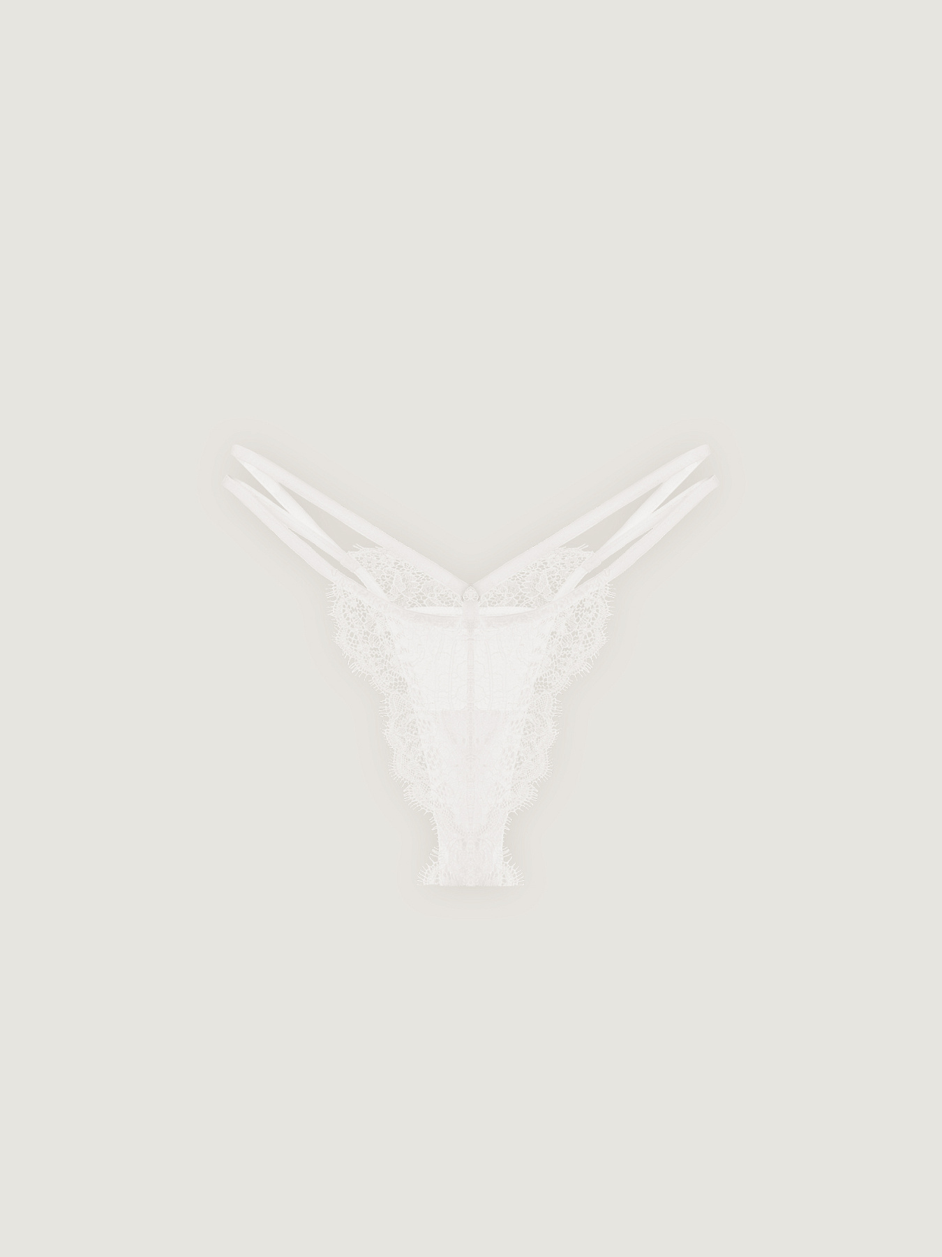 Стринги из тонкого итальянского кружева с двойными эластичными резинками. Легкие и деликатные по ощущениям: резинки не давят и мягко повторяют линию тела, обеспечивая аккуратную посадку.