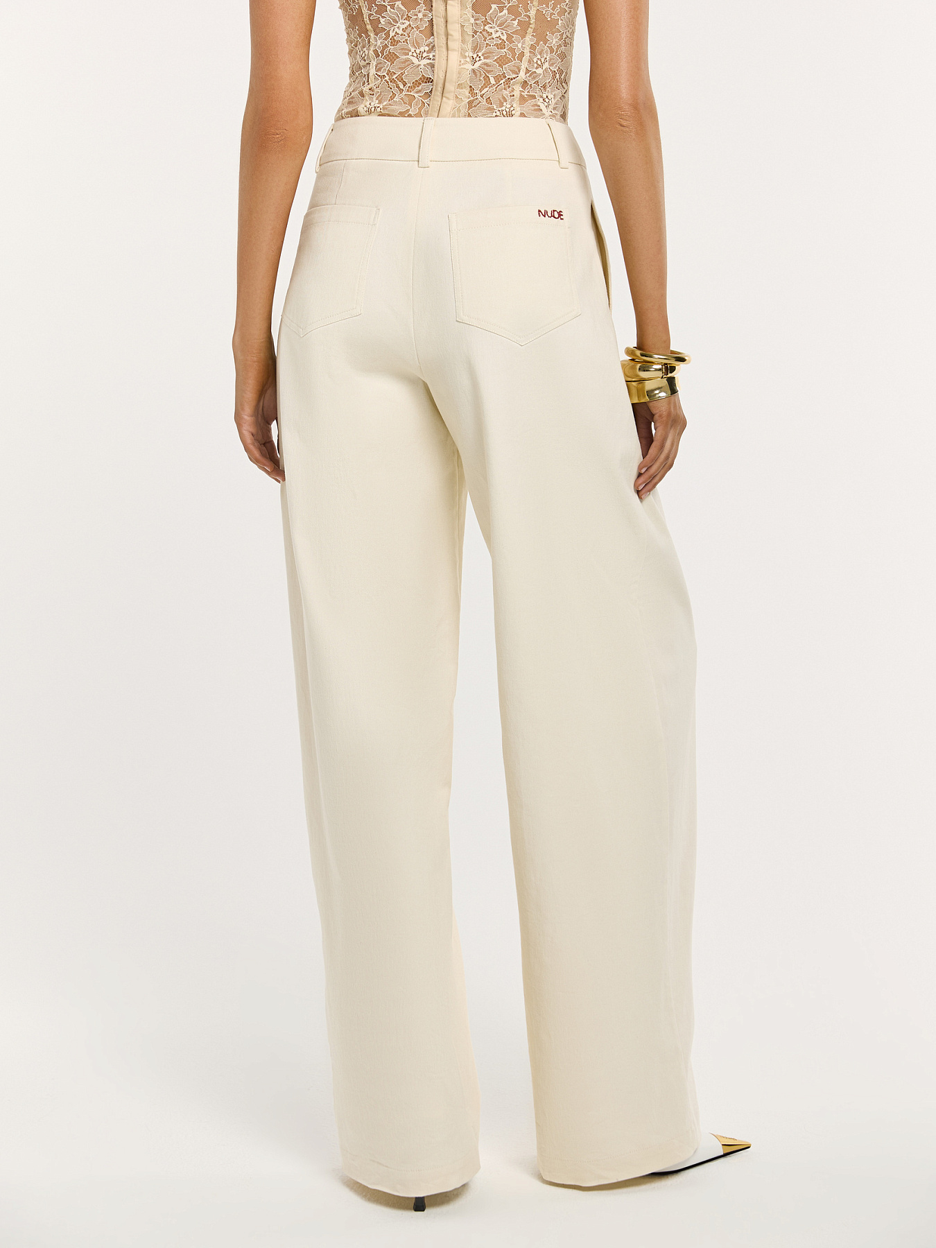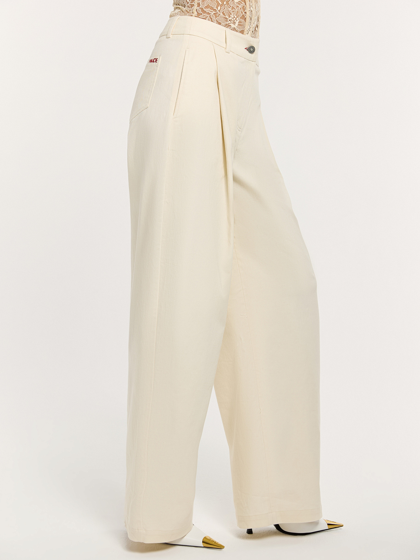 Брюки объёмного силуэта в молочном оттенке — современная интерпретация базовой модели с акцентом на форму и безупречную проработку деталей.