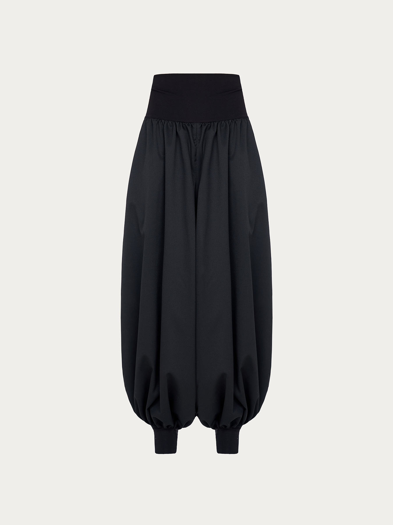 Брюки объемного кроя из итальянской костюмной шерсти. Благодаря сборке по верхнему и нижнему срезам создается характерный объем, при этом силуэт остается легким и пропорциональным.