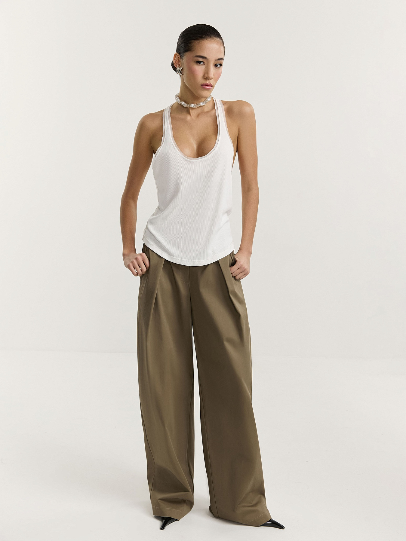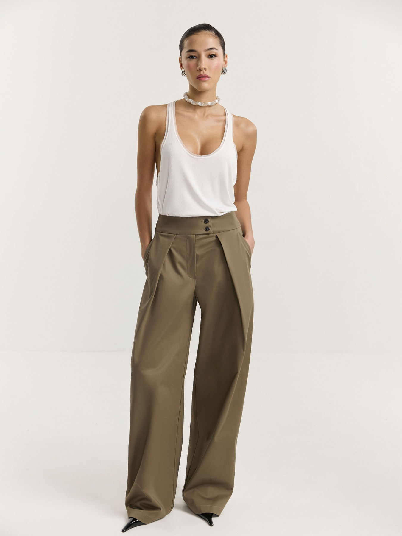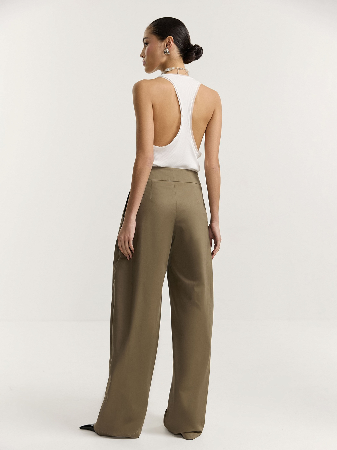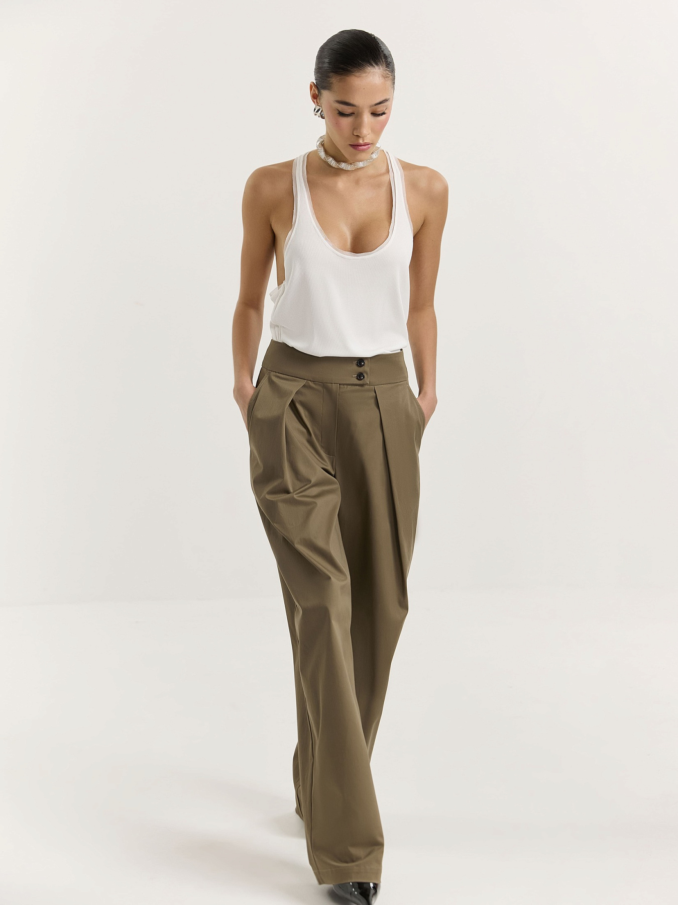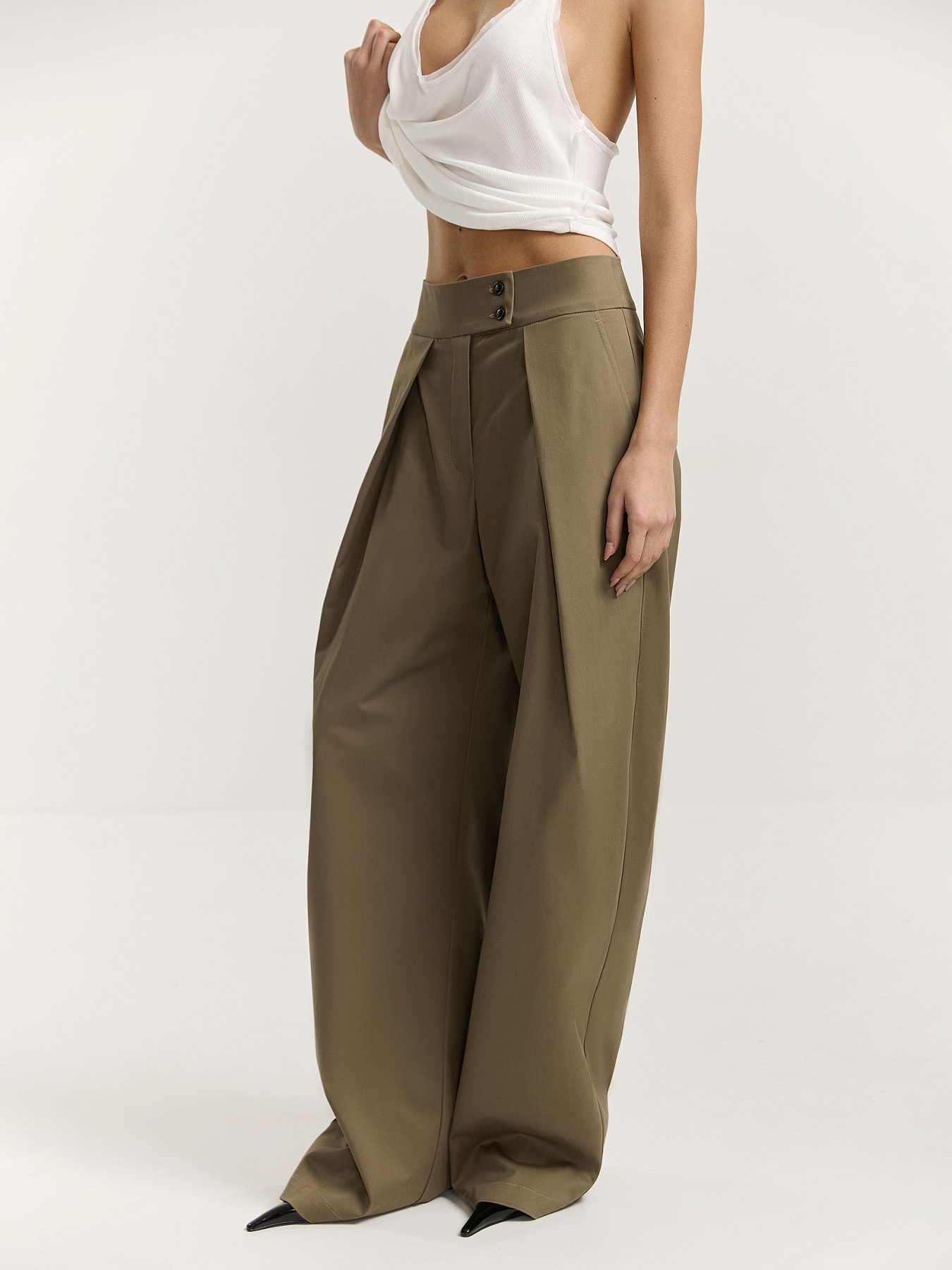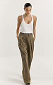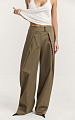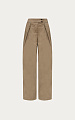 Брюки свободного кроя с округлой линией силуэта. Модель построена на контрасте архитектурного объема и точной посадки: глубокие складки по линии талии развернуты внутрь, благодаря чему формируется выразительная форма, остающаяся легкой и собранной.